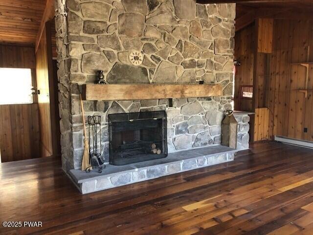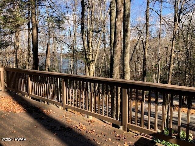 Desirable ''Pennwood on the Lake'' community with a Boat Slip is where you will find this 2nd Tier home within walking distance to the lake. The 1st Floor offers 2 Bedrooms, 1 Bath, spacious eat-in-kitchen with custom stone FP, Living Room with additional custom stone FP, Sliders opening onto a 10'x24' Deck with seasonal Lake Wallenpaupack lake views, wood floors, vaulted wood T&G ceiling and exposed beams. Walk across the road to the Pennwood private beach and nearby boat slip. The Lower Level is unfinished BUT all rooms have studded walls and electric wiring, concrete floor, wood T&G ceiling with exposed beams. The rooms include 2 Bedrooms, 1 Bath, Laundry Room with sink, Den with custom floor to ceiling stone FP and Double sliders leading to the Lower Deck. Also includes a detached storage shed for those extra's.