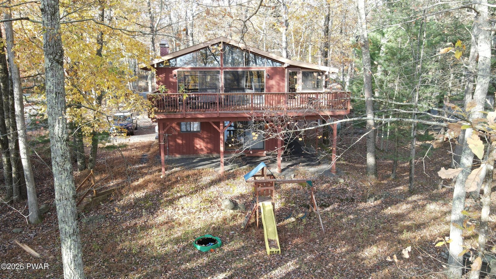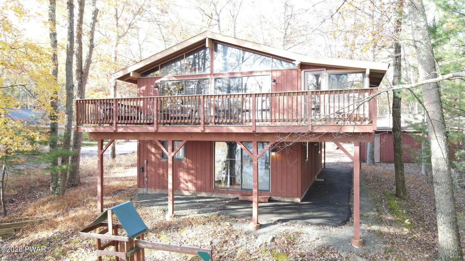 Lakefront Living on Desirable Elm Beach Lake !!Welcome to this beautifully positioned lakefront home on highly sought-after Elm Beach Lake, offering an exceptional location near the corner of the lake with convenient access to the community beach area. A long private driveway leads to a spacious two-car garage, providing both privacy and ample parking. This well-maintained home features 3 bedrooms and 2 full bathrooms, thoughtfully designed to maximize comfort and functionality. The lower level offers two bedrooms, a recently updated full bath, and a generous family room with direct walk-out access to the lake--perfect for entertaining guests or enjoying lakeside living. The main level showcases a bright, open-concept layout with a kitchen and living area highlighted by scenic lake views. The primary bedroom and full bath are also located on this level, along with a cozy dining area and a heated sunroom that opens to a large deck--ideal for outdoor entertaining or relaxing while overlooking the water. Additional features include warm tongue-and-groove ceilings, a classic brick fireplace, and a whole-house generator, offering charm, comfort, and year-round peace of mind. For those looking to add their own personal touch, hardwood flooring is located beneath the carpeting on the main level, providing an excellent opportunity to enhance the home's natural character. Whether you are seeking a full-time residence or a weekend retreat, this lakefront property presents a wonderful opportunity to enjoy the best of Pocono living. Come enjoy your life in this full amenity Community!!