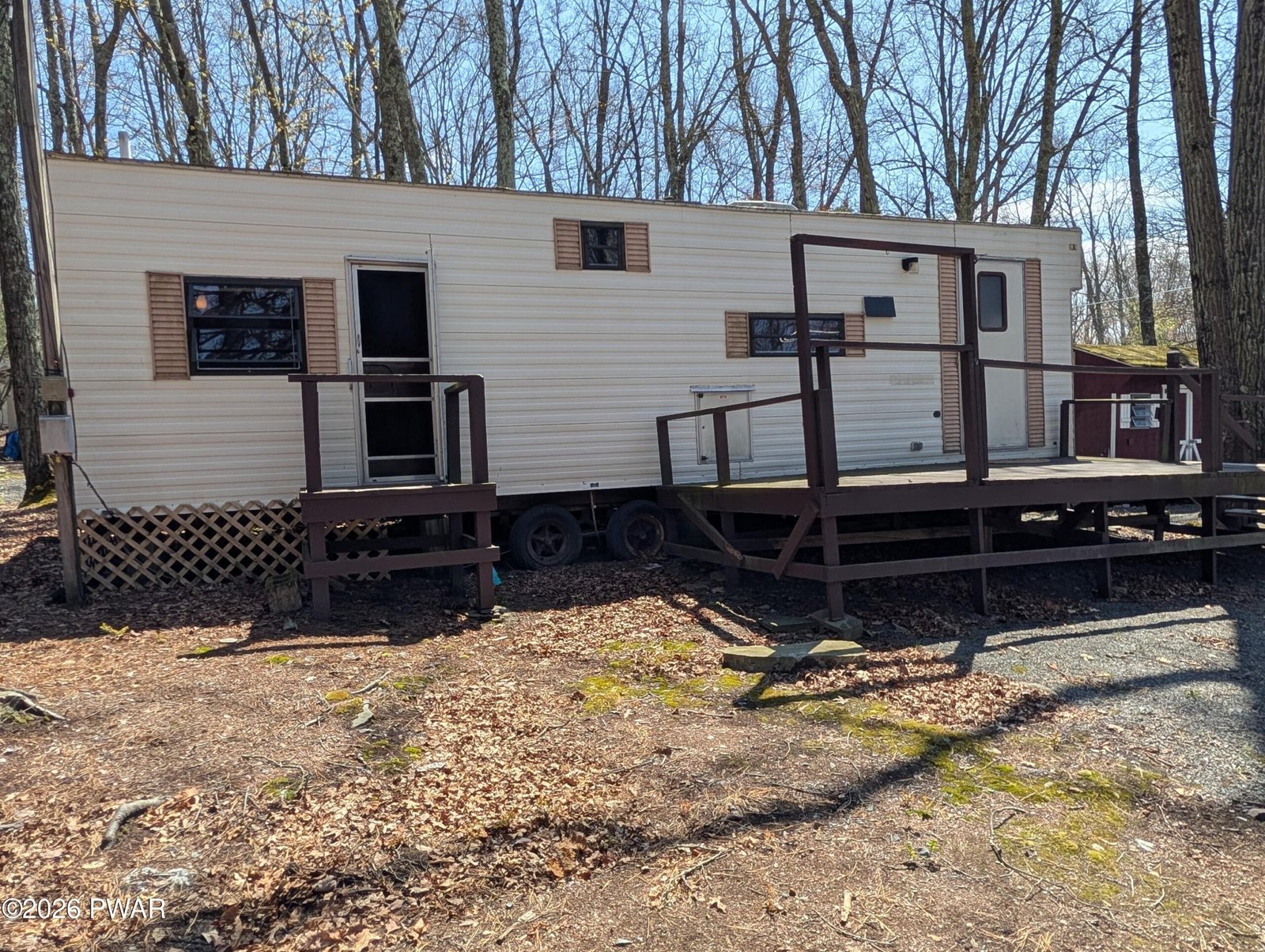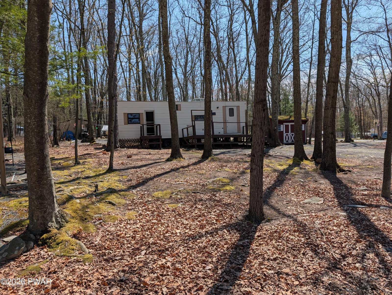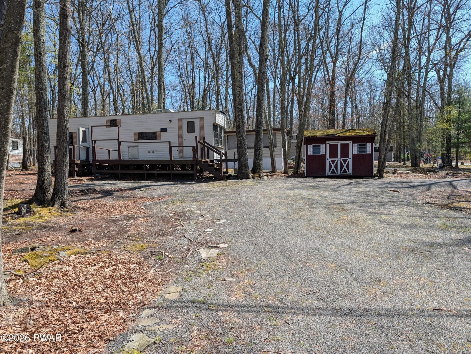 Fabulous corner lot with trailer, deck and shed in Trails End!!! This property is graveled, cleared, very clean, has trees, circular driveway, and just the perfect spot!! Trailer sits back, and on a corner, so you feel like you are in your own private oasis! Extremely neat and clean, this vacation home boasts a new roof and hot water heater. The layout of the property is very smart, using all of the space to it's advantage. Great firepit and shed!!! Close to all amenities, this is a must-see!!