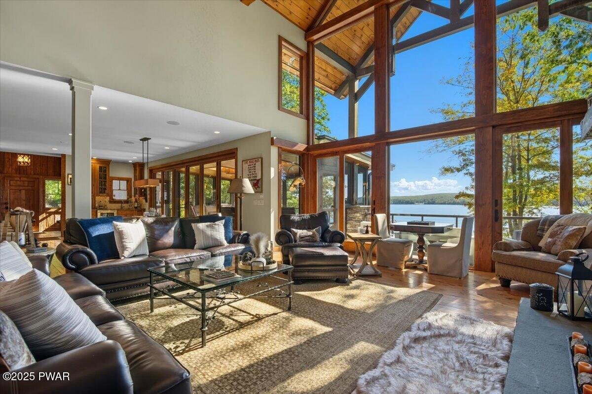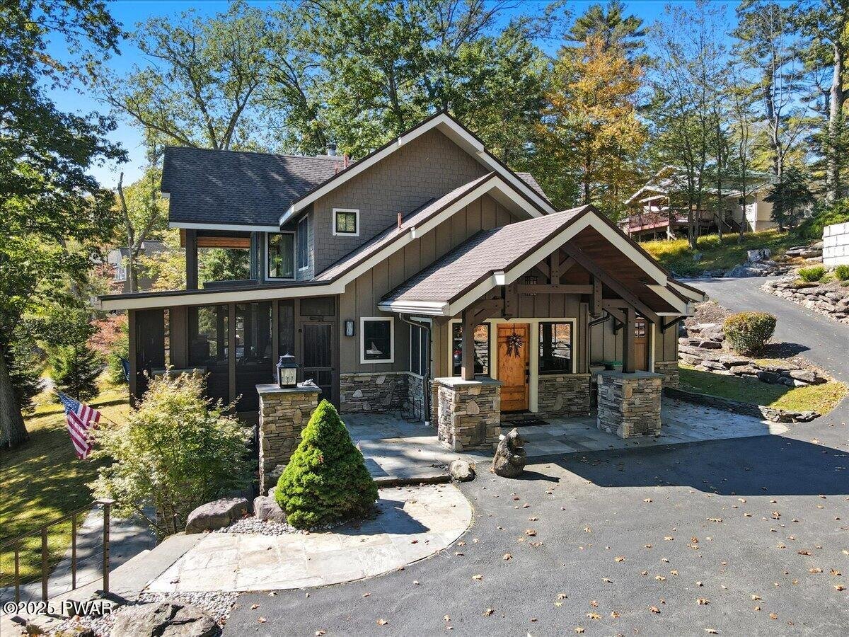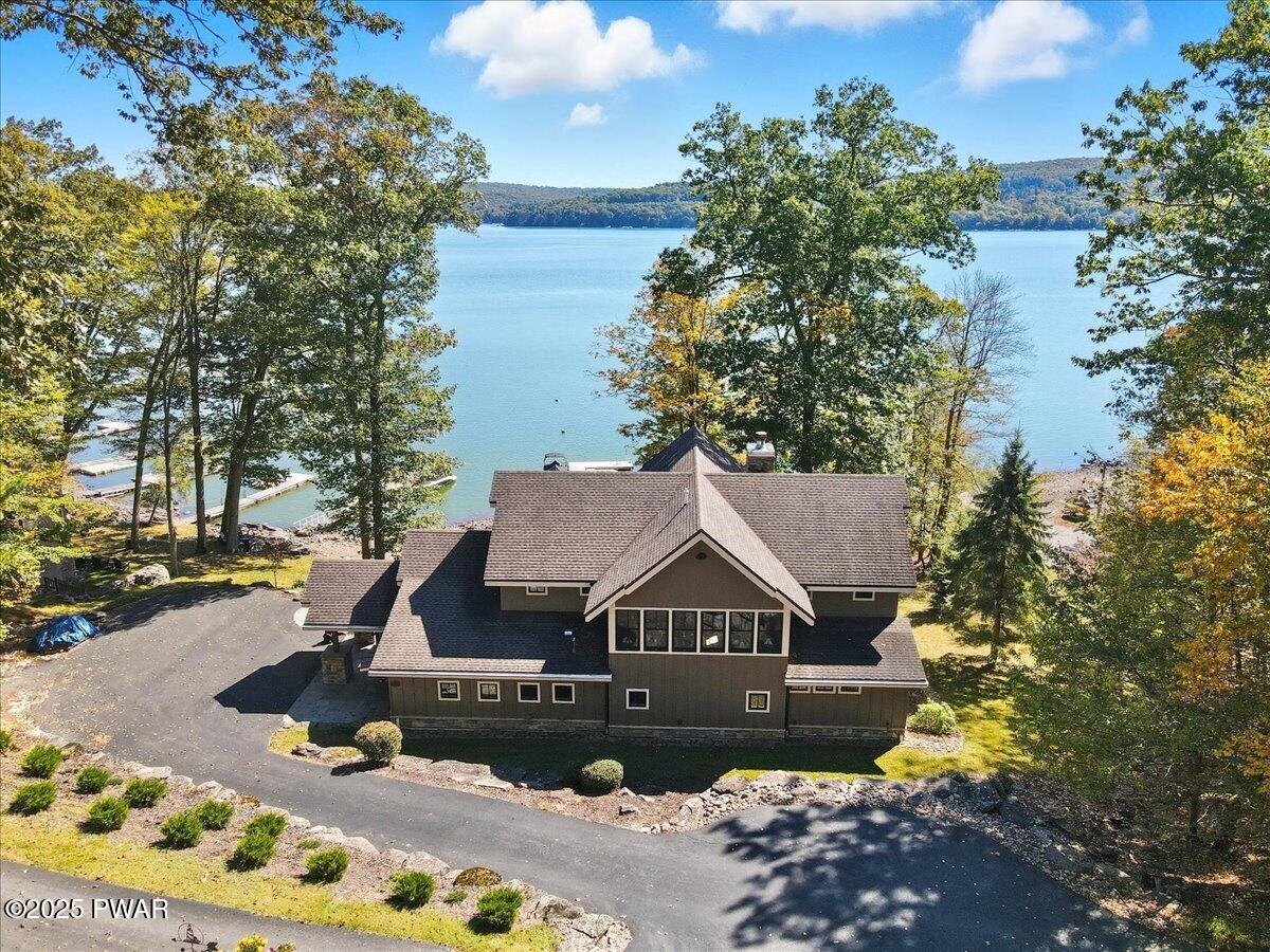 Lake Wallenpaupack luxury at its finest -- a custom-built 5-bed, 6-bath masterpiece set on 169 feet of private lakefront in a peaceful cove! This extraordinary home showcases the architectural excellence of Architect, Richard Pedranti, a leader in modern Passive House design. This five-bedroom, six-bath retreat showcases contemporary craftsmanship with timeless lake-house warmth. Step through the foyer lined with reclaimed hemlock walls into an open living space anchored by a floor-to-ceiling stone fireplace, steel-beam construction, and a moving glass system (NanaWall) that opens to a covered porch and expansive decks overlooking the lake. The chef's kitchen features Jenn-Air appliances, double ovens, granite counters, a coffee bar, separate wine & spirits bar, and a large walk-in pantry with custom cabinetry & a laundry room. The main-level primary suite offers a spa bath with leathered-granite counters and a walk-in closet, while two ensuite bedrooms upstairs and two more bedrooms on the lower level provide luxury for guests. A screened-in porch with tongue-and-groove ceiling, skylights, and slate tile floors invites seamless indoor-outdoor living. Every bath showcases tile, custom showers, and granite or artisan sinks. The lower level includes a family room with half bath, office / fitness / guest space, and walk-out stone patio. Energy efficiency is unmatched--this certified Passive House meets rigorous standards for airtightness, insulation, and comfort, dramatically reducing heating and cooling costs. Additional highlights include solid wood doors, cable-rail staircases, integrated sound system, maintenance-free composite decking with cable railings, exterior stone accents, paver patios, uplighting, and a flat, landscaped lawn leading directly to your boat dock at the lake. A true modern lakefront timber-frame masterpiece that defines luxury, sustainability, and design excellence on Lake Wallenpaupack.