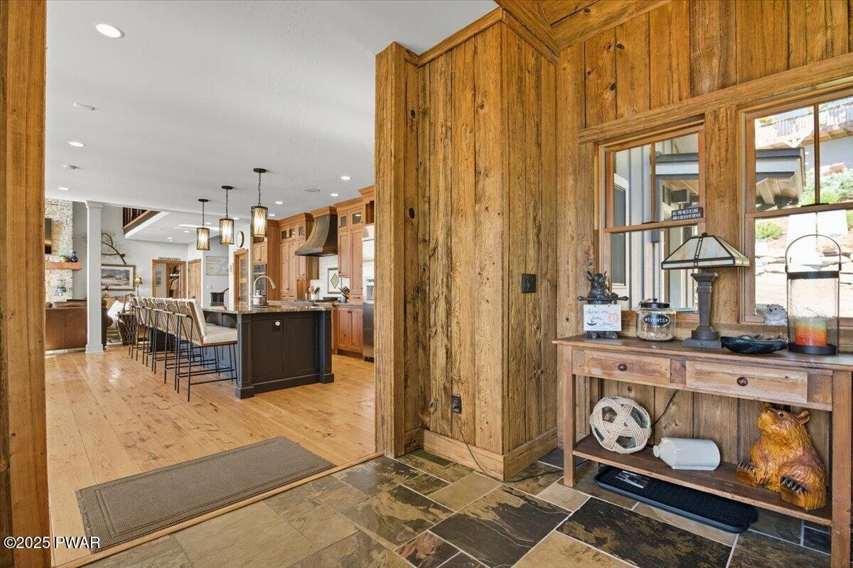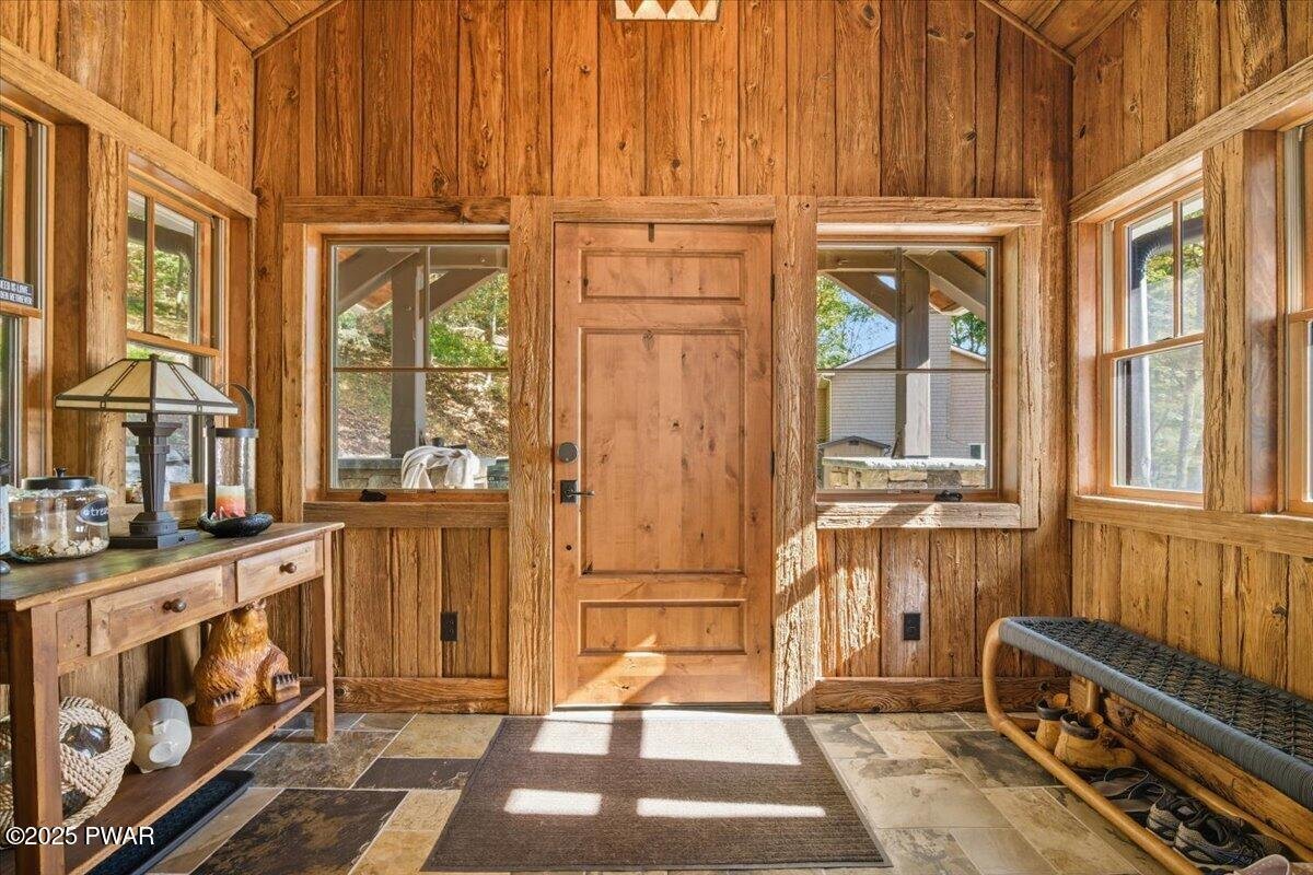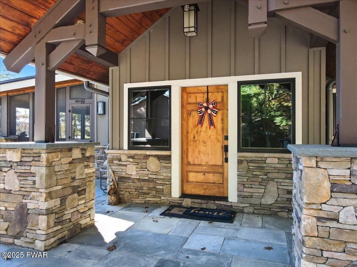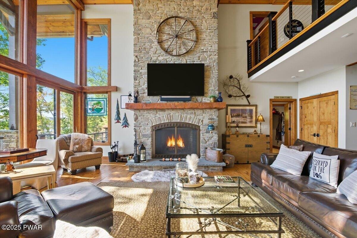 Lake Wallenpaupack luxury at its finest -- a custom-built 5-bed, 6-bath masterpiece set on 169 feet of private lakefront in a peaceful cove! This extraordinary home showcases the architectural excellence of Architect, Richard Pedranti, a leader in modern Passive House design. This five-bedroom, six-bath retreat showcases contemporary craftsmanship with timeless lake-house warmth. Step through the foyer lined with reclaimed hemlock walls into an open living space anchored by a floor-to-ceiling stone fireplace, steel-beam construction, and a moving glass system (NanaWall) that opens to a covered porch and expansive decks overlooking the lake. The chef's kitchen features Jenn-Air appliances, double ovens, granite counters, a coffee bar, separate wine & spirits bar, and a large walk-in pantry with custom cabinetry & a laundry room. The main-level primary suite offers a spa bath with leathered-granite counters and a walk-in closet, while two ensuite bedrooms upstairs and two more bedrooms on the lower level provide luxury for guests. A screened-in porch with tongue-and-groove ceiling, skylights, and slate tile floors invites seamless indoor-outdoor living. Every bath showcases tile, custom showers, and granite or artisan sinks. The lower level includes a family room with half bath, office / fitness / guest space, and walk-out stone patio. Energy efficiency is unmatched--this certified Passive House meets rigorous standards for airtightness, insulation, and comfort, dramatically reducing heating and cooling costs. Additional highlights include solid wood doors, cable-rail staircases, integrated sound system, maintenance-free composite decking with cable railings, exterior stone accents, paver patios, uplighting, and a flat, landscaped lawn leading directly to your boat dock at the lake. A true modern lakefront timber-frame masterpiece that defines luxury, sustainability, and design excellence on Lake Wallenpaupack.