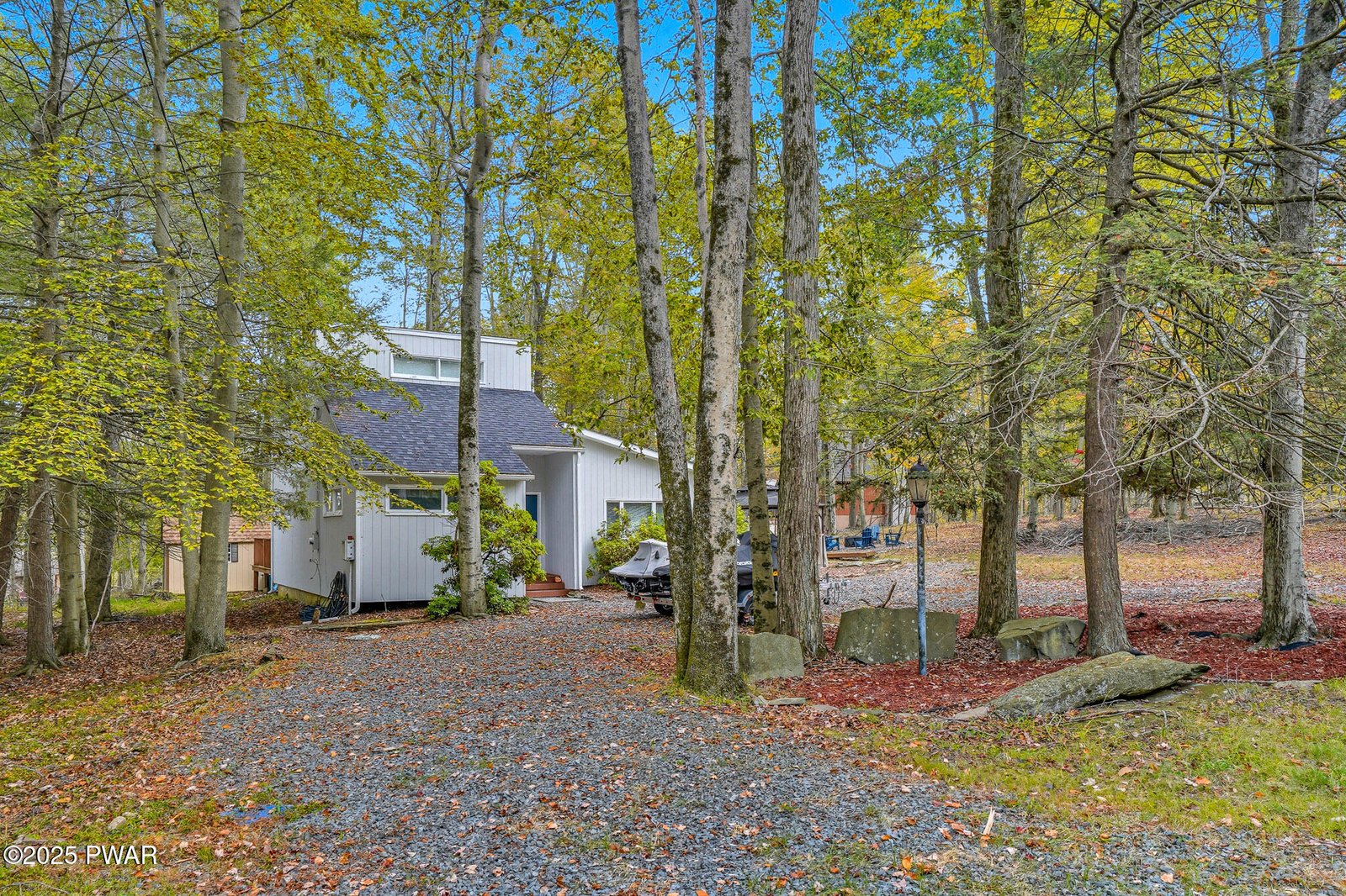 This stunning contemporary-style residence in Wallenpaupack Lake Estates seamlessly blends modern comfort with outdoor leisure, having undergone significant upgrades to elevate its appeal. Featuring three spacious bedrooms and two fully renovated bathrooms, the home offers an open floor plan with a cathedral ceiling in the living room, with newly-installed wood-burning fireplace adds warmth. The entire interior has been freshly painted, with refinished wood floors and a completely updated kitchen boasting new countertops, backsplash, and appliances. A new washer and dryer complement the modern amenities. The primary suite includes a private balcony with scenic views, and both bathrooms have been fully renovated with contemporary fixtures. Outdoors, the expansive wrap-around deck has been stained, select boards replaced, and a new hot tub and fire pit area added for ultimate relaxation. A newly-built gazebo enhances the outdoor living space, while new gravel paths and an upgraded driveway improve both curb appeal and functionality. The home also features a brand-new roof, a newly-installed septic pump, and upgraded insulation and a vapor barrier in the crawl space for improved energy efficiency. Residents enjoy access to community amenities such as indoor and outdoor pools, a fitness center, tennis courts, hiking trails, a skate park, RV parking, and camping facilities. The community also offers lake rights to Lake Wallenpaupack, perfect for boating and water activities. This property offers a rare opportunity to own a beautifully updated contemporary home in an amenity-rich community, all set amidst the natural beauty of the Pocono Mountains. And this property is being sold with the extra lot next to it included