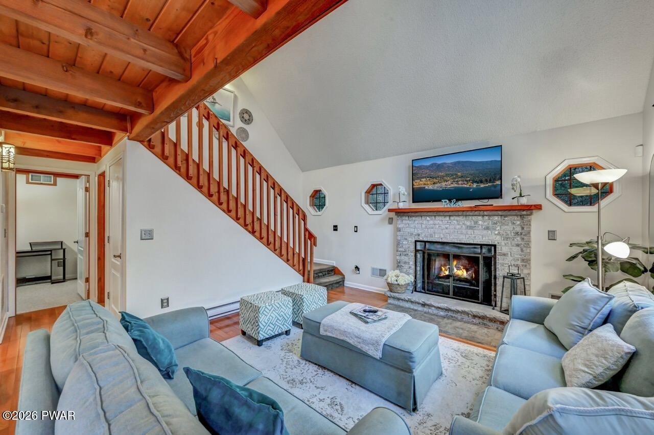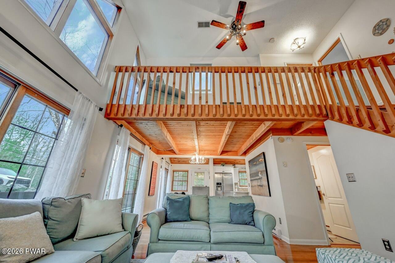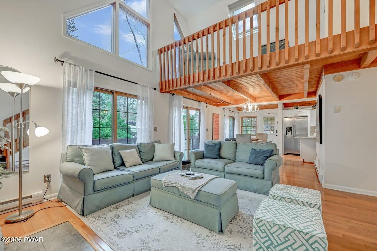 The inside and outside of this property are totally zen--offering a peaceful retreat surrounded by nature in desirable Wallenpaupack Lake Estates. This stunning chalet-style home comes fully furnished and is set on a beautifully maintained lot featuring a tranquil stream and cozy firepit, with easy-care landscaping that enhances the serene setting.Enjoy outdoor living at its finest with a wraparound deck, private rear deck, and a gorgeous sunroom--perfect for soaking in the quiet surroundings year-round. A detached garage with a finished interior provides endless flexibility for hobbies, storage, or entertaining.Inside, this meticulously maintained home shines with hardwood floors in the main living area, soaring ceilings, and a loft that overlooks the bright and airy living room. Knotty pine ceilings add warmth and character, while the beautifully appointed kitchen features granite countertops and direct access to the sunroom.Relax by the charming brick fireplace with propane insert (easily convertible to wood-burning), or retreat upstairs to the spacious loft and primary bedroom complete with its own private balcony. The finished lower level offers a recreation room, half bath with knotty pine accents, and a versatile built-in garage space that can function as a gym, hangout area, or additional storage.This home also includes lake rights to Lake Wallenpaupack and access to an impressive array of community amenities, including lakes, beaches, 2 outdoor pools, an indoor pool, a fitness center, teen center, adult lodge, tennis courts, hiking trails, gaming courts, ballfields, camping, and a boat ramp for easy lake access. Central sewer and water are included in the dues.Whether you're looking for a full-time residence or a weekend escape, this home offers a lifestyle of relaxation, recreation, and connection with nature--everything you need to unwind and enjoy the best of lake living.