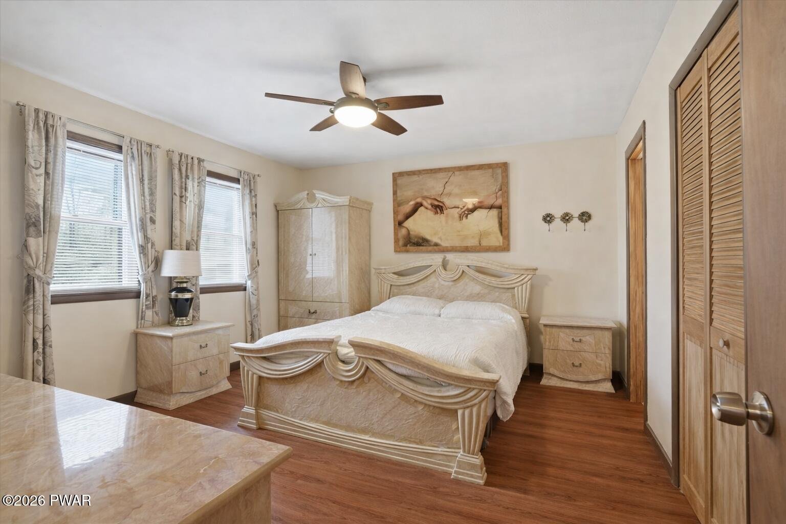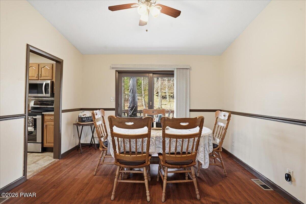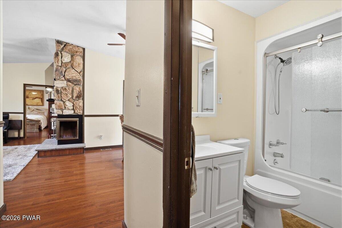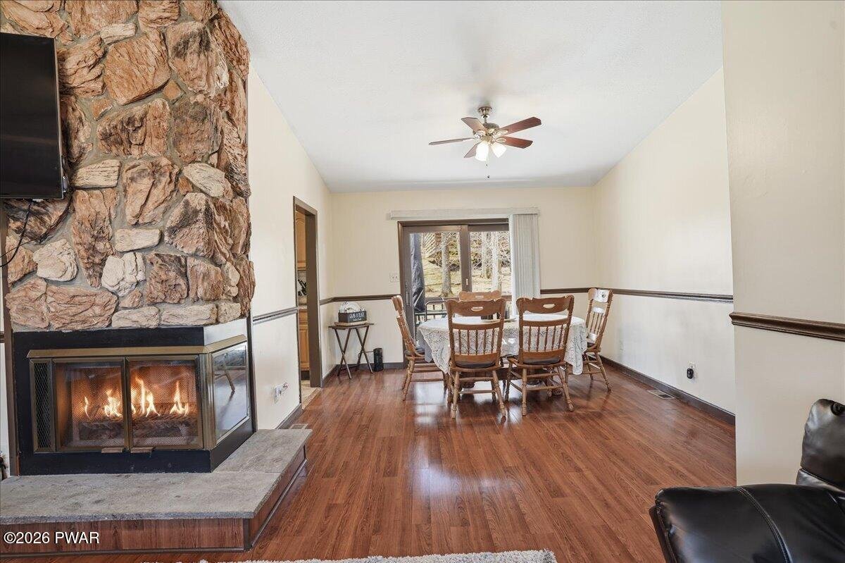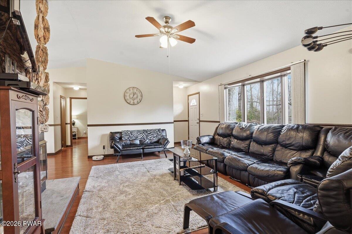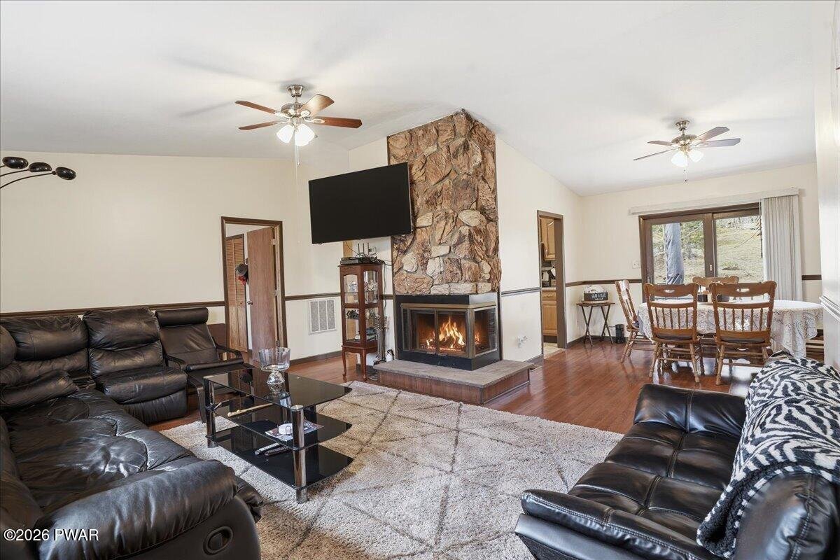 This is the kind of home that just makes sense--fully furnished, move-in ready, and set up to give you the space and flexibility you didn't realize you needed.Located in Wallenpaupack Lake Estates, this home offers a rare combination of comfort, functionality, and convenience. Whether you're looking for a primary residence, weekend retreat, or a home that easily accommodates guests, this layout is designed to adapt to your lifestyle.The lower level provides its own separate living space with direct access through the 1.5-car garage. A spacious family room with an electric fireplace creates a comfortable setting, along with a bedroom, full bathroom, and laundry area. With room to incorporate a kitchenette, this level works well for extended stays or added privacy.Upstairs, the main level is bright and inviting with a natural flow between the kitchen, dining, and living areas. The kitchen features LG stainless steel appliances, granite countertops, an updated backsplash, motion-sensor faucet, and porcelain flooring. The dining area and vaulted living room are connected by a double-sided fireplace, making the space feel both open and comfortable.The split-bedroom layout offers a sense of separation, with the primary suite featuring a double vanity and walk-in shower, while two additional bedrooms and a full bath are positioned on the opposite side.A large wraparound deck extends across multiple sides of the home, offering plenty of space to relax or entertain outdoors.Additional features include a paved driveway, newer garage door, updated interior doors, upgraded electric heaters with modern thermostats, a well-maintained two-zone heating and cooling system, and gutters with leaf guards. Copper plumbing lines were installed in 2002.As part of Wallenpaupack Lake Estates, the property includes access to lakes, beaches, pools, clubhouse, fitness center, and year-round recreational amenities.