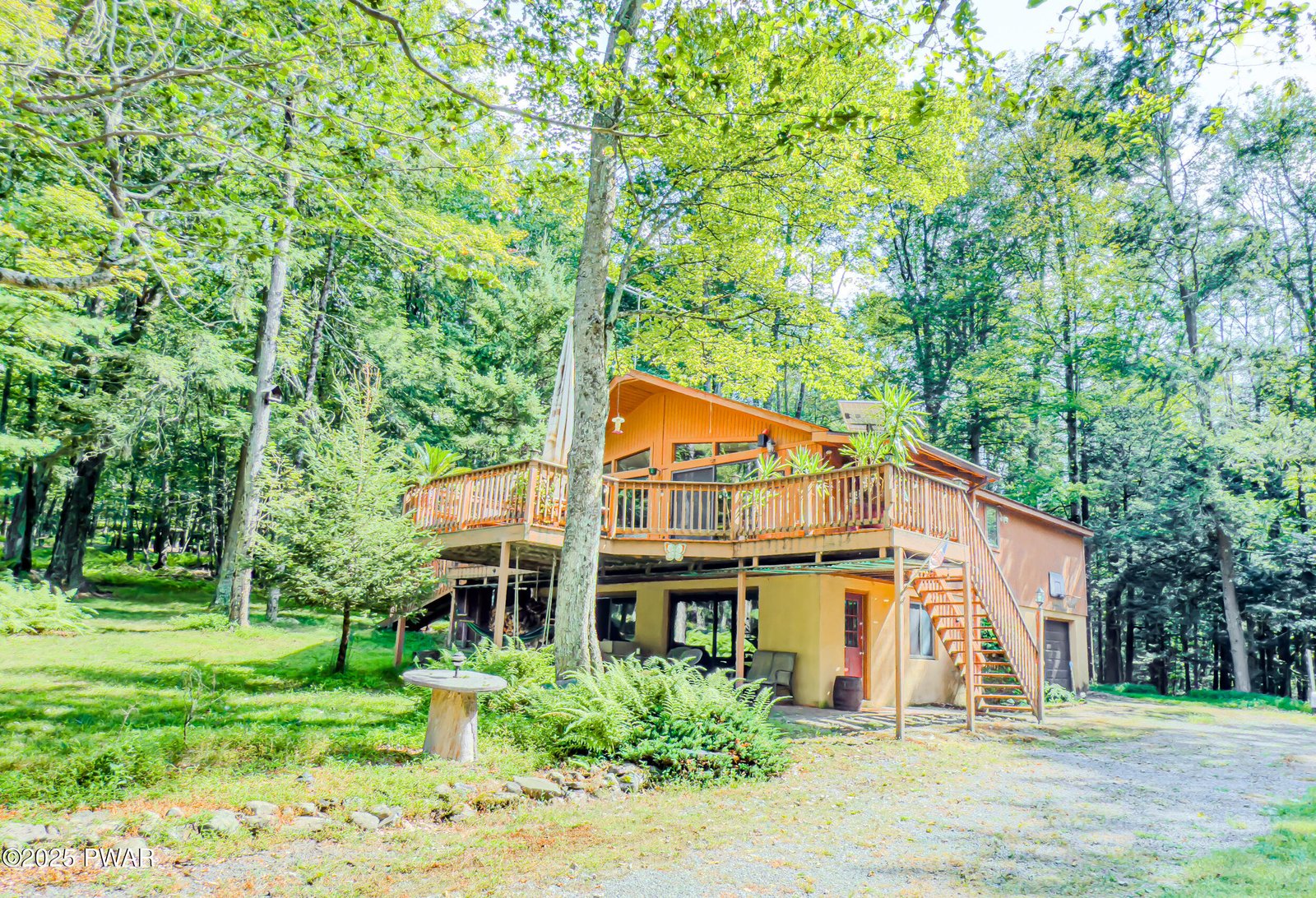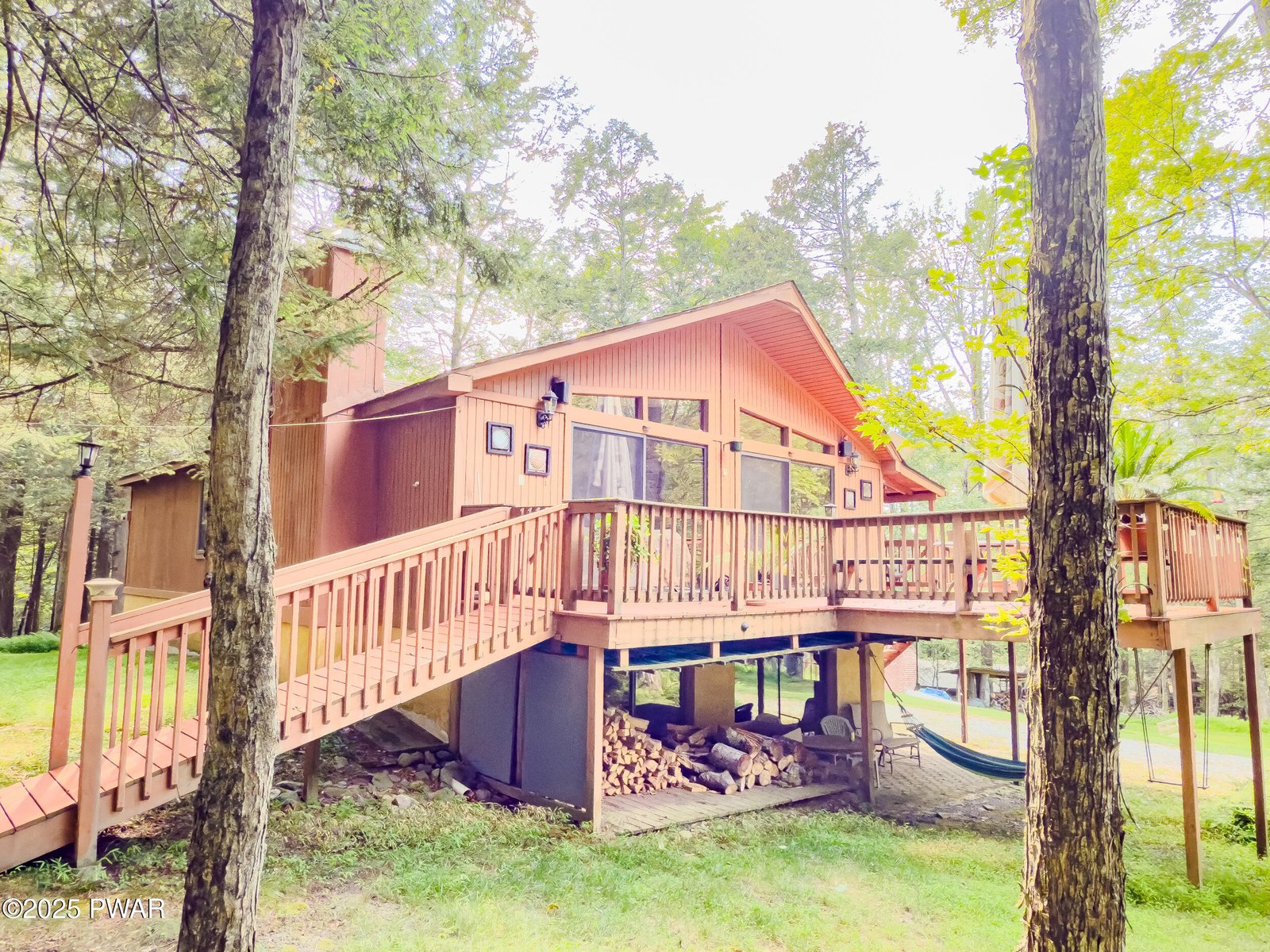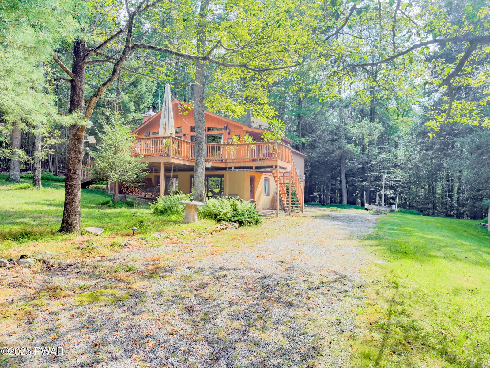 LAKEFRONT REAL ESTATE PACKAGE - Charming Chalet Retreat with Lake Wallenpaupack Lakefront Lot in Laurel Lane Community! 2 Properties, 1 great price! This very sweet retreat sits privately nestled on a cul-de-sac road, on over 1 acre of easily maintained, peaceful, wooded property... Featuring a light & lovely open floor plan w/ vaulted ceilings, 3 bedrooms incl. primary w/ en-suite bath, 3 baths total, spacious open kitchen & dining w/ granite counters & island, living room w/ floor to ceiling stone fireplace, finished lower level entertainment room w/ custom wet bar, woodstove, & walk-out access, plus easy access garage w/ plentiful bonus workspace, this quintessential Poconos home offers everything you need. Take in the fresh air, enjoy the serenity of the surrounding nature, and relax outside on the beautifully designed wrap-around deck or down around the firepit w/ friends or family. The included Lake Wallenpaupack lakefront lot is a short walk just across the street and offers approx. 80' of lake frontage with DOCK INCLUDED capable of storing TWO 30' boats, and located in a No Wake Zone. Lake Wallenpaupack is the 2nd largest lake in PA, spanning 13+ miles long through 2 counties w/ 5700 acres of surface area, and allows unlimited horsepower boating. This special lake is one of the Poconos most sought after locations, maintaining a natural shoreline for scenic tranquility and providing year round enjoyment from boating, to water skiing, kayaking, fishing, ice fishing, ice skating, and more! Nearby state parks, hiking trails, ski slopes, rivers, waterfalls, shopping, dining, and entertainment also offer you a variety of amenities conveniently close by. Truly a premier location to own your own piece of Poconos Paradise for the perfect vacation destination or year round lake life living! 29' Boat also available for sale, contact listing agent for details.