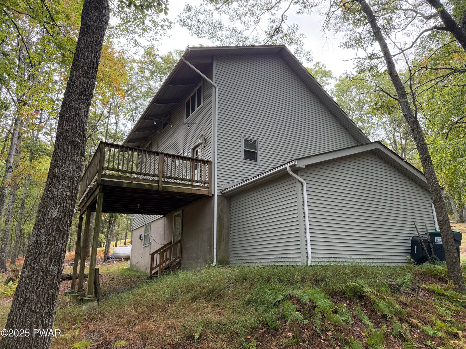 Chalet-style 3-bedroom, 2-bath home on an oversized lot in Pocono Mountain Lake Estates, featuring vaulted ceilings, hardwood floors, a brick fireplace, and an attached one-car garage. A full unfinished basement provides excellent storage or future expansion potential, while a flexible bonus room offers space for a home office, hobby room, or guest area. Enjoy peace of mind with a WHOLE-HOUSE Generac generator and an existing security camera system.The bright, open living room is the heart of the home with soaring ceilings, exposed wood beams, and large windows overlooking the surrounding woods. Outside, relax on the back deck surrounded by trees or enjoy nearby community lake access. Close to Shawnee Mountain skiing, golf, and Bushkill Falls, this home is ideal as a full-time residence or a Pocono retreat.