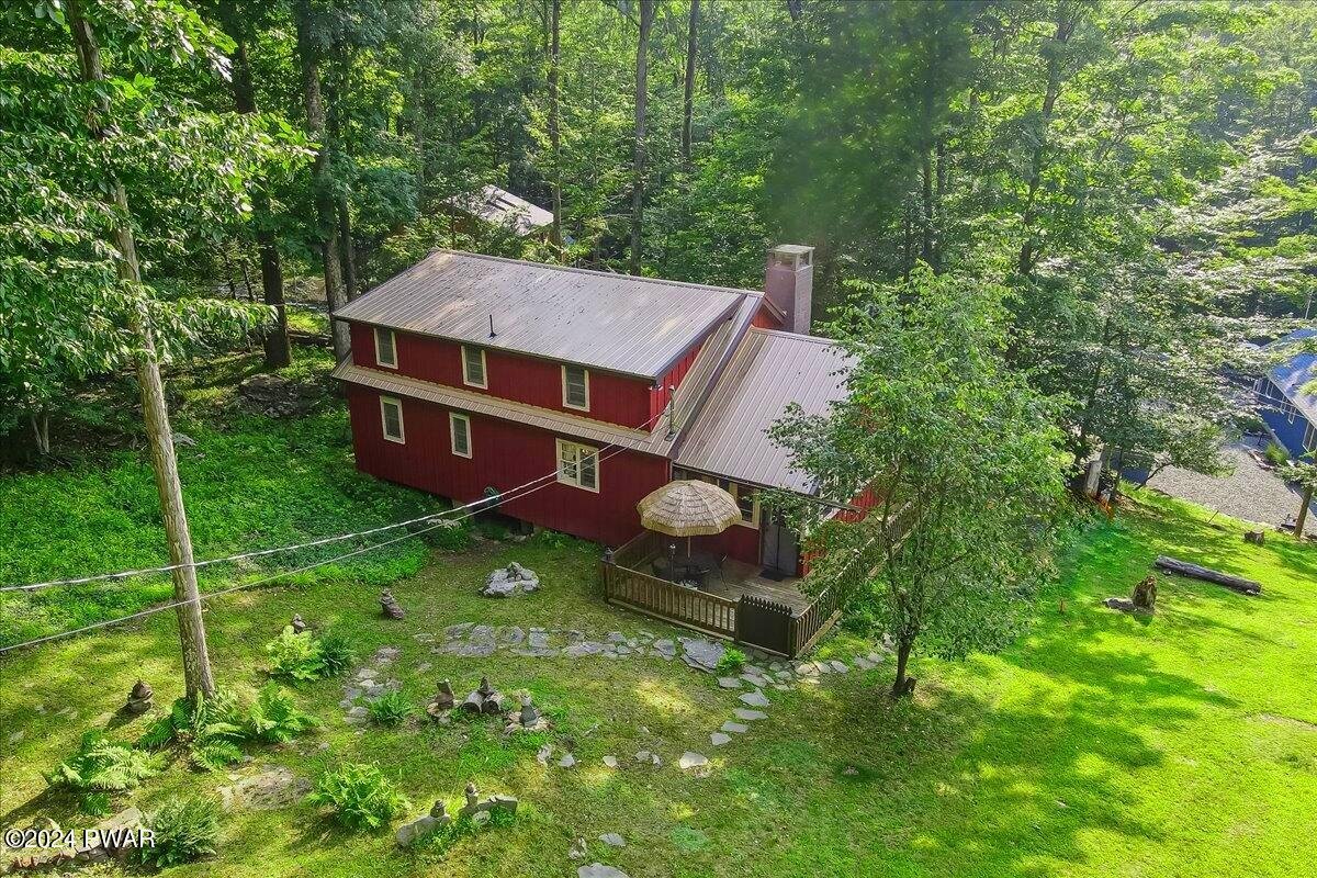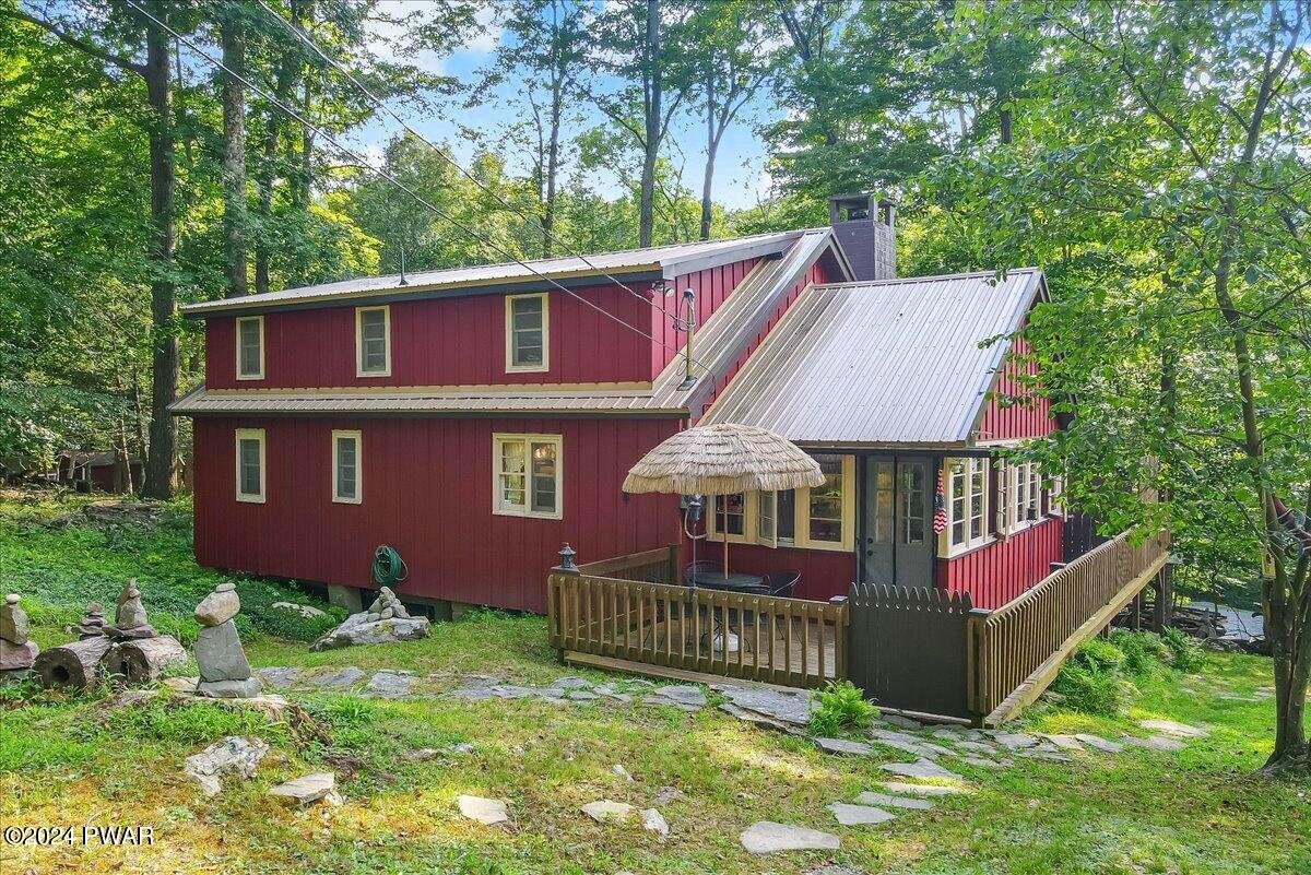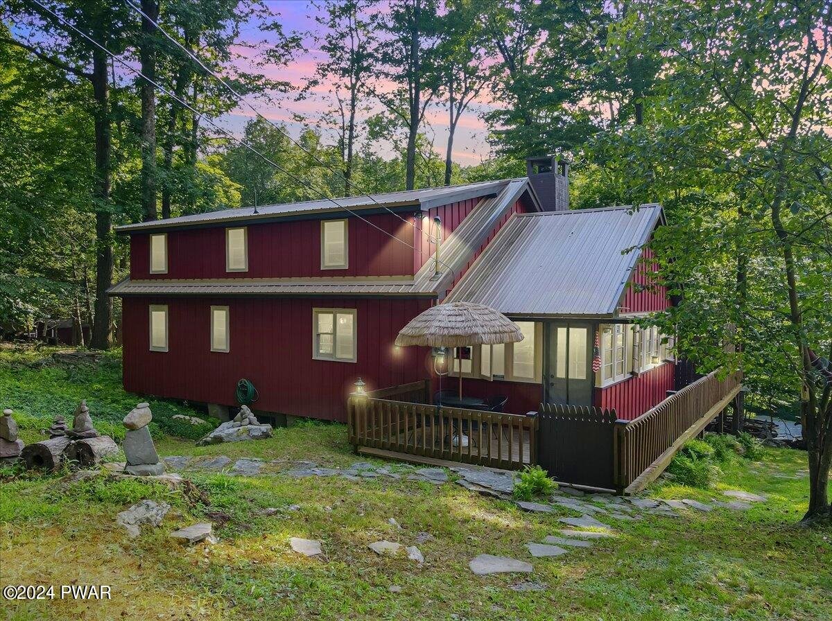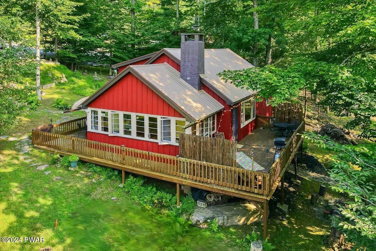 If you appreciate Character, this is your Lake Wallenpaupack Pocono Mountain home. Available NOW to make memories the rest of the year! This charming, Lakeview, 3-season, 'Gumble Chalet' features a cozy brick fireplace, an open dormer loft & beam-exposed ceiling. With original cabinetry, hardware and furnishings, this lake house feels 'rustic' and spacious. A nostalgic 'Dutch' door to the sunroom offers views of the lake, trees and wildlife. This unique, mountain cabin showcases natural wood craftsmanship, including (covered) wooden floors and an open layout with so many expansion possibilities! Wildlife enthusiasts will enjoy watching the natural habitat and daily deer crossings from the wrap-around deck, complete with bamboo fencing & tiki torches. The vibe can feel a bit like a'tropical treehouse' get-a-way! This small, private community with very low HOA dues, offers annual picnics and 4th of Julyfireworks! Roads, swimming docks, boat slips and insurance are maintained through the HOA. Owner-occupied property rentals with boat slip ARE permitted, which allows for even moreopportunities! Nestled in a shaded wooded lot, the home features a tranquil front yard that sits down and backfrom the community road. Driveway offers parking for your boat, trailer or multiple vehicles. Views overlook the trees, the community mountain-stream and one of Lake Wallenpaupack's largest coves, Beechwood. Access the Cove by foot via multiple trails, a golf cart (like most) or by car (wheelchair accessible) from Felix Lane. There you'll find a fishing dock, kayak racks, fire pit and picnic tables available for community members and their guests. A gravel path leads to twolong boating docks including Your new Boat Slip! Homeowners have use of a boat launch for their personal watercraft. Additionally, each dock has a large swimming platform and calm waterfor recreational fun! Nature lovers can kayak, canoe or paddle board out to Ironwood Point campground &recreation