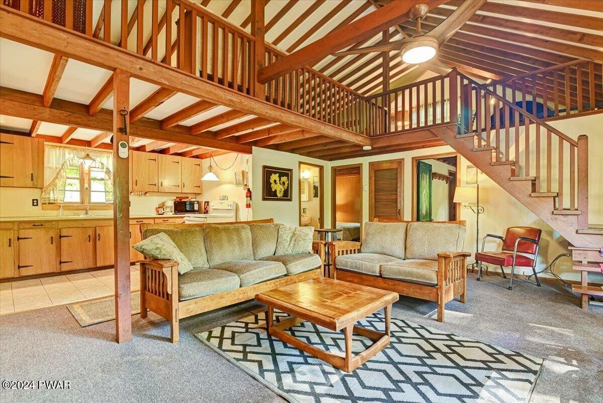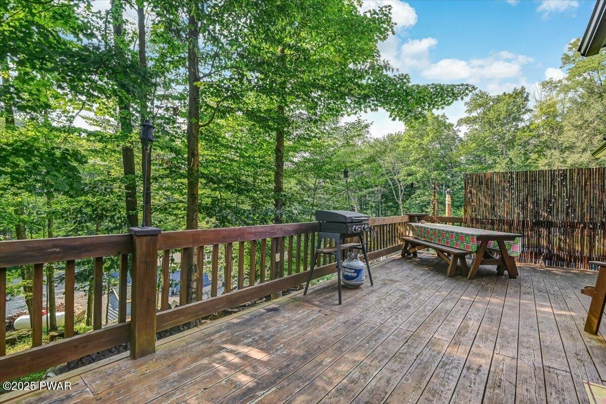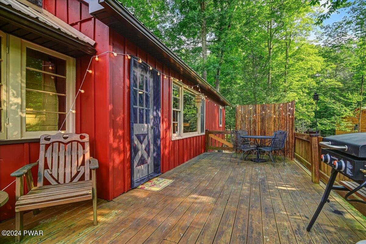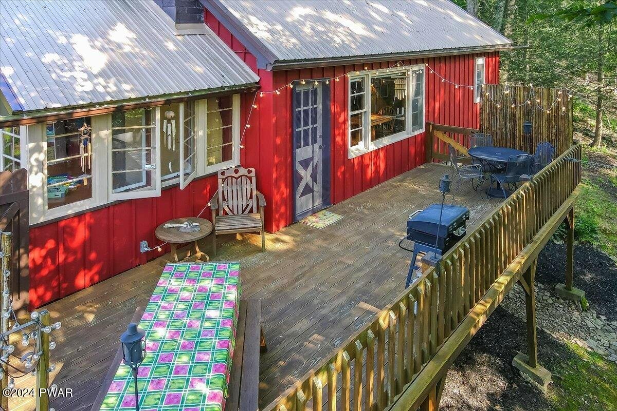 If you appreciate Character, this is your Lake Wallenpaupack Pocono Mountain home. Available NOW to make memories the rest of the year! This charming, Lakeview, 3-season, 'Gumble Chalet' features a cozy brick fireplace, an open dormer loft & beam-exposed ceiling. With original cabinetry, hardware and furnishings, this lake house feels 'rustic' and spacious. A nostalgic 'Dutch' door to the sunroom offers views of the lake, trees and wildlife. This unique, mountain cabin showcases natural wood craftsmanship, including (covered) wooden floors and an open layout with so many expansion possibilities! Wildlife enthusiasts will enjoy watching the natural habitat and daily deer crossings from the wrap-around deck, complete with bamboo fencing & tiki torches. The vibe can feel a bit like a'tropical treehouse' get-a-way! This small, private community with very low HOA dues, offers annual picnics and 4th of Julyfireworks! Roads, swimming docks, boat slips and insurance are maintained through the HOA. Owner-occupied property rentals with boat slip ARE permitted, which allows for even moreopportunities! Nestled in a shaded wooded lot, the home features a tranquil front yard that sits down and backfrom the community road. Driveway offers parking for your boat, trailer or multiple vehicles. Views overlook the trees, the community mountain-stream and one of Lake Wallenpaupack's largest coves, Beechwood. Access the Cove by foot via multiple trails, a golf cart (like most) or by car (wheelchair accessible) from Felix Lane. There you'll find a fishing dock, kayak racks, fire pit and picnic tables available for community members and their guests. A gravel path leads to twolong boating docks including Your new Boat Slip! Homeowners have use of a boat launch for their personal watercraft. Additionally, each dock has a large swimming platform and calm waterfor recreational fun! Nature lovers can kayak, canoe or paddle board out to Ironwood Point campground &recreation