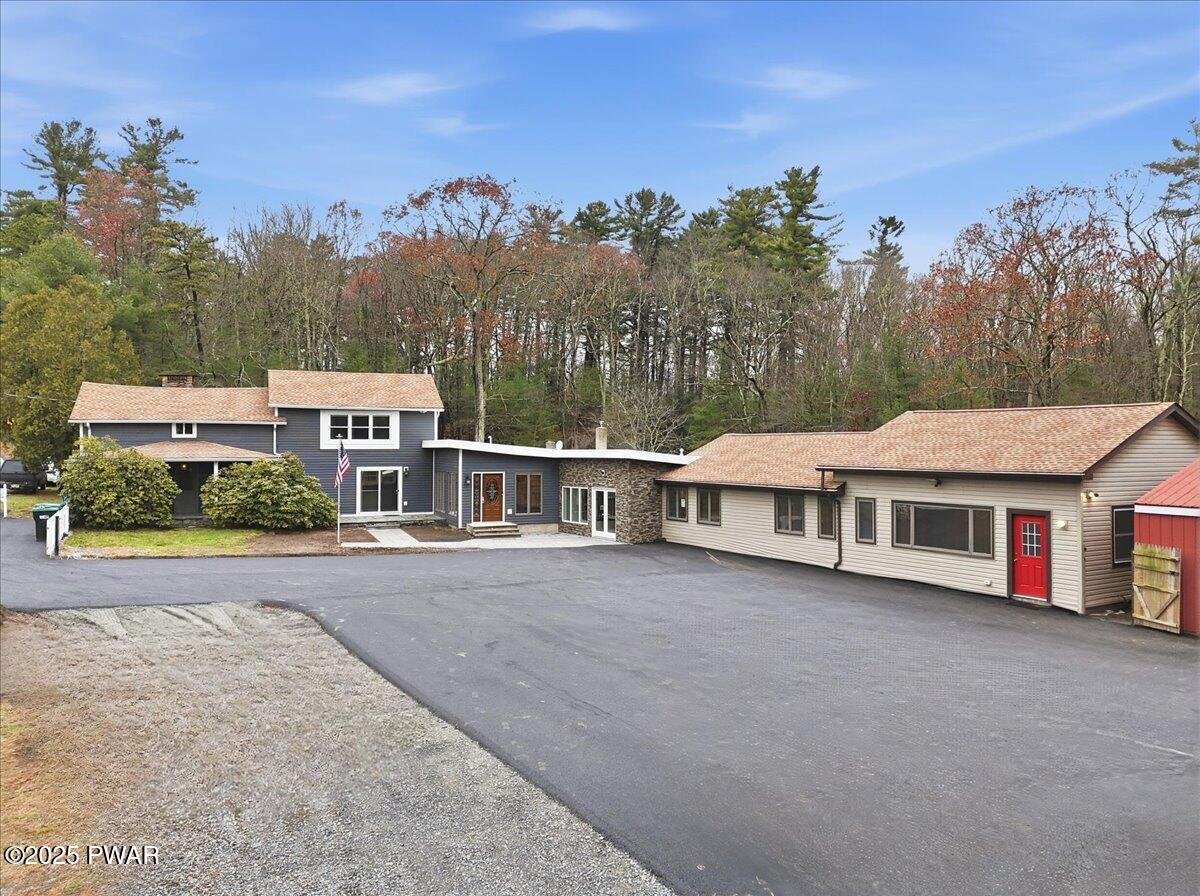 OPEN HOUSE!!! Saturday 1/24 10a-2p! Sunday 1/25 1p-4p! Welcome to your completely remodeled, multi-wing Milford retreat, where comfort meets flexibility. Set on 1.62 acres bordering state game lands, this 6-bedroom, 4-bath home has been transformed from top to bottom so you can move in with ease and start your plan B almost immediately. Local zoning supports accessory living, transient lodging, and home-based business use. With one kitchen and a kitchenette and two laundry rooms, the layout is ideal for a mother-daughter setup, multi-generational living, or a primary residence with multiple income-producing options. Every renovation was completed with integrity and attention to detail: a new state-of-the-art septic system servicing the entire property, new roof and siding, a newly paved driveway with ample parking, a brand-new water heater, generators, and a beautiful new connector room that unites the home's wings seamlessly. Every appliance, fixture, and finish - from flooring and carpeting to lighting and paint is new. Every system was upgraded or replaced; not a stone was left unturned. Step into the original farmhouse and you'll feel the charm of history preserved: the original stone floor, exposed beams, and a classic stone hearth fully inspected and ready for cozy fires. Upstairs are two private bedrooms, a full bath, and generous storage the perfect tucked-away quarters for Bed-and-Breakfast guests or friends visiting the Poconos for the weekend. The main kitchen is a true centerpiece: white shaker cabinetry, granite countertops, mosaic tile backsplash, double ovens, gas range, LG energy-efficient appliances, and a walk-in pantry. Sliding doors open to a front stone patio, while beamed ceilings and layered lighting make this space the bright, welcoming heart of the home. Off the kitchen, a flexible room with high ceilings, its own bath, and laundry area can serve as a home office, classroom, studio, or guest suite.