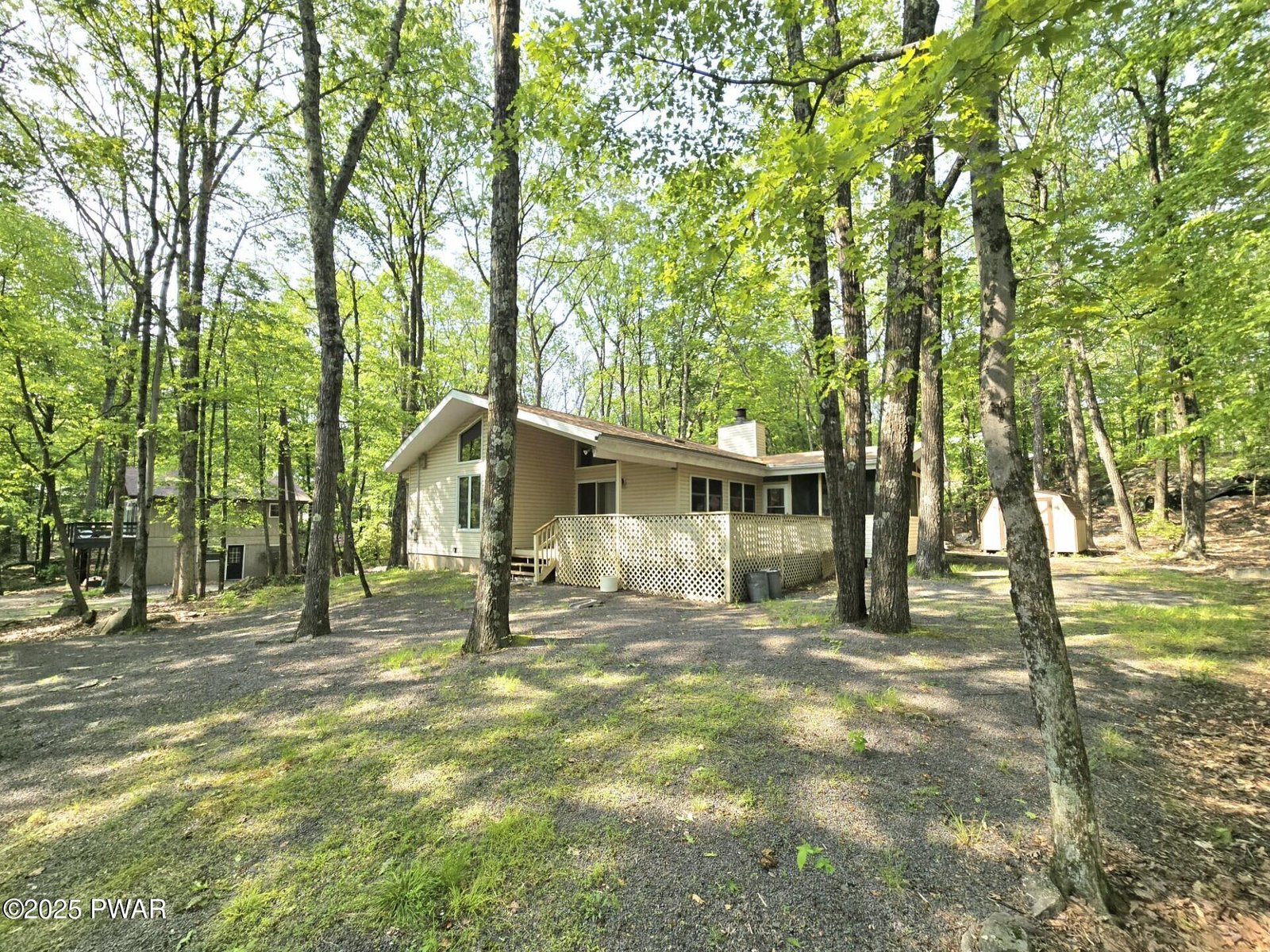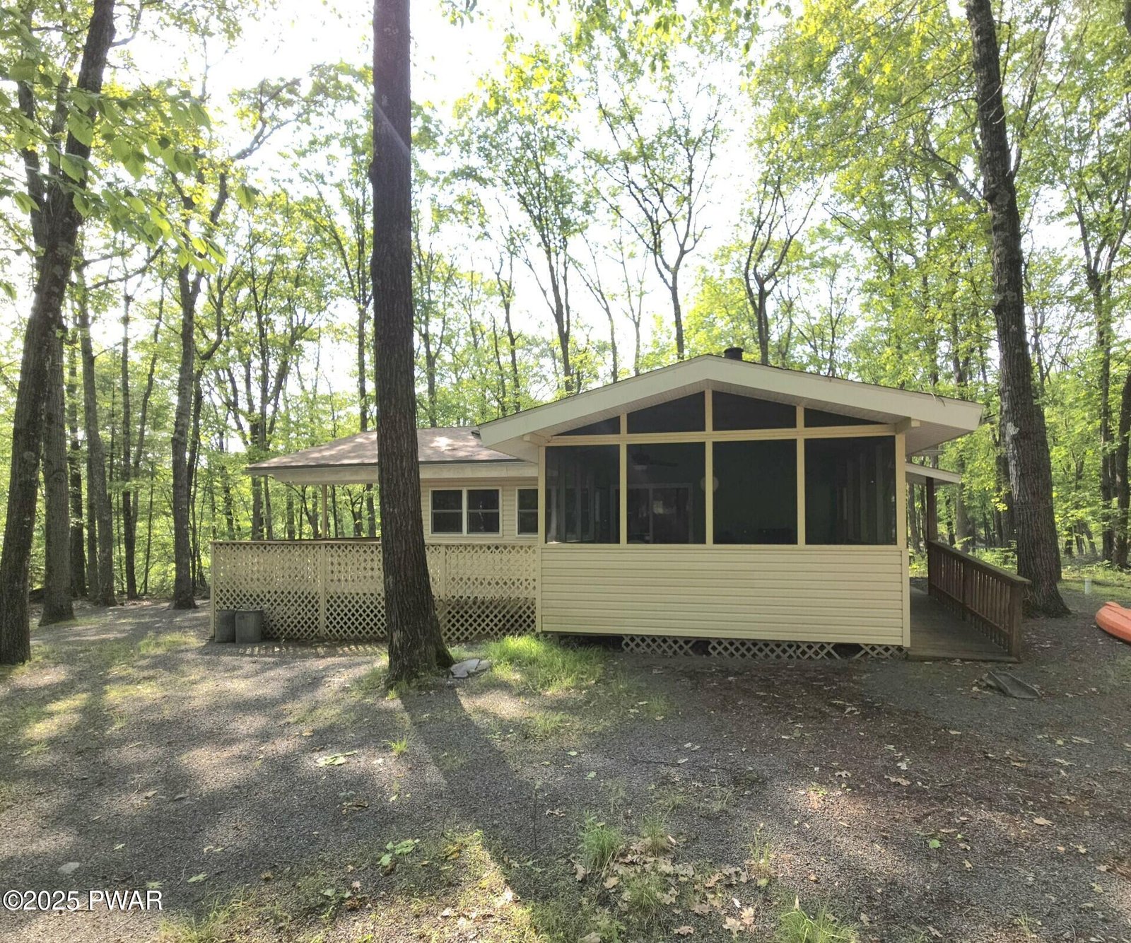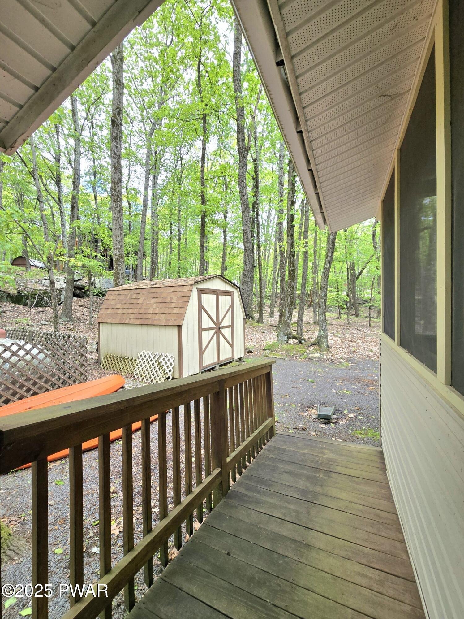 What a discovery! This charming one-story home features three bedrooms and two full baths, complete with a screened-in porch and a wrap-around deck, all situated in the amenity-rich Hemlock Farms community. It's an ideal retreat for enjoying winter, spring, summer, and fall. Five-minute walk to Little Camp Beach and ten-minutes walk to Elm Beach.The home boasts beautiful hardwood floors throughout, parquet flooring in the office, and tiled surfaces in the kitchen and bathrooms, enhancing the appeal of each room along with tongue and groove high ceilings. Colorful walls brighten the home and abundant windows allow for plenty of natural light to fill the space.Existing ductwork can be used for Central AC.A shed in the backyard provides ample storage, while the screened room features a ceiling fan to create a gentle breeze, making the outdoor area even more enjoyable. The back access includes a ramp for easier entry, and the side leads to the large deck and front of the home.Don't miss out on this convenient ranch home. Everything you need on one level. Wheelchair accessible.