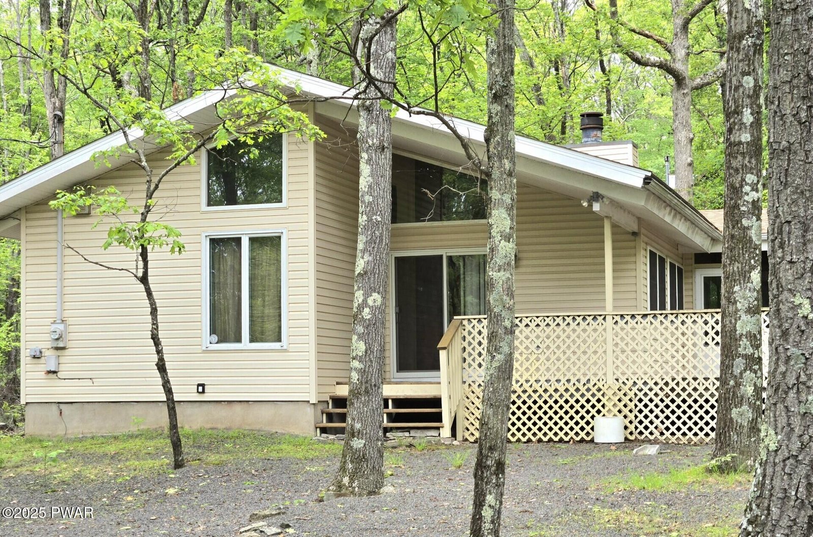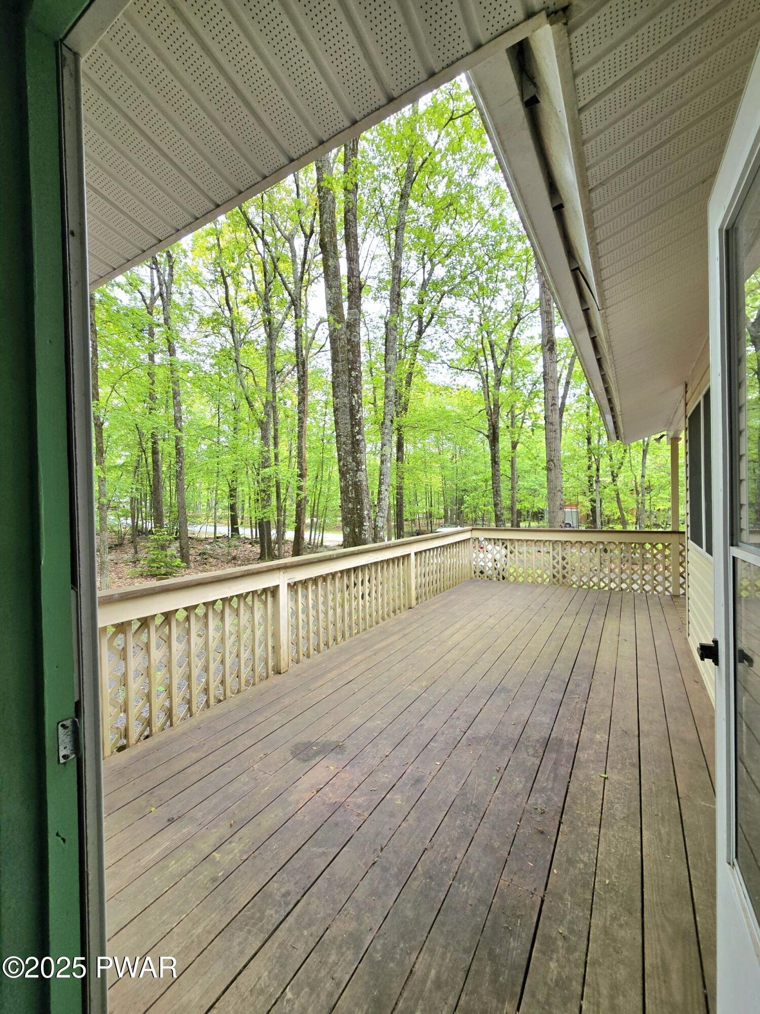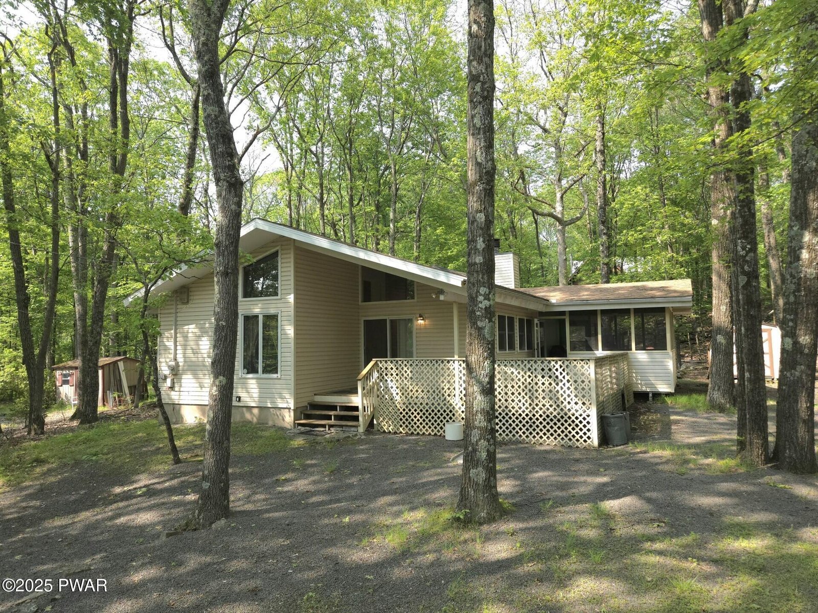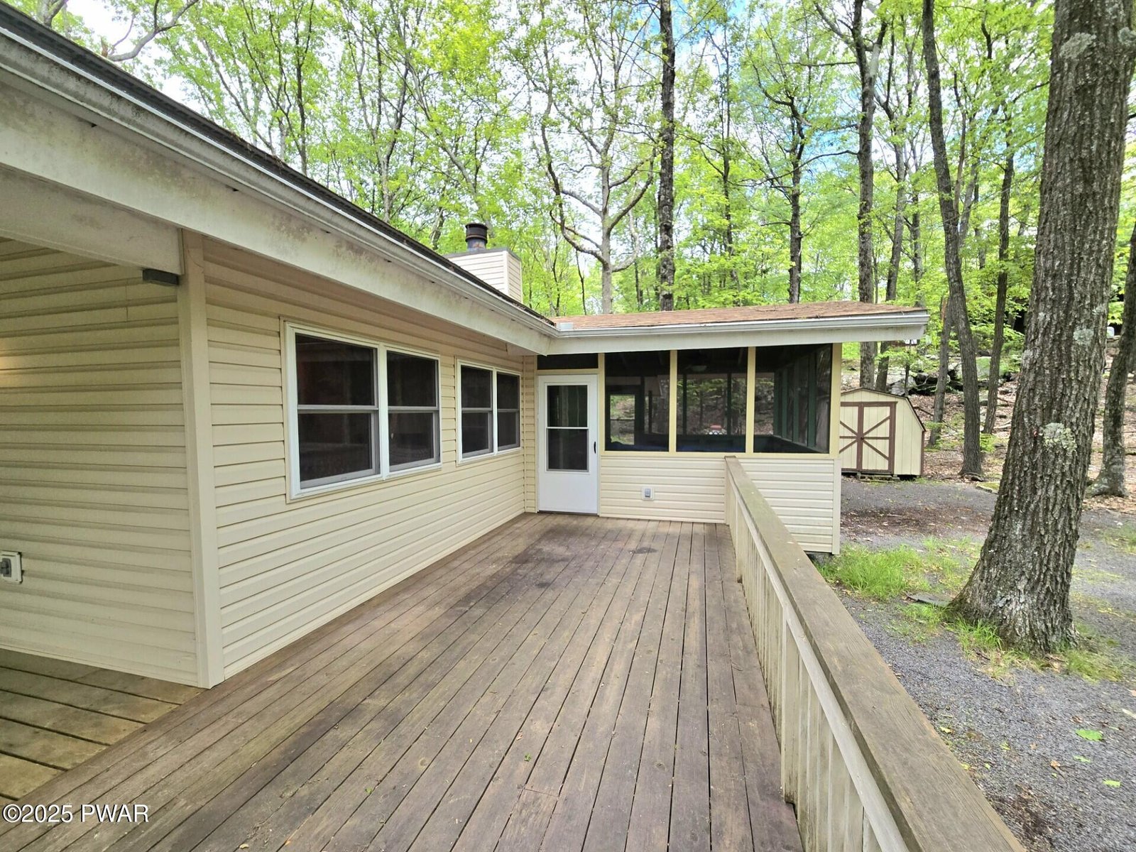 What a discovery! This charming one-story home features three bedrooms and two full baths, complete with a screened-in porch and a wrap-around deck, all situated in the amenity-rich Hemlock Farms community. It's an ideal retreat for enjoying winter, spring, summer, and fall. Five-minute walk to Little Camp Beach and ten-minutes walk to Elm Beach.The home boasts beautiful hardwood floors throughout, parquet flooring in the office, and tiled surfaces in the kitchen and bathrooms, enhancing the appeal of each room along with tongue and groove high ceilings. Colorful walls brighten the home and abundant windows allow for plenty of natural light to fill the space.Existing ductwork can be used for Central AC.A shed in the backyard provides ample storage, while the screened room features a ceiling fan to create a gentle breeze, making the outdoor area even more enjoyable. The back access includes a ramp for easier entry, and the side leads to the large deck and front of the home.Don't miss out on this convenient ranch home. Everything you need on one level. Wheelchair accessible.
