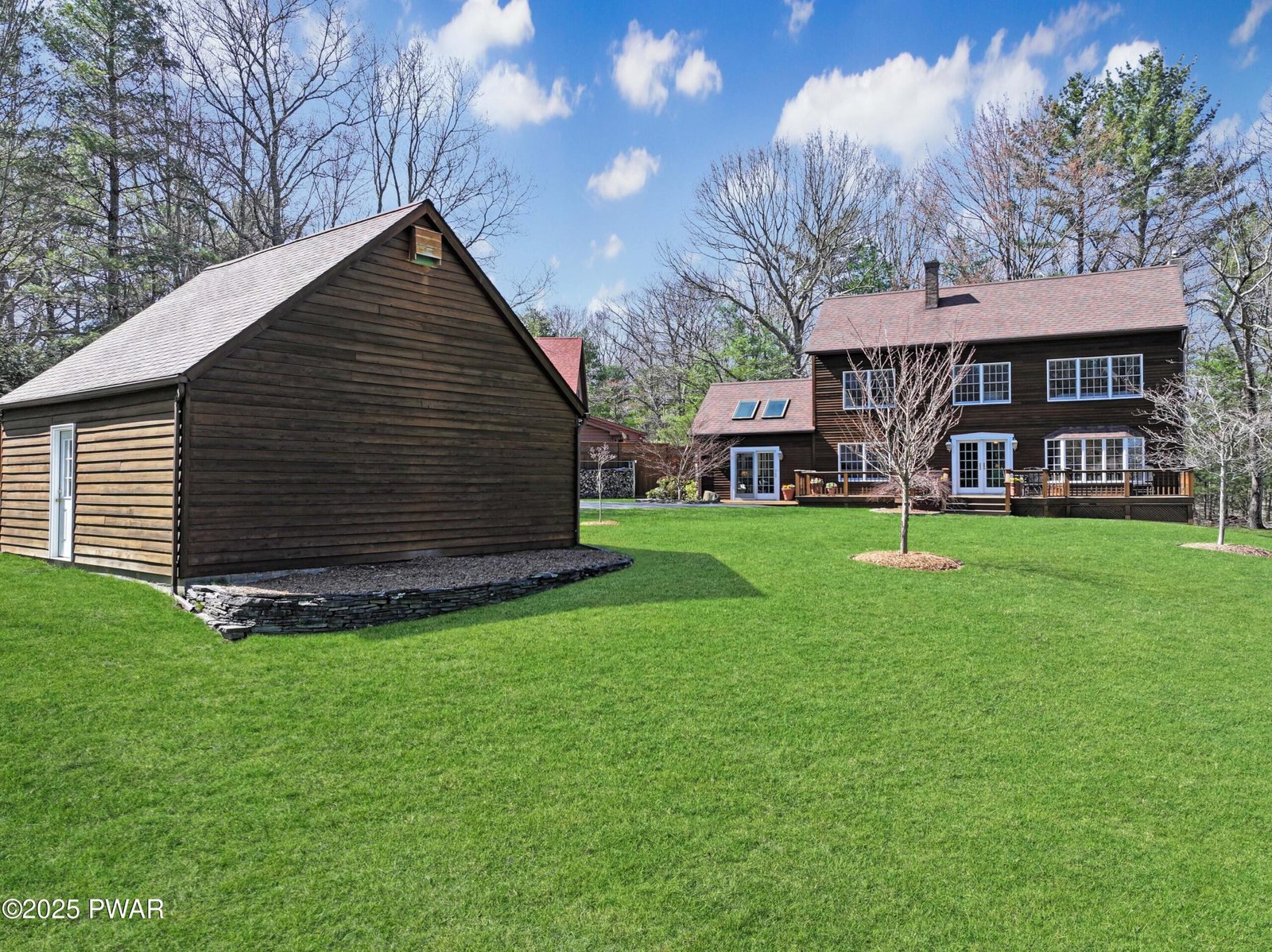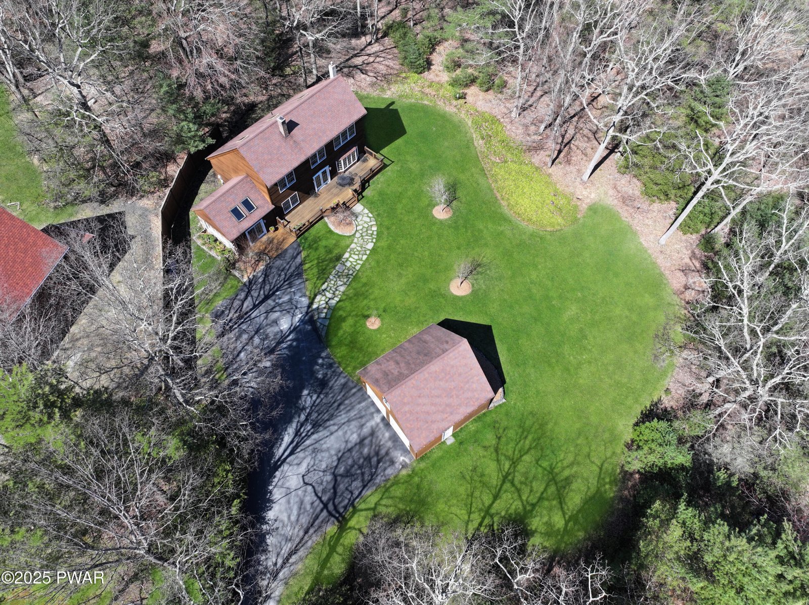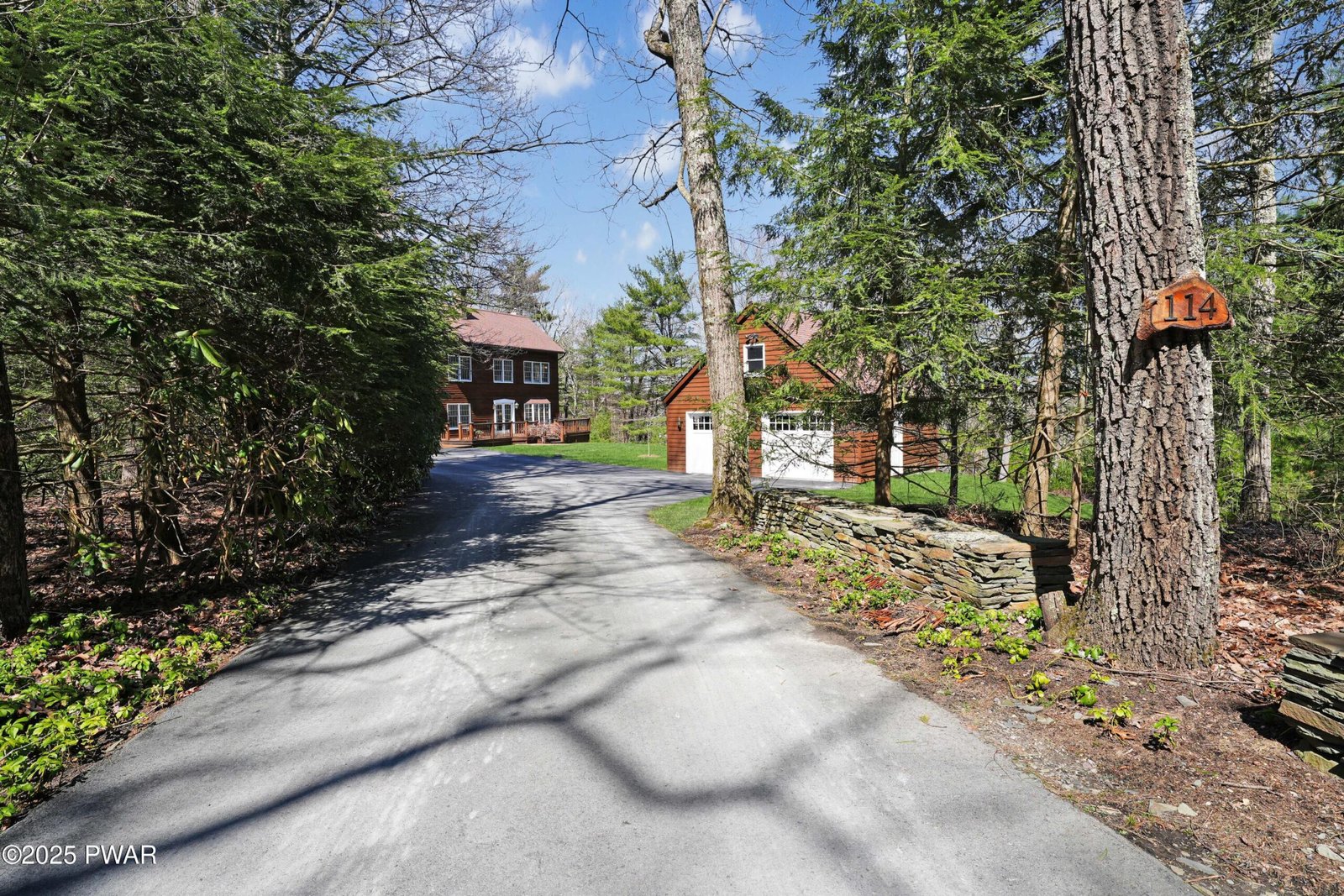 STUNNING POST & BEAM MASTERPIECE-THE PINNACLE OF POCONOS LUXURY! Welcome to this exceptional 3 bed, 2.5 bath custom-built post & beam home, a rare gem tucked away amongst the unmatched tranquil beauty of Shohola. Designed with timeless elegance & built with craftsmanship that's second to none, this residence embodies luxury mountain living at its finest. Set on lush, park-like grounds, the home is wrapped in rich cedar siding that immediately captivates as you travel down the paved driveway, passing a striking two-story detached garage built in matching post and beam style. This private oasis is nestled among towering trees & vibrant gardens, offering peace, privacy & a constant connection to nature. Step into the four-season sunroom, where wall-to-wall windows & two oversized skylights bathe the space in natural light. Kept perfectly comfortable year-round with an energy-efficient mini-split system, it's the ideal spot for morning coffee as you watch the seasons change. The heart of the home unfolds in the open-concept living room, dining area, & farmhouse kitchen, all framed by handcrafted exposed wood beams. The double-sided brick fireplace adds both warmth & charm, casting a soft glow across the hardwood flooring & drawing the eye to every carefully curated detail. The kitchen is a charming chef's delight & the intuitive layout that makes entertaining a joy. A finely appointed guest bedroom & full bath round out the main level. Upstairs, an open loft with soaring ceilings elevate the ambiance of your home office or library nook. The second guest bedroom features a generous walk-in closet, while the primary en-suite is a true sanctuary with knotty pine cathedral ceilings, panoramic windows, & a spa-inspired bath with a jacuzzi tub, skylight, & steam sauna shower. A massive walk-in closet completes the sanctuary. Downstairs, the fully finished basement boasts a family room with propane stove, half bath & full 2nd kitchenideal for an in-law or guest suite.