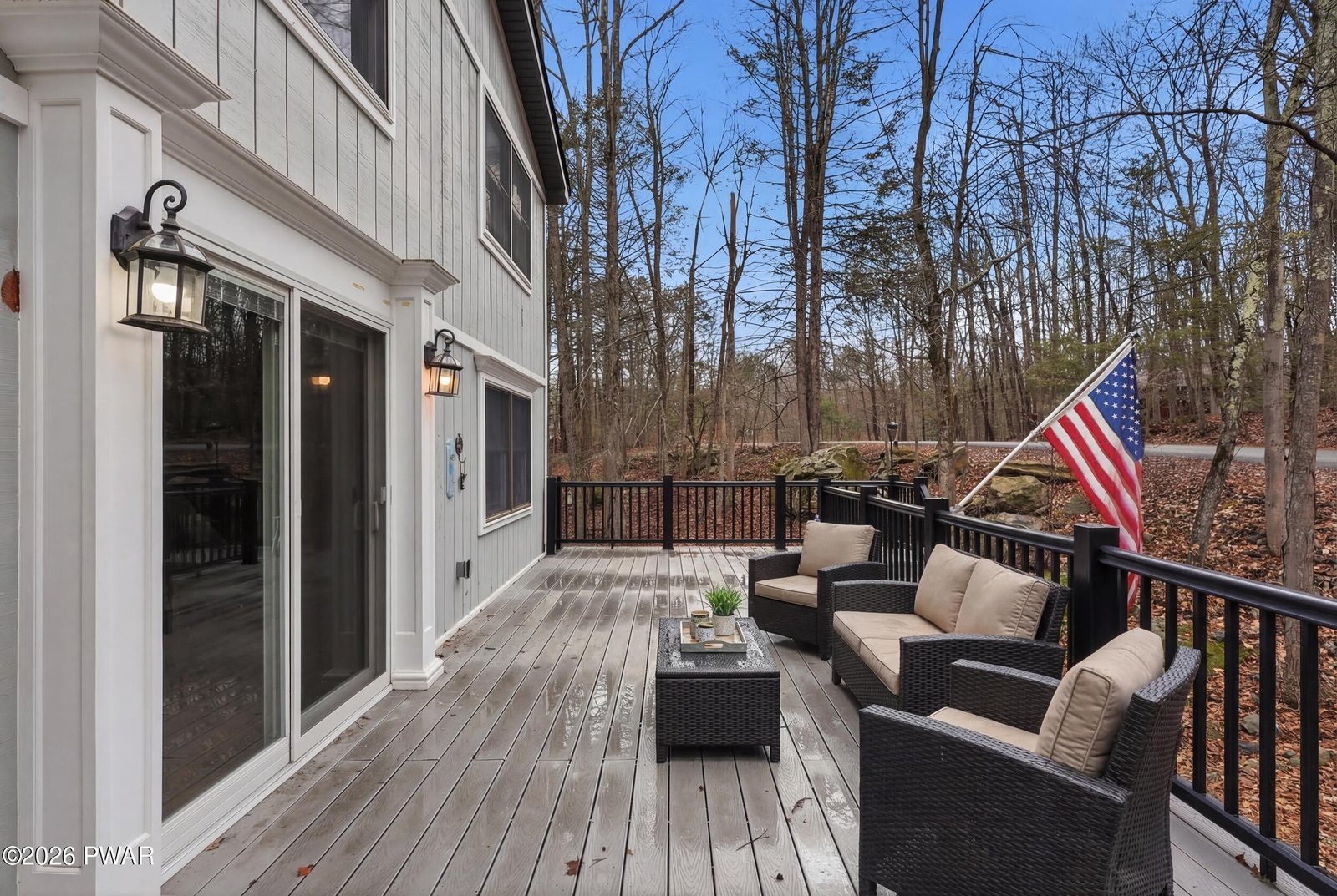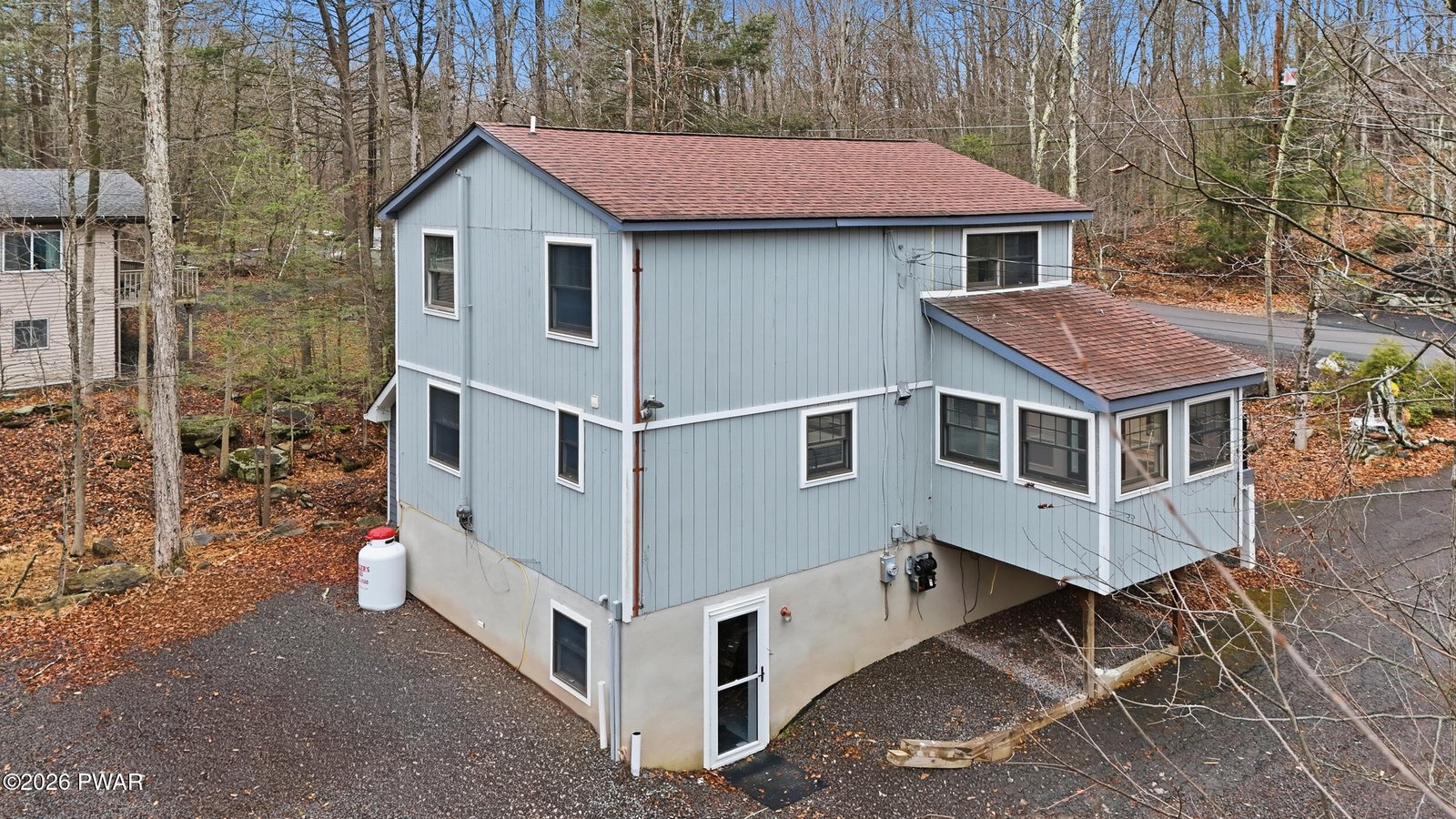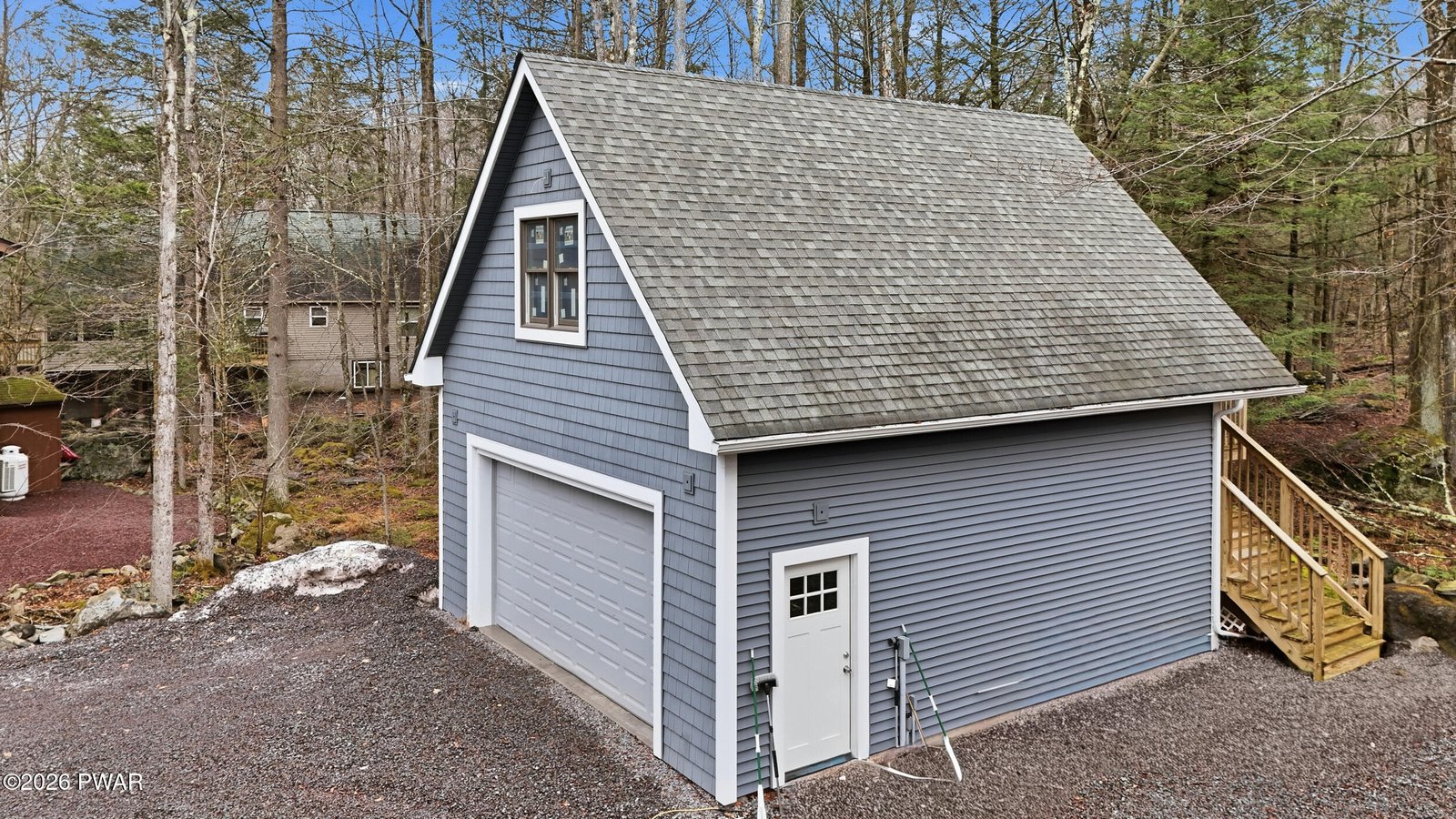 Completely gutted and remodeled contemporary home tucked away on a quiet road in the amenity-filled community of The Hideout, located approximately 2 hours from Metro NY and Philadelphia. This thoughtfully redesigned property blends modern style with high-end finishes and quality craftsmanship throughout, far from your typical renovation. The main level features a bright open layout with real hardwood flooring, recessed lighting, a beautifully remodeled kitchen with center island, stainless steel appliances, farmhouse sink, and custom backsplash, all flowing seamlessly into the living and dining area anchored by a fireplace and large windows bringing in natural light, with easy access to the expansive deck overlooking the peaceful wooded setting. Upstairs, the primary bedroom suite offers a walk-in closet and a beautifully finished ensuite bathroom featuring imported tile and upscale finishes, while the home also showcases solid, heavy real wood interior doors throughout and attention to detail rarely found in today's renovations. The upper level includes an additional spacious sitting/living area that provides flexible sleeping space for guests, making a third bedroom unnecessary while still offering plenty of room to host. The fully finished lower level features a large rec room area and another full bathroom, creating the perfect space for a game room, media room, or additional guest space. The home includes three full bathrooms, one on each level, providing convenience and privacy for family and visitors. Outside you'll find a detached two-car garage with unfinished space above ready for future expansion, ideal for a guest suite, studio, or additional living area. Set on a great lot on a quiet road, the location offers privacy while still being close to all the amenities The Hideout has to offer, including multiple lakes and beaches, golf course, ski hill, pools, clubhouse, restaurants, tennis courts, fitness center, walking trails, and year-round activities.
