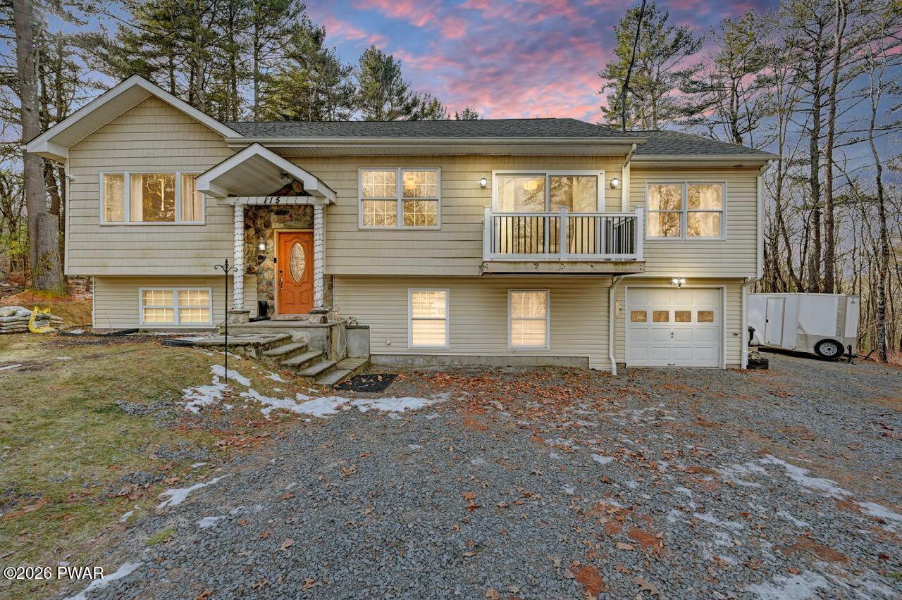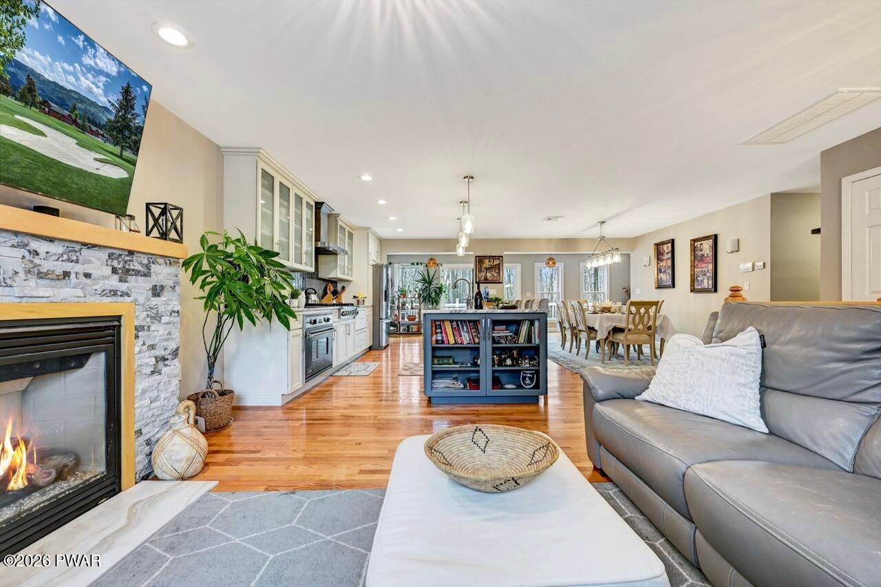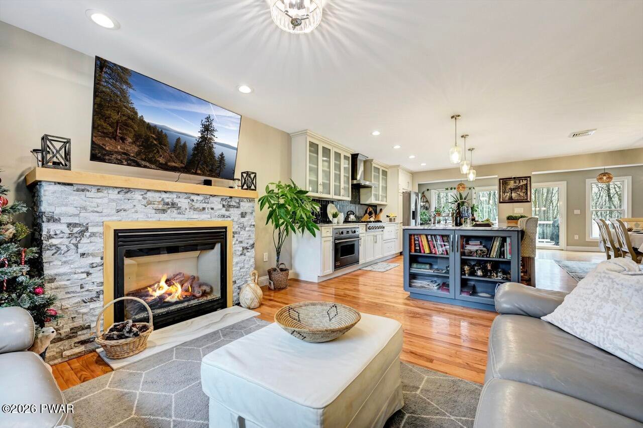 Welcome to a home where comfort, style, and well-being come together seamlessly. Fully remodeled and thoughtfully designed, 115 Pine Brook Road offers two beautifully finished levels of living space for relaxation, connection, and elevated entertaining. The main level features an open-concept layout ideal for family functions. The living room is highlighted by a beautifully appointed fireplace, creating an inviting space for gatherings. The gourmet kitchen (equipped with Viking, Thor, and Whirlpool appliances) features an oversized island with seating for four and flows effortlessly into the dining area, perfect for intimate dinners or lively celebrations. Central A/C and forced-air heating ensure year-round comfort. The primary suite is a private retreat with its own fireplace and spa-inspired en-suite bathroom, complete with a whirlpool tub, walk-in shower, and double vanity. Two additional spacious bedrooms, a shared seating area, and a full bathroom complete this level. The lower level expands lifestyle possibilities with a large family room and dramatic floor-to-ceiling stone fireplace, ideal for movie nights or game days. Two versatile rooms (currently used as fitness and music rooms) can easily become a yoga studio, creative space, or guest accommodations. A full bathroom and six-person cedar dry sauna bring daily rejuvenation right into your home. Step outside to the back deck overlooking a private wooded setting, perfect for morning coffee, meditation, or evening entertaining. Additional features include a large workshop, deep one-car garage, whole-house generator, and central vacuum system. Conveniently located just 10 minutes from historic Milford's dining, shopping, and entertainment, 30 minutes to Lake Wallenpaupack, and 5 minutes to I-84. This home offers secluded elegance with easy access to everything.