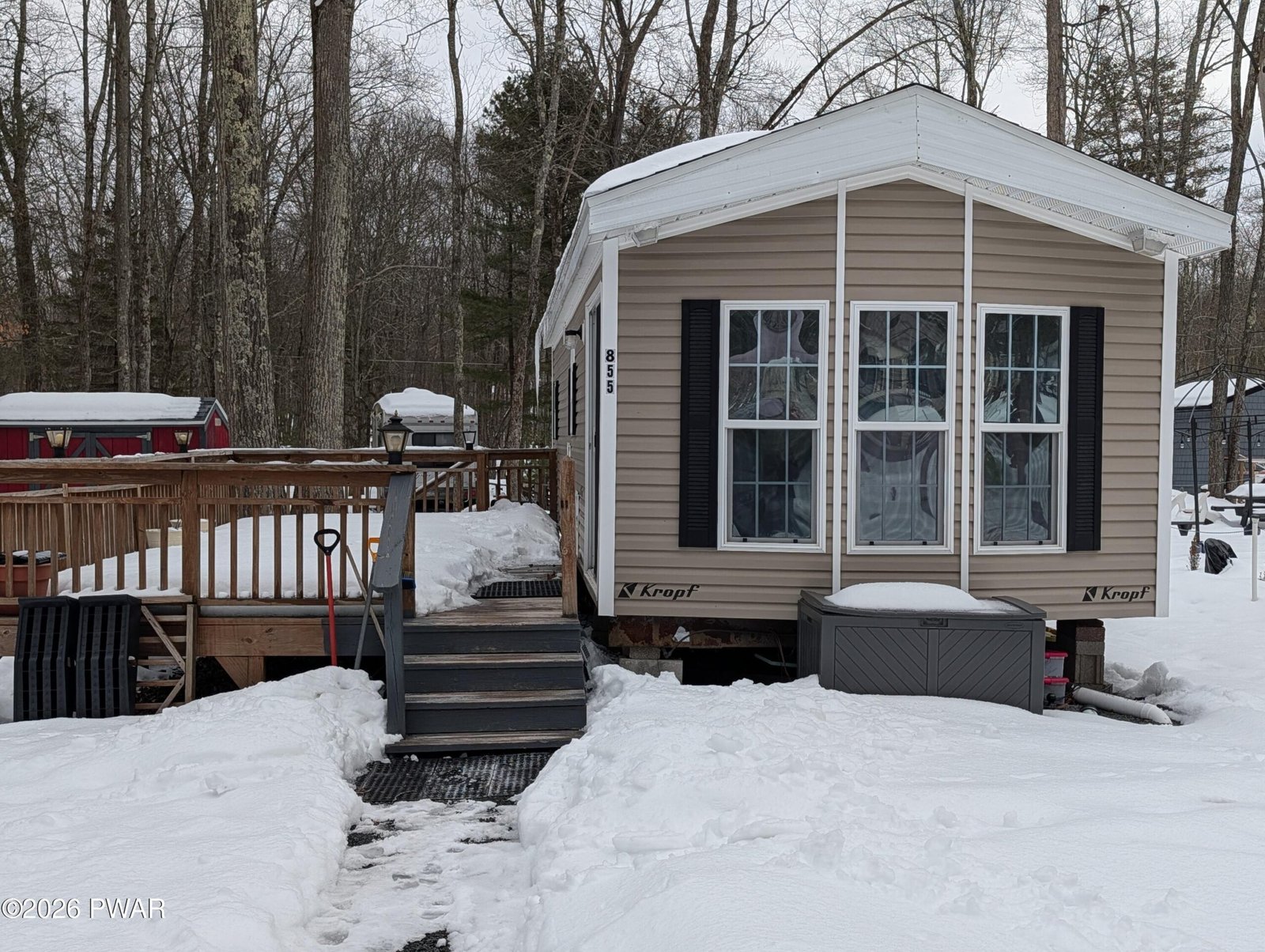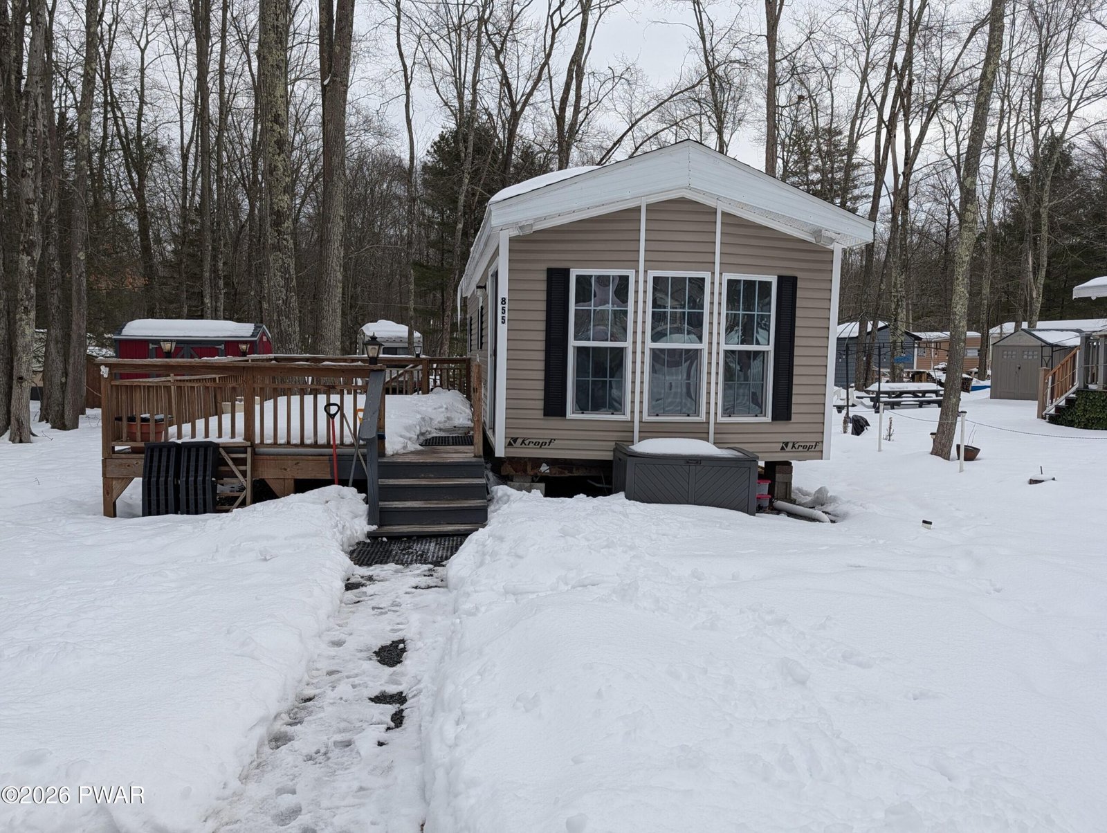 Welcome to this beautiful, meticulous vacation home!! Spotless, and on a flat lot with a huge deck for your outdoor entertaining needs. Owner is adamant about keeping a clean home and picturesque setting. Trailer features high ceilings, wider than normal floorplan, and an unbelievable amount of storage!! This property is adorable, and makes a very comfy and cozy home that you will be proud to own. Deck will be painted the same color as shed before closing. Brand new roof gives you peace of mind. Close to lake and your stored kayaks/canoes, and within walking distance to all amenities, which include mini golf, new pickleball courts, basketball, tennis, outdoor pool, lake access, clubhouse. WATER, SEWER & ELECTRIC INCLUDED IN DUES!! A great property that is a must see!!!