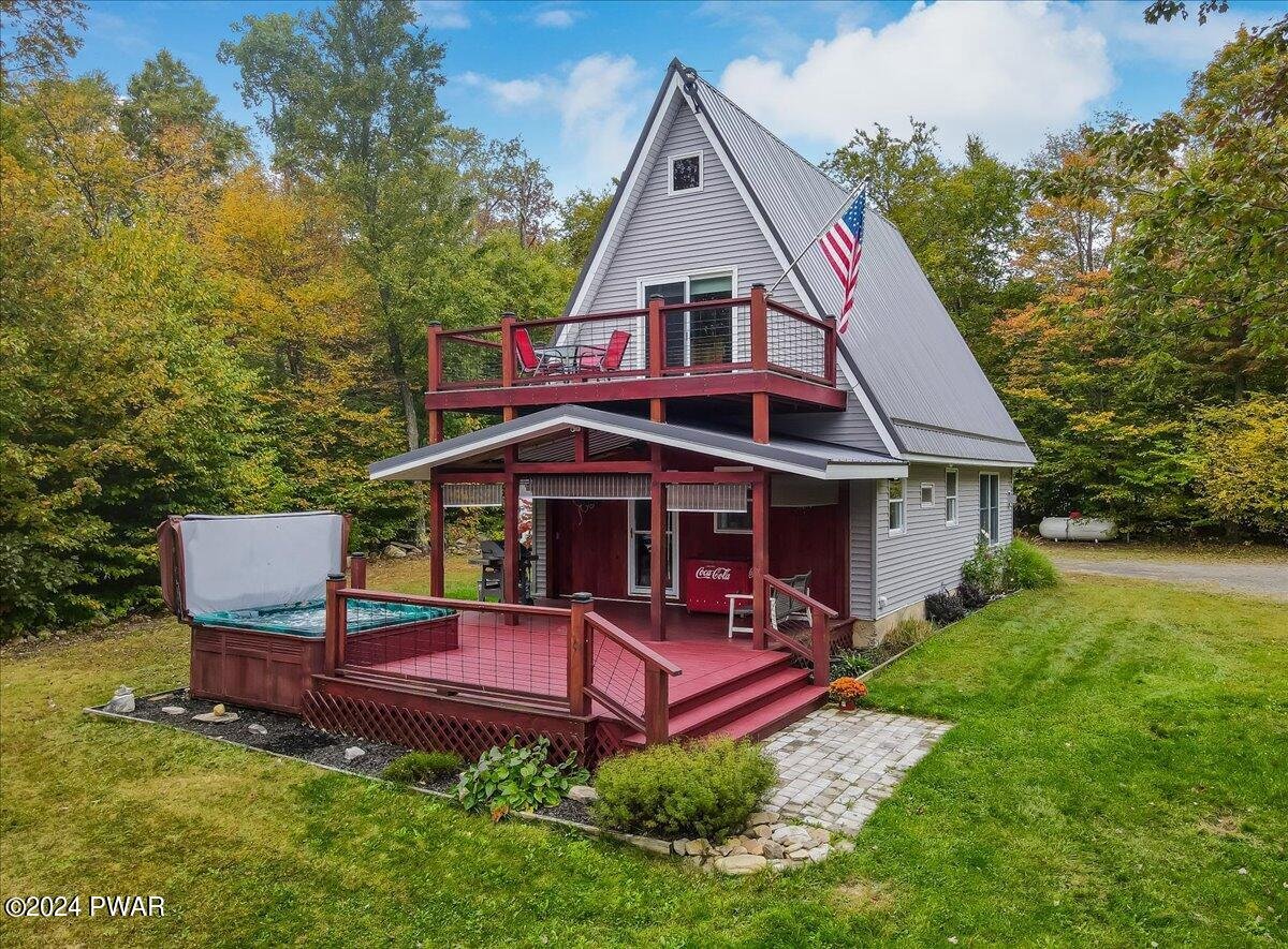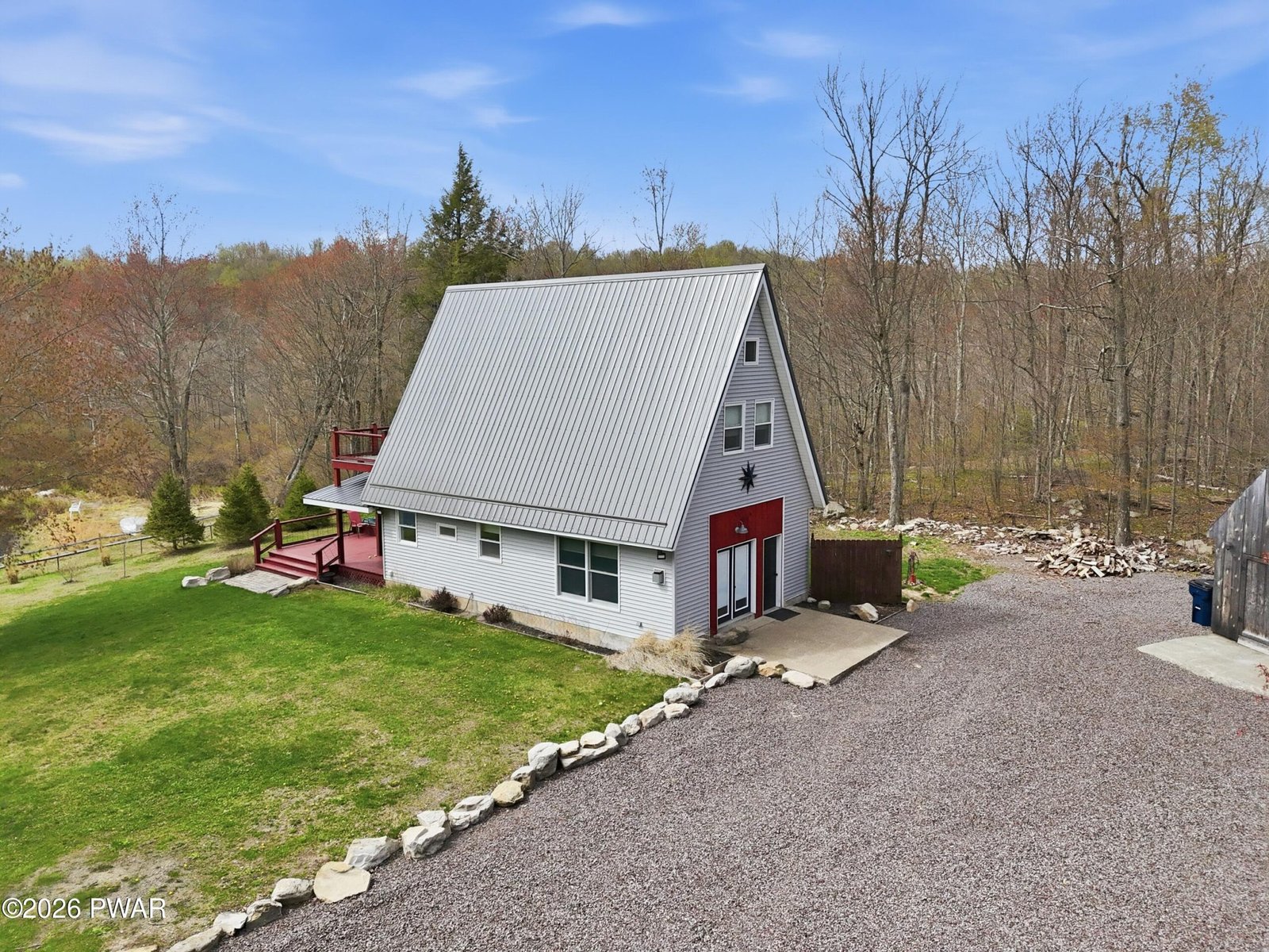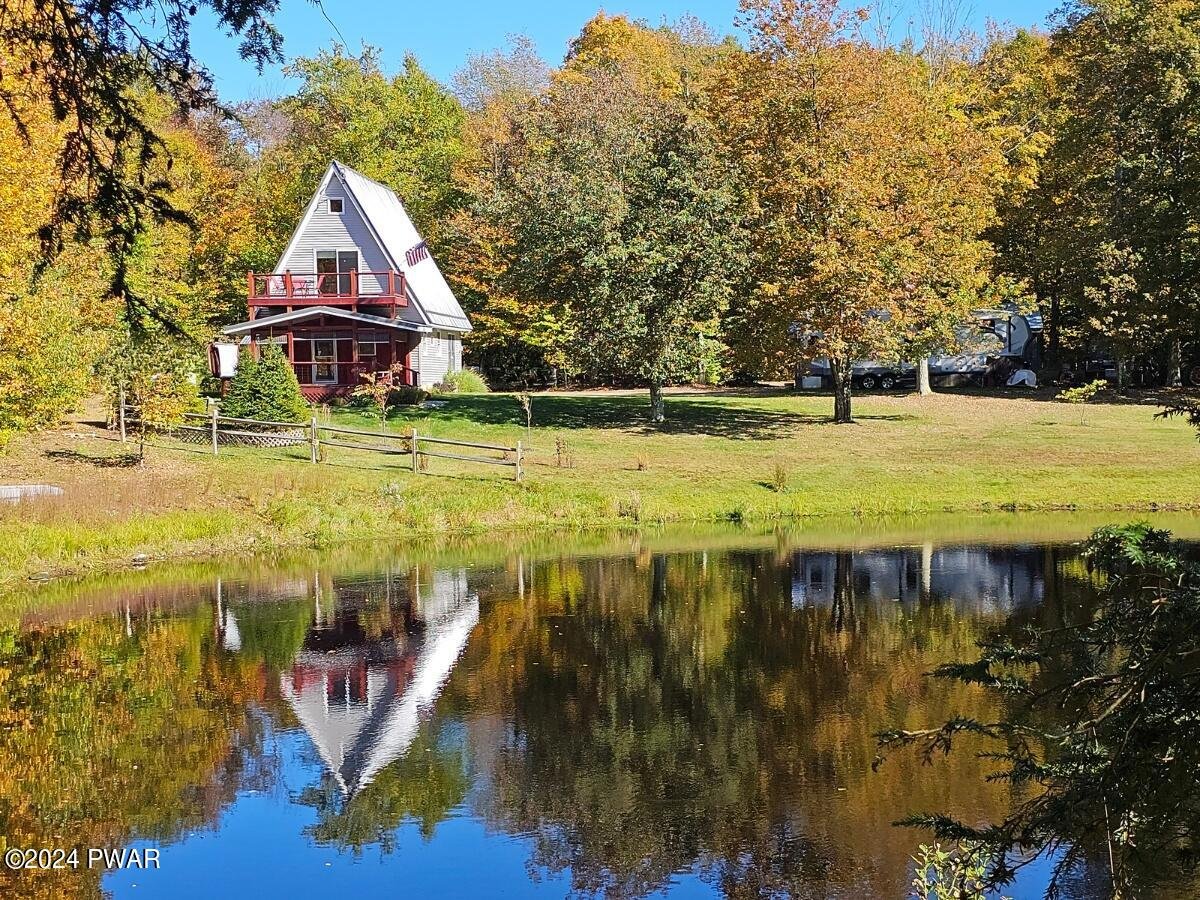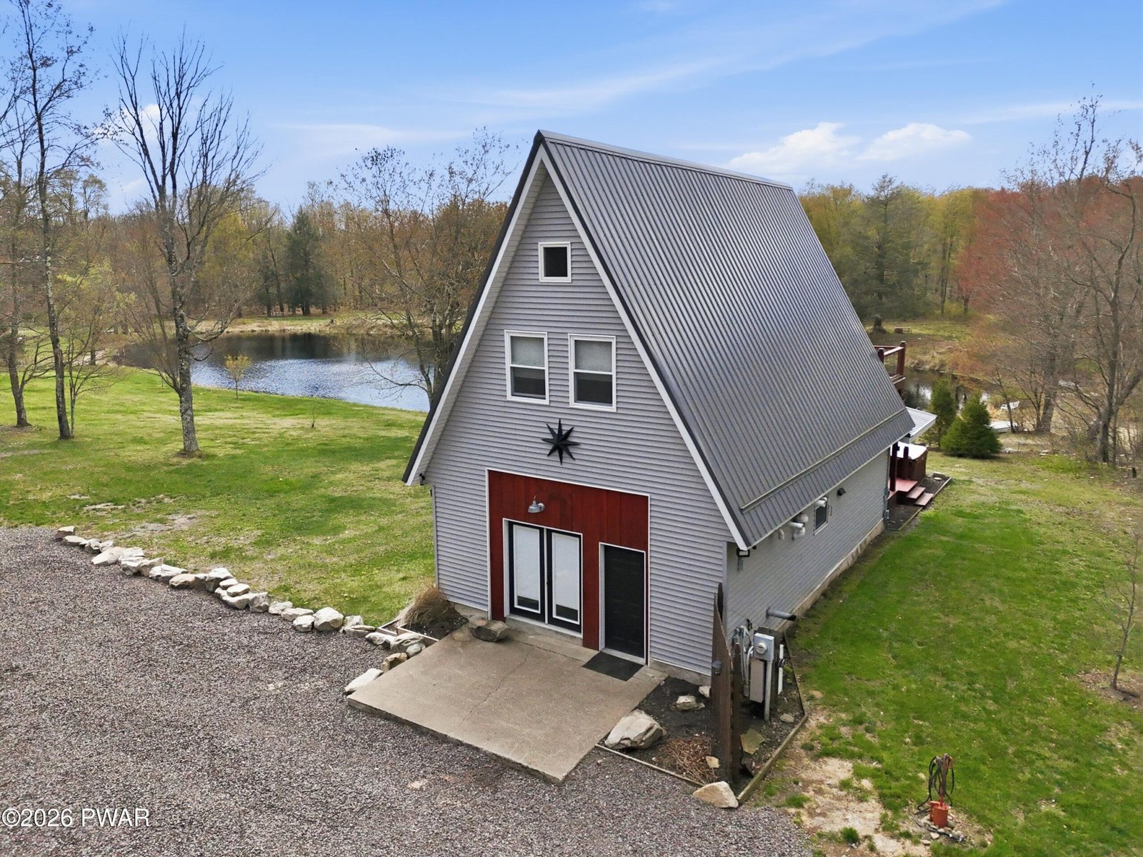 WATERFRONT chalet -style cabin on 1.9 acres w/ frontage on a private community pond. 1 bedroom + sleeping loft, 1.5 baths, & a layout that efficiently uses every bit of its 1,271 square feet. Wood beams, cathedral ceilings, large windows that pull the outside in. The main level has a living room w/propane fireplace, dining area, full bath, & laundry room. The kitchen has granite counters, center island, double wall oven, & a gas cooktop, giving this home a touch of luxury. The back door opens onto a covered deck with a hot tub and water views. Upstairs: a bedroom, sleeping loft with ladder access, a half bath, and a family room with a dry bar and a slider to the upper deck. (The view TOTALLY justifies the need for the second deck). Outside there's a 571 sq ft garage w/heat & electric, large utility shed, Generac whole-house generator, & invisible fencing to keep your doggos home. The newly-graveled parking area has plenty of parking room for guests and even an RV. But wait! There's more: metal roof, vinyl siding, pellet stove, radon system. So many essential boxes checked!Sterling Forest is a small residential community in southern Wayne County (Western Wayne School District). No expensive amenities = a low HOA fee. Just the pond, woods, and the trees doing their job. It's 15-20 mins to Daleville where you'll find a shopping center, restaurants, etc. You're 20-30 mins (+/-) from the Scranton area: Steamtown, the RailRiders, Montage Mountain skiing in winter & waterpark in summer. Stores, hospitals, restaurants, & a real airport are all a quick drive. Nearby Dickson City provides many shopping & dining opportunities. Push the other direction and the rest of the Poconos opens up. Lake Wallenpaupack is about 35 mins out for boating and fishing, and within an hour you can be at Camelback, Delaware Water Gap, or any of the state parks and trail systems the region is known for. Here's your chance to own an upgraded, year-round cabin on a budget and without compromise!