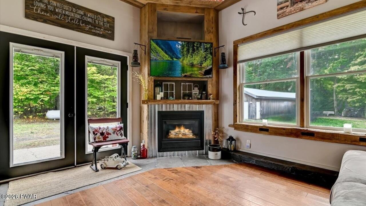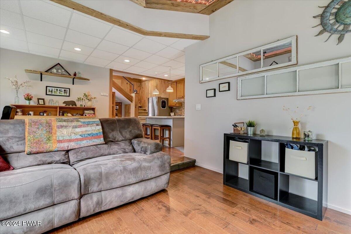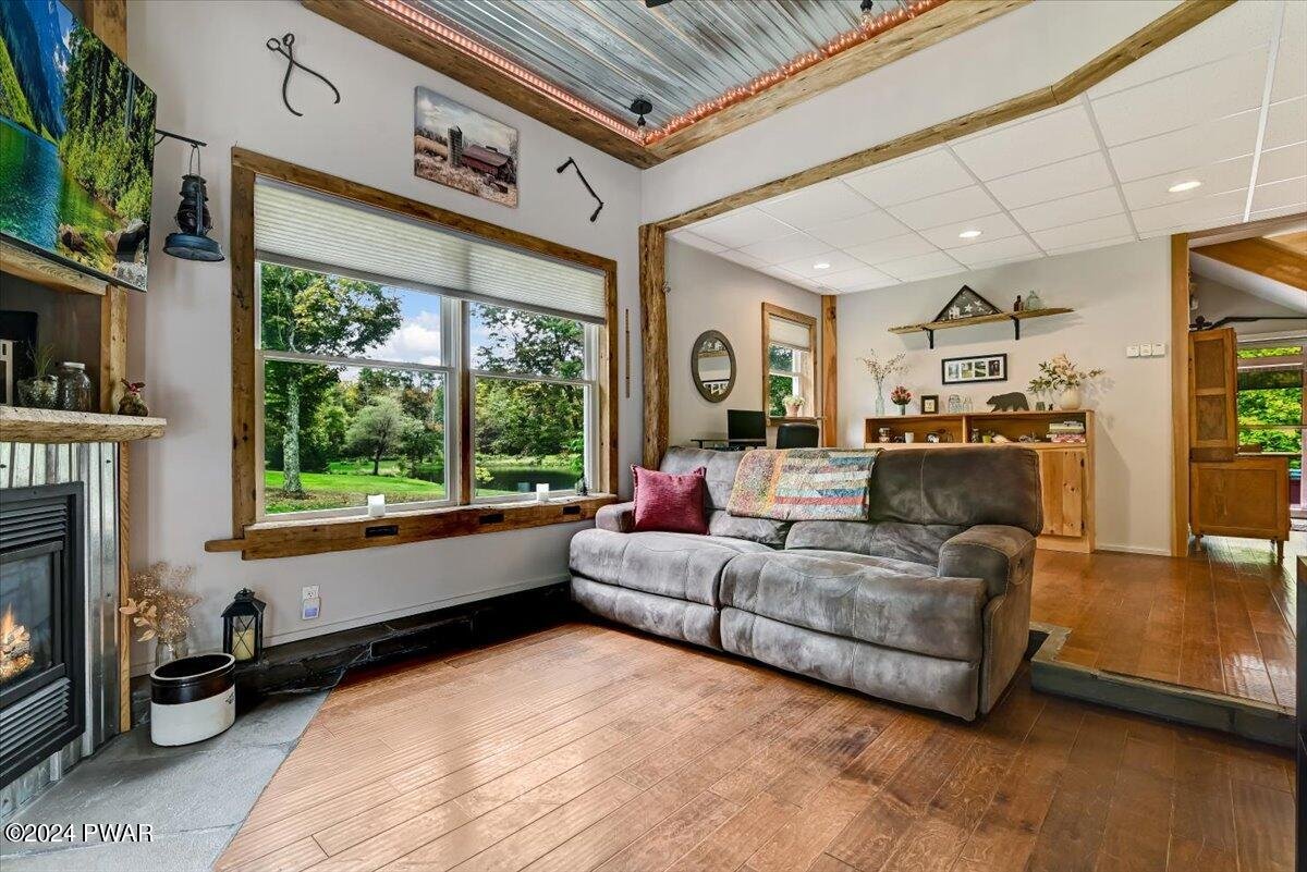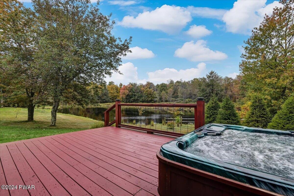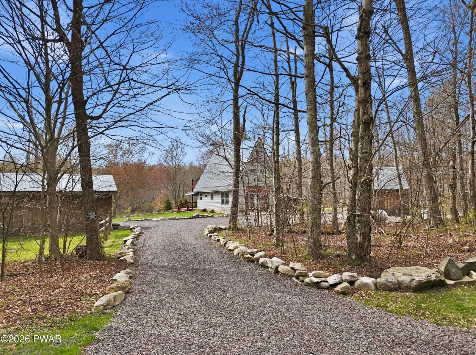 WATERFRONT chalet -style cabin on 1.9 acres w/ frontage on a private community pond. 1 bedroom + sleeping loft, 1.5 baths, & a layout that efficiently uses every bit of its 1,271 square feet. Wood beams, cathedral ceilings, large windows that pull the outside in. The main level has a living room w/propane fireplace, dining area, full bath, & laundry room. The kitchen has granite counters, center island, double wall oven, & a gas cooktop, giving this home a touch of luxury. The back door opens onto a covered deck with a hot tub and water views. Upstairs: a bedroom, sleeping loft with ladder access, a half bath, and a family room with a dry bar and a slider to the upper deck. (The view TOTALLY justifies the need for the second deck). Outside there's a 571 sq ft garage w/heat & electric, large utility shed, Generac whole-house generator, & invisible fencing to keep your doggos home. The newly-graveled parking area has plenty of parking room for guests and even an RV. But wait! There's more: metal roof, vinyl siding, pellet stove, radon system. So many essential boxes checked!Sterling Forest is a small residential community in southern Wayne County (Western Wayne School District). No expensive amenities = a low HOA fee. Just the pond, woods, and the trees doing their job. It's 15-20 mins to Daleville where you'll find a shopping center, restaurants, etc. You're 20-30 mins (+/-) from the Scranton area: Steamtown, the RailRiders, Montage Mountain skiing in winter & waterpark in summer. Stores, hospitals, restaurants, & a real airport are all a quick drive. Nearby Dickson City provides many shopping & dining opportunities. Push the other direction and the rest of the Poconos opens up. Lake Wallenpaupack is about 35 mins out for boating and fishing, and within an hour you can be at Camelback, Delaware Water Gap, or any of the state parks and trail systems the region is known for. Here's your chance to own an upgraded, year-round cabin on a budget and without compromise!