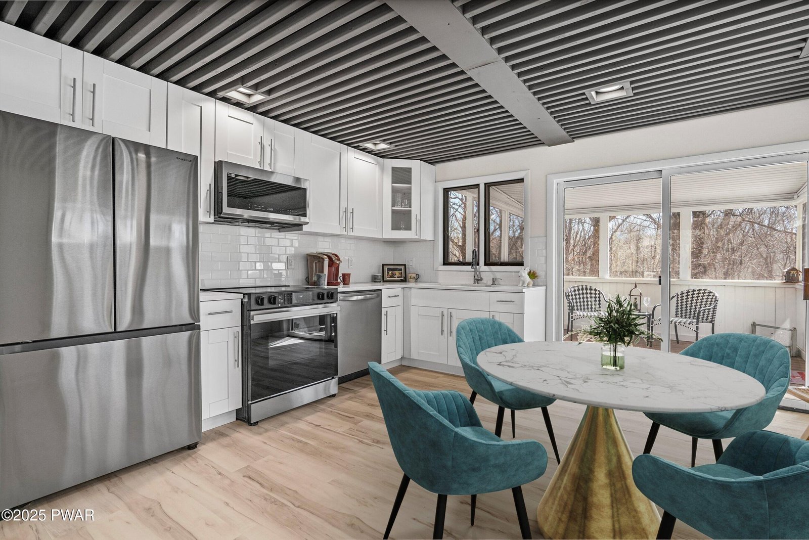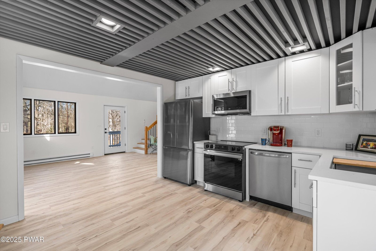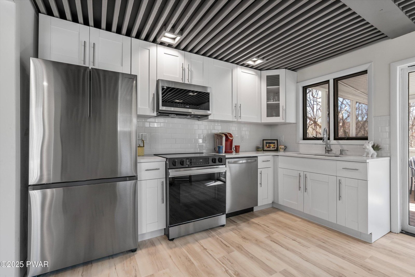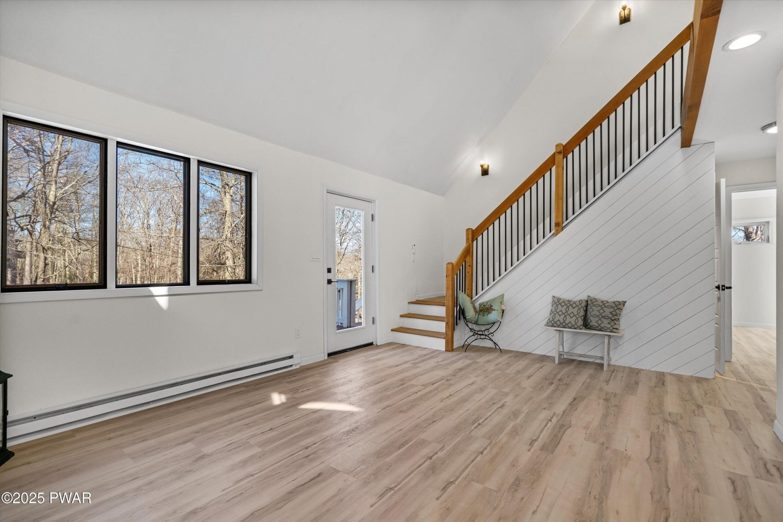 Welcome to the good life in Hemlock Farms! This completely remodeled home is a true gem, designed for both comfort and privacy. Paired with an open-concept main living area, find a beautiful, modern fireplace that creates a cozy centerpiece. Following the custom-crafted kitchen ceiling that leads directly to a peaceful screened porch--perfect for morning coffee or evening relaxation. * Home is virtually staged for visualization* The main floor features the primary bedroom, complete with a personal balcony, and closet so spacious it could easily double as an office or nursery. A convenient half-bath on this level is perfect for guests. Upstairs, a spacious loft provides an ideal flex space, along with a guest bedroom and full bath. The lower level is an entertainer's dream, featuring a charming coffee bar, a family room with a propane stove, a third bedroom, and a third full bath. With an attached garage, this home truly has it all.