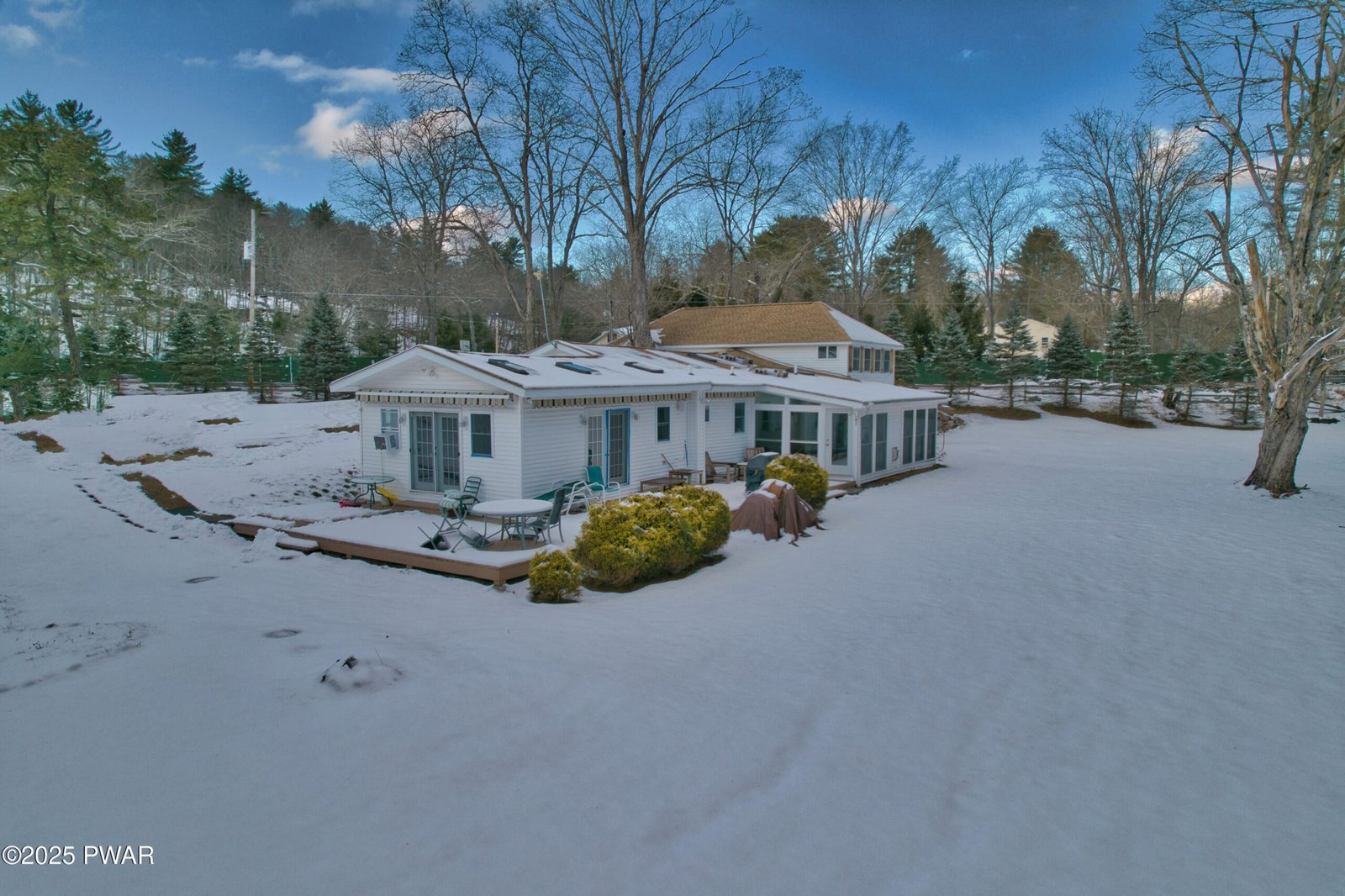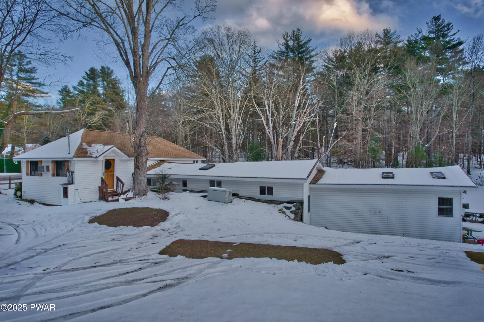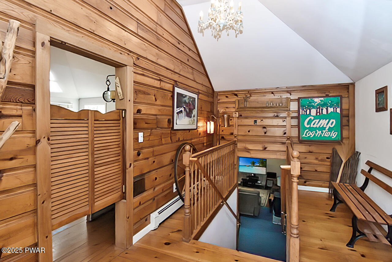 10.6 ACRES, CREEK/STREAM AND NO COMMUNITY!!!Own a piece of history in Dingmans Ferry! Family members were the original owners of Camp Log-N-Twig .Offices and Canteen were converted into this unique sloping ranch home. Knotty pine walls and beautiful 'Heart of Pine' wide plank flooring greet you upon entrance. Used as a private residence for many years now, this 3 bedroom, 2 bath home features high ceilings, with primary bedroom/bath with gorgeous T & G ceilings with sliders out to a deck so you can listen to the creek trickling. Open concept Living room/kitchen and dining area. There is a dedicated office space ideal for remote work or hobbies. Warm and charming details offer rustic appeal throughout. Sun drenched all season room with floor to ceiling windows and gas stove provides the perfect spot to view your country oasis. A convenient laundry area adds everyday functionality. Outdoors the property is well-equipped including your own antique outdoor stone FP, three outbuildings including a spacious two-car garage and two additional 1 car garages plus a 40 ft. foam insulated shipping container! This unique property offers acreage, water features, and versatile outbuildings for those seeking a rare opportunity for space, privacy and country charm! Full house generator , propane heat (500 gallon underground tank is owned by the seller so you can shop around for best deal) Central Air and so much more! Did I mention the stream/creek that meanders through the property, enjoy hiking, hunting and basic outdoor activities!