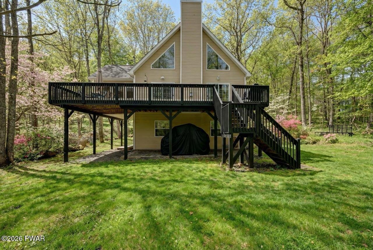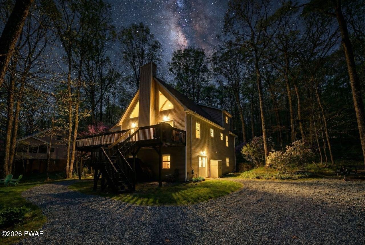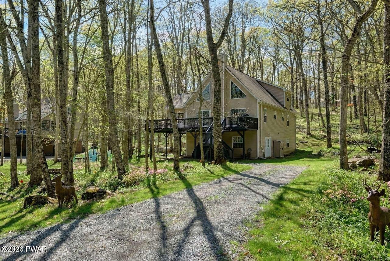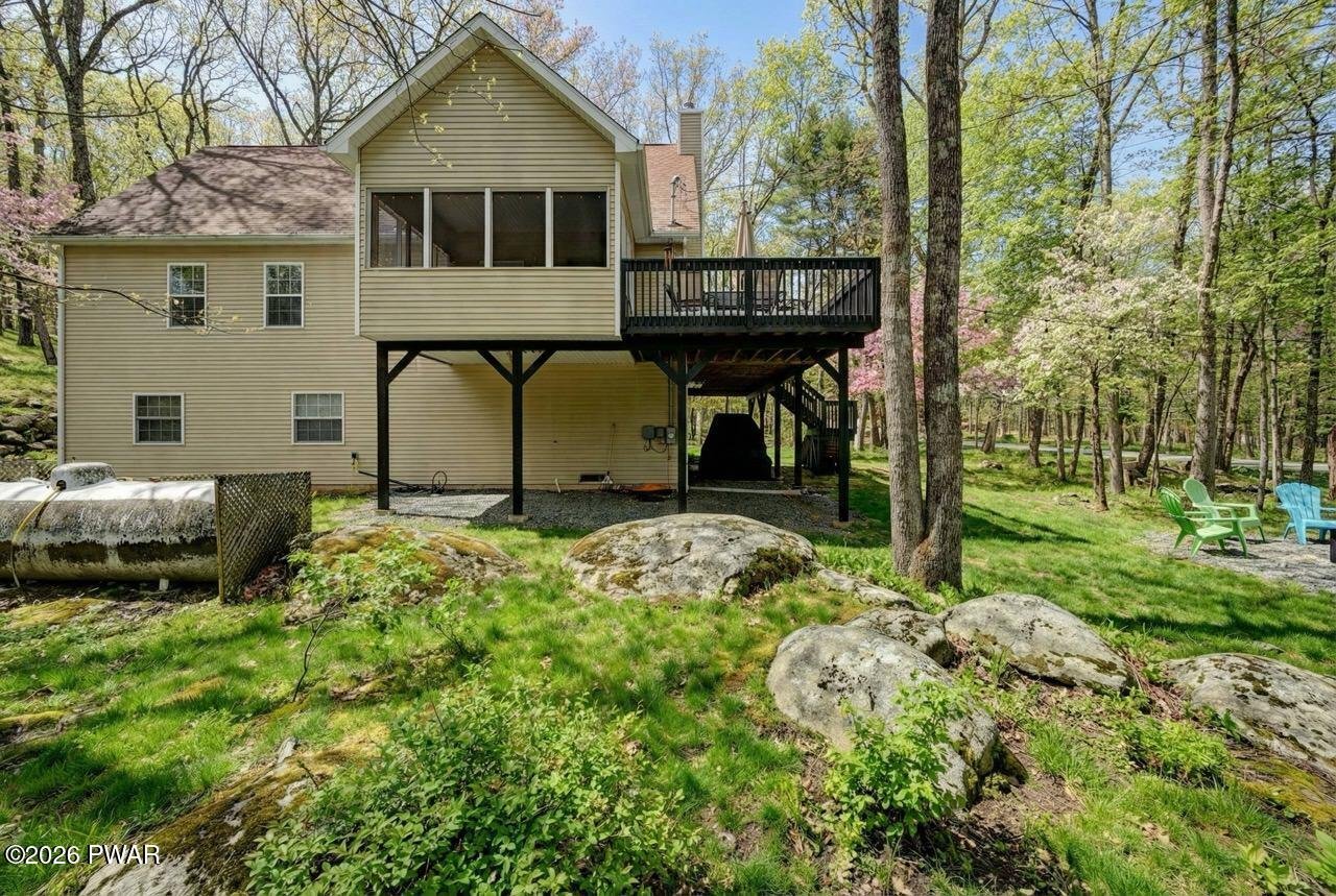 Beautiful like-new chalet located in the Masthope Mountain community. Enjoy an easy walk to the lake/beach area. This spacious home features an open floor plan with 5-6 bedrooms and 4 full bathrooms, including 2 primary bedroom suites with private baths.Designed for comfort and entertaining, the home offers two living rooms, a family/game room, a cozy fireplace, a loft, and a screened-in porch. Additional highlights include a huge mudroom, central air and heating, and abundant living space throughout.Situated on a rare double lot totaling approximately 1.25 acres, the property provides plenty of room to build a large garage. Furniture is negotiable, making this an excellent turn-key opportunity for a full-time residence or mountain getaway.Located in the sought-after Masthope Mountain Community, residents enjoy an exceptional array of amenities including a motor-boating lake with white sandy beach, ATV trails, and an ATV, UTV, and golf-cart-friendly environment. Community features also include a ski lodge with skiing, Summit Bar & Restaurant, tiki bar, two outdoor pools, mini golf, fitness center, horseback riding, pickleball and basketball courts, as well as Delaware River access with a park area.