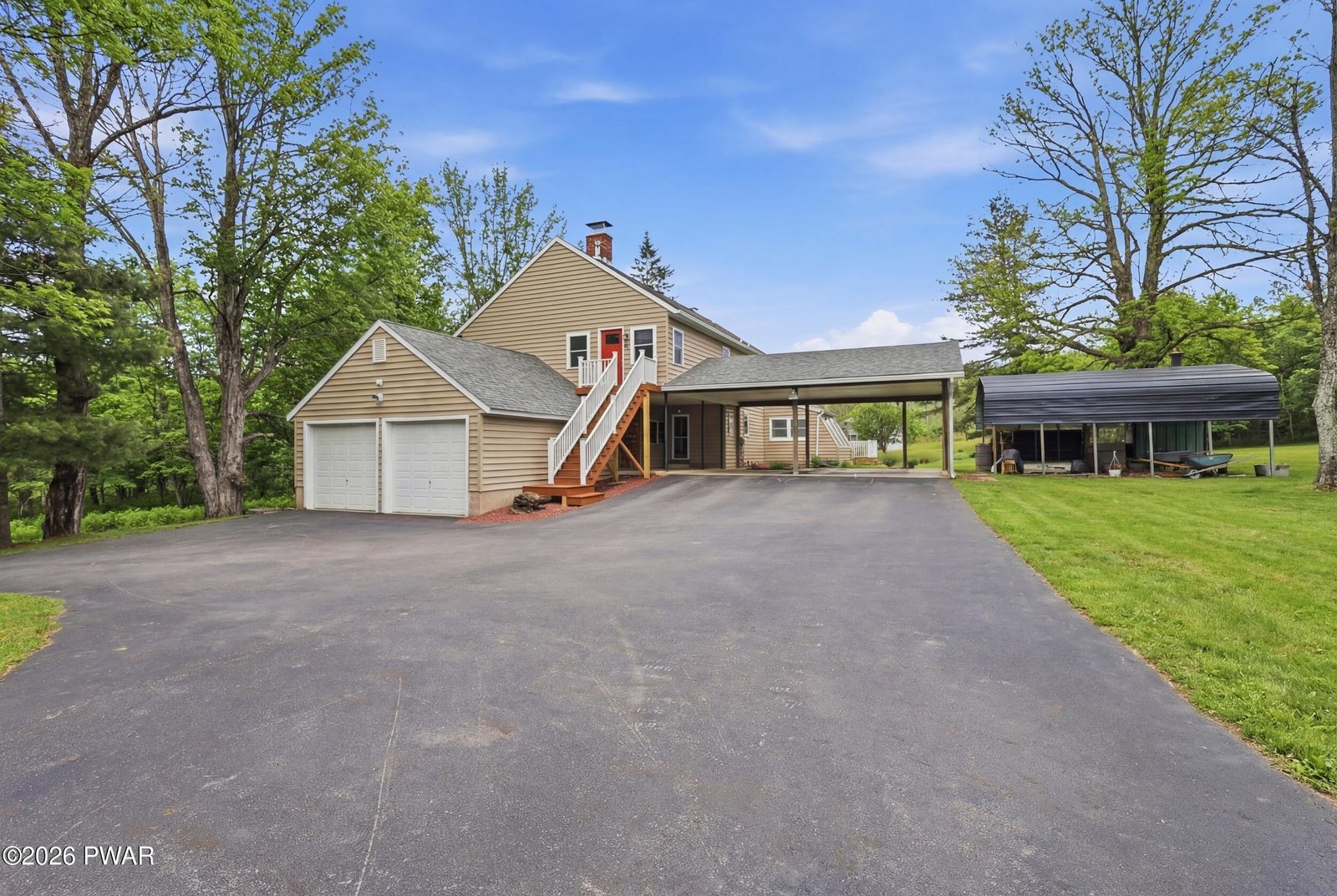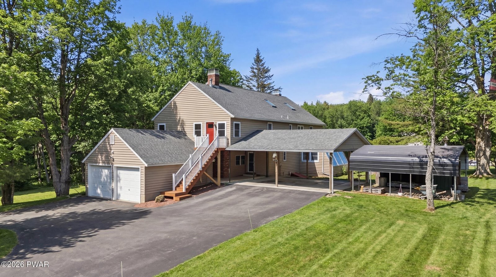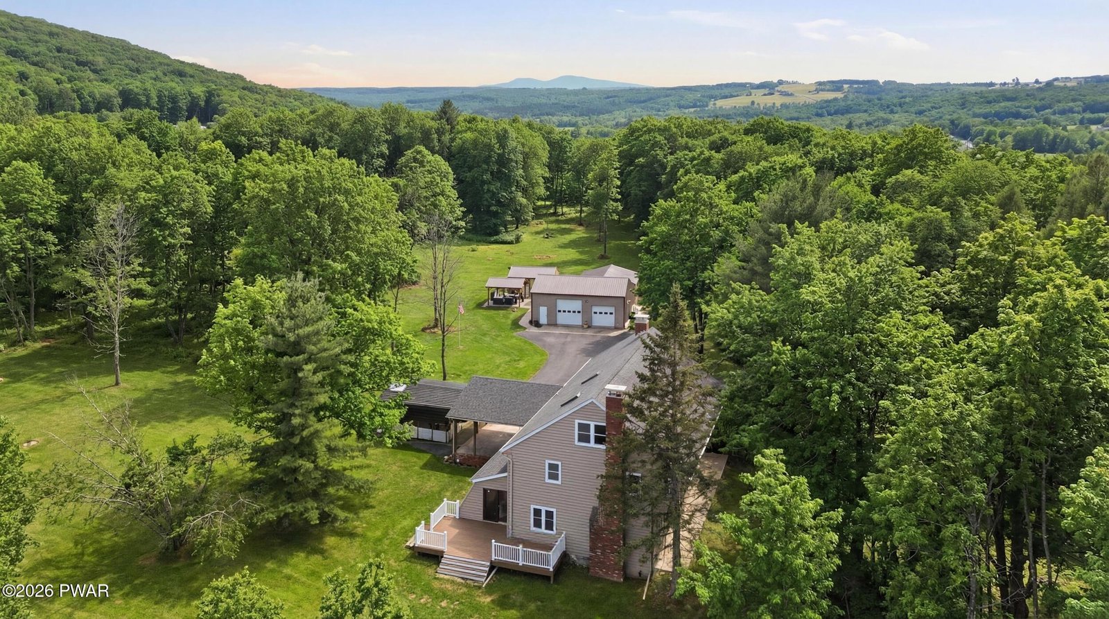 Set across 20 private acres with sweeping views of Elk Mountain, this extraordinary Northern Poconos estate offers a rare combination of space, privacy, recreation, and unforgettable entertaining areas. A long winding driveway welcomes you through open lawn, mature trees, and apple and pear trees with blueberry bushes scattered throughout the property, creating a beautiful natural landscape that feels both peaceful and productive. Perfectly located just 10 minutes to Elk Mountain Ski Resort, 15 minutes to Forest City, and about 40 minutes to Lake Wallenpaupack, the property also features 127 feet of frontage along the Rails & Trails system, allowing direct access for ATV riding, snowmobiling, biking, and year-round outdoor adventure right from your own land. The land itself attracts abundant wildlife and offers incredible opportunities for nature watching, outdoor recreation, and enjoying the natural surroundings right outside your door. The centerpiece of the estate is an impressive 4,000+ square foot, 5-bedroom home positioned to take full advantage of the mountain views and surrounding scenery. Inside, the home offers a spacious and welcoming layout designed for both everyday living and entertaining, featuring beautiful wood accents, an elevated dining area, a bright sunroom with incredible views, and a gourmet kitchen with large center island and custom cabinetry that serves as the heart of the home. Whether hosting gatherings or enjoying quiet mornings overlooking the property, the design blends comfort with function. The third floor has already been plumbed and wired for a future one-bedroom suite, offering excellent flexibility for guests, extended family, or additional rental space. Fiber-optic internet provides lightning-fast connectivity throughout the home, making remote work, streaming, and smart home living seamless. Beyond the home, the property transforms into a true lifestyle compound with incredible amenities rarely found together.