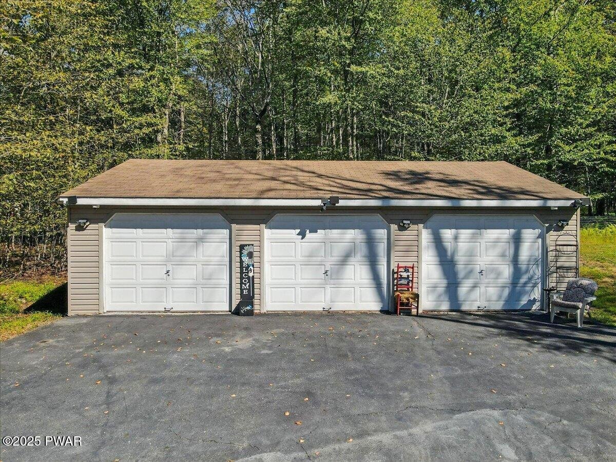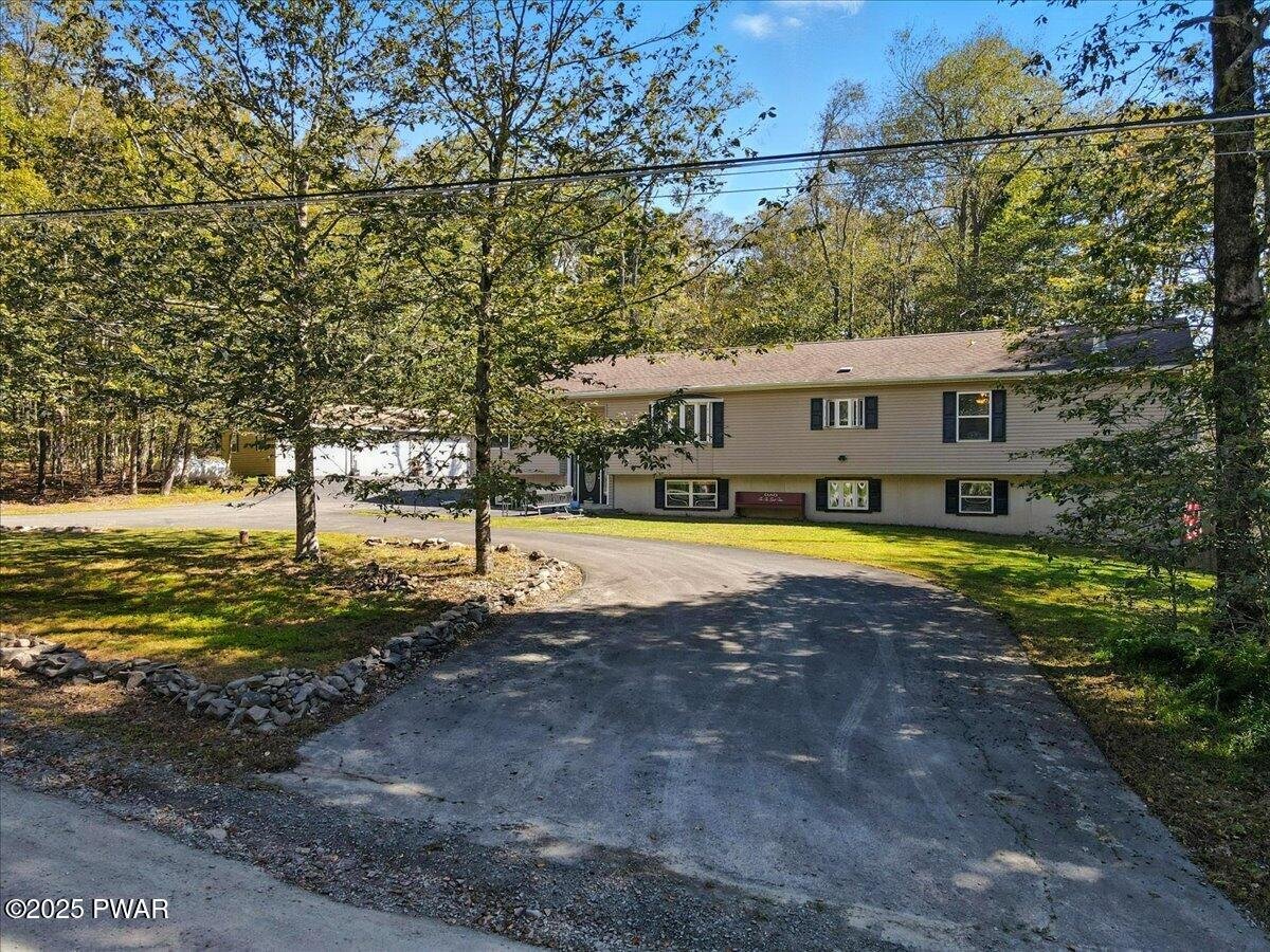 Immaculate raised ranch in Skyview Lake. Welcome to this gorgeous, supersized bi-level home in the desirable Skyview Lake community--a true blend of comfort, space, and lifestyle. Immaculately maintained, this property offers everything you need for everyday living, entertaining, and enjoying the Pocono lifestyle. Spacious & Stylish Interiors. Step inside to a large open-concept floor plan with beautiful hardwood flooring. The heart of the home features a bright and airy living room, a spacious kitchen with solid-surface countertops, and a welcoming dining area perfect for gatherings. The family room with a wood-burning fireplace sets the stage for cozy evenings. Luxurious Primary Suite. Retreat to a spectacular primary suite complete with a huge walk-in closet and a primary bath that feels like a spa--featuring a deep jetted tub, double vanity, abundant cabinetry, and a massive walk-in shower. Two additional large bedrooms and a second full bath provide plenty of room for family and guests. Endless Possibilities. The partially finished basement offers a bonus room (possible 4th bedroom), is plumbed for a third bath, and includes a convenient walk-out. The real showstopper? A massive 3-car detached garage--perfect for storing toys, setting up a workshop, or creating your dream hobby space. Outdoor Living & Location. A large deck overlooks the level, landscaped yard--ideal for entertaining or simply relaxing. This prime location is just steps to Wilson Creek Lake, a stone's throw from Promised Land State Forest, minutes from Route 84, and only 15 minutes to Lake Wallenpaupack. Whether it's boating, hiking, or simply enjoying the serenity, this home puts it all at your fingertips. The Best of Skyview Lake Living with space, updates, and even a home generator hook up, this home is perfect as a full-time residence, vacation retreat, or investment property. Bring your quads & snowmobiles!