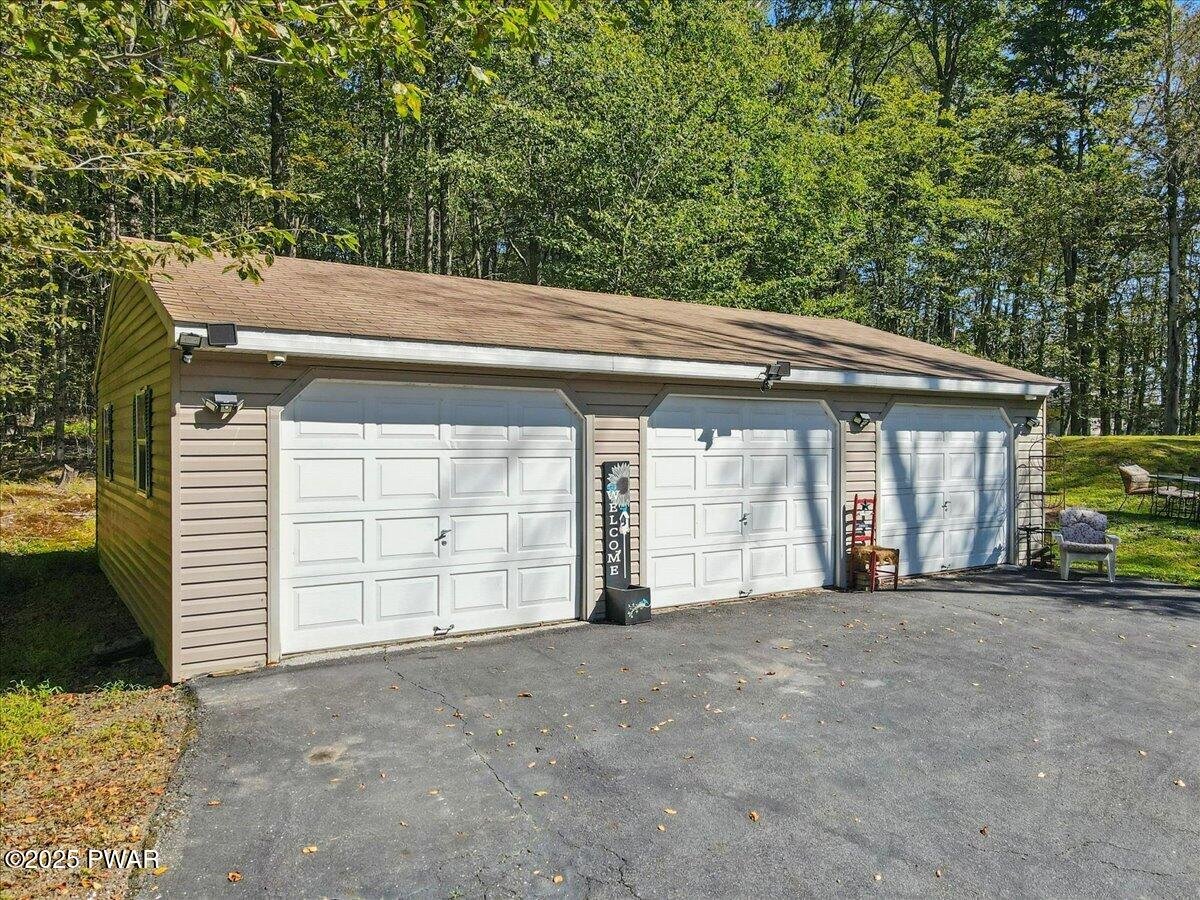 Immaculate raised ranch in Skyview Lake. Welcome to this gorgeous, supersized bi-level home in the desirable Skyview Lake community--a true blend of comfort, space, and lifestyle. Immaculately maintained, this property offers everything you need for everyday living, entertaining, and enjoying the Pocono lifestyle. Spacious & Stylish Interiors. Step inside to a large open-concept floor plan with beautiful hardwood flooring. The heart of the home features a bright and airy living room, a spacious kitchen with solid-surface countertops, and a welcoming dining area perfect for gatherings. The family room with a wood-burning fireplace sets the stage for cozy evenings. Luxurious Primary Suite. Retreat to a spectacular primary suite complete with a huge walk-in closet and a primary bath that feels like a spa--featuring a deep jetted tub, double vanity, abundant cabinetry, and a massive walk-in shower. Two additional large bedrooms and a second full bath provide plenty of room for family and guests. Endless Possibilities. The partially finished basement offers a bonus room (possible 4th bedroom), is plumbed for a third bath, and includes a convenient walk-out. The real showstopper? A massive 3-car detached garage--perfect for storing toys, setting up a workshop, or creating your dream hobby space. Outdoor Living & Location. A large deck overlooks the level, landscaped yard--ideal for entertaining or simply relaxing. This prime location is just steps to Wilson Creek Lake, a stone's throw from Promised Land State Forest, minutes from Route 84, and only 15 minutes to Lake Wallenpaupack. Whether it's boating, hiking, or simply enjoying the serenity, this home puts it all at your fingertips. The Best of Skyview Lake Living with space, updates, and even a home generator hook up, this home is perfect as a full-time residence, vacation retreat, or investment property. Bring your quads & snowmobiles!