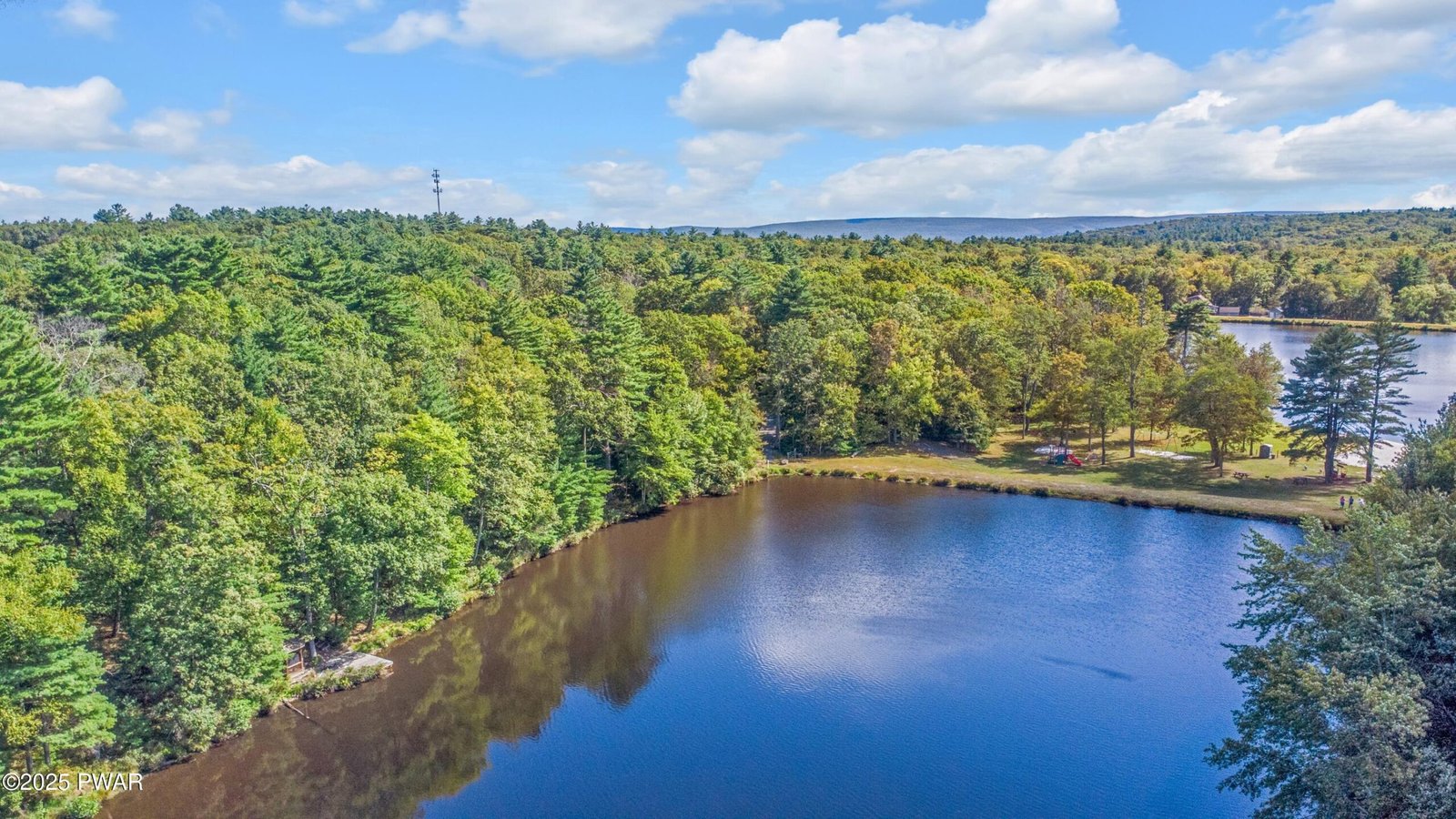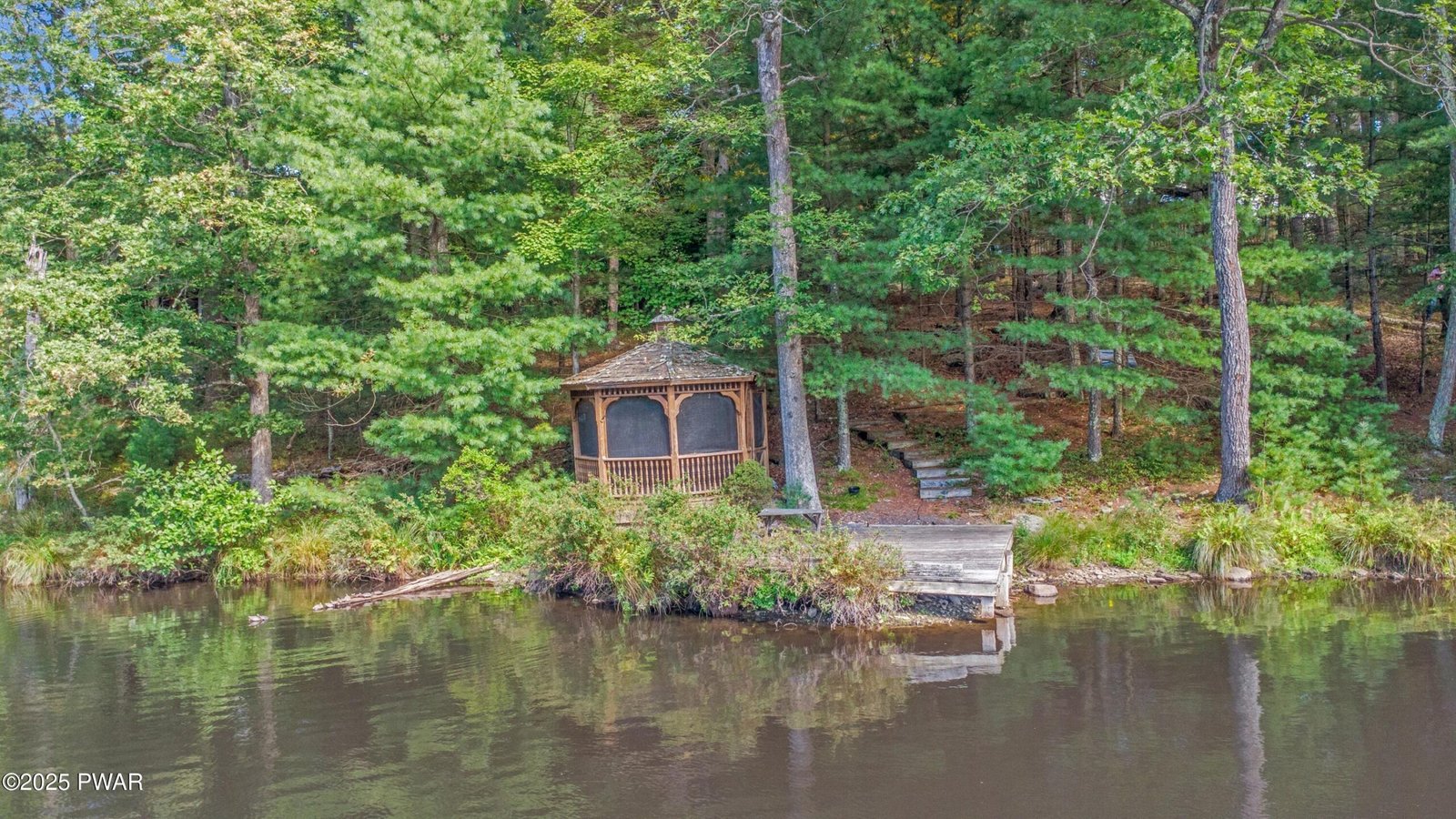 On a wooded acre with 200 feet of direct lake frontage, this 3-bedroom, 2-bath ranch with attached garage is set in a peaceful mountain community. The home features a kitchen with granite countertops, island bar, hardwood floors and modern appliances. The living room boasts vaulted ceilings and a brick fireplace, while the dining area opens to a lakeside deck with a hot tub. The primary bedroom includes a walk-in closet and private bath, complemented by two additional bedrooms and a full bath. A dedicated laundry area adds convenience. A gentle path leads to the shoreline, where a large dock and screened gazebo sit along the water, creating an ideal spot to enjoy the lakefront setting.