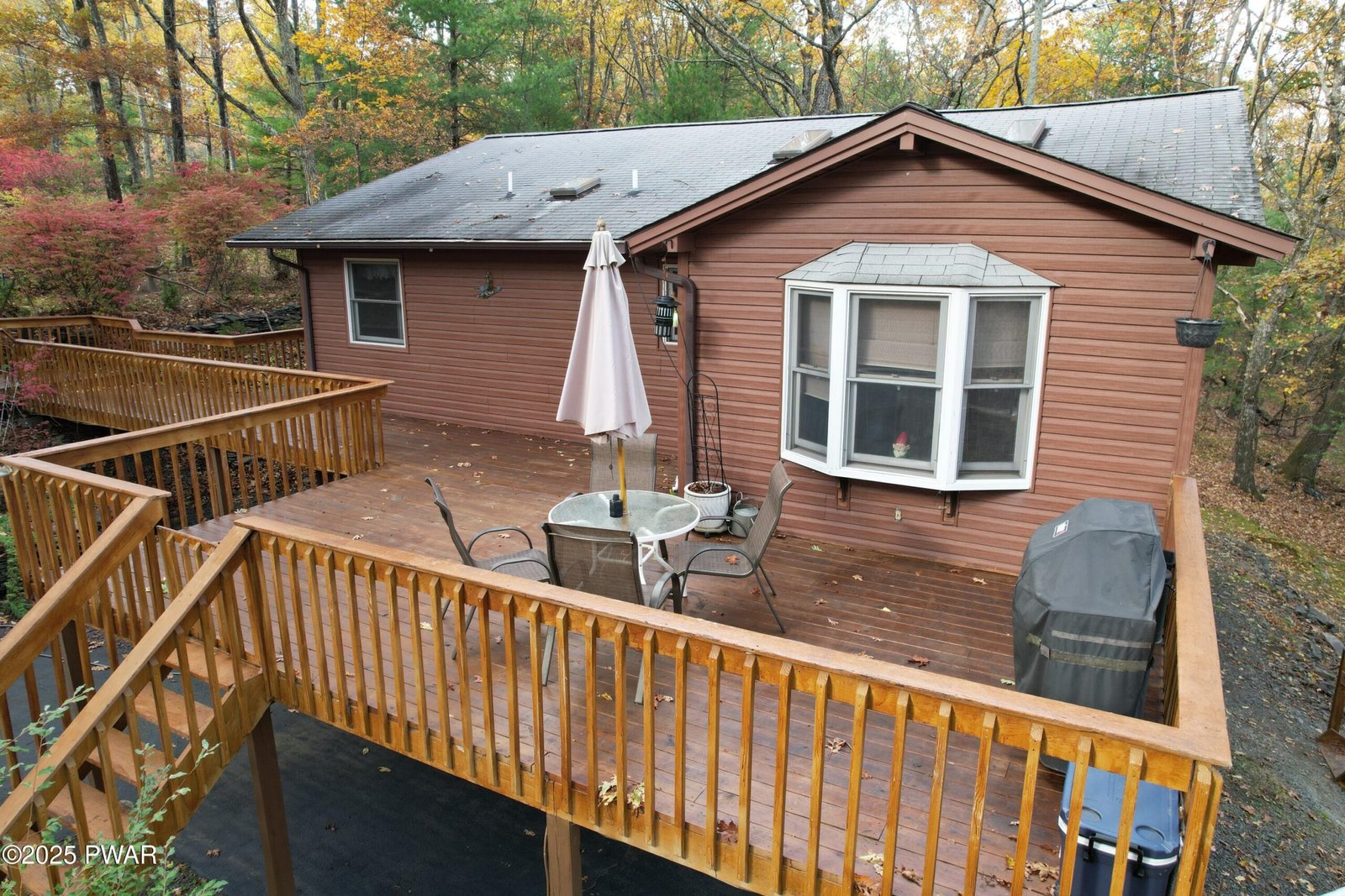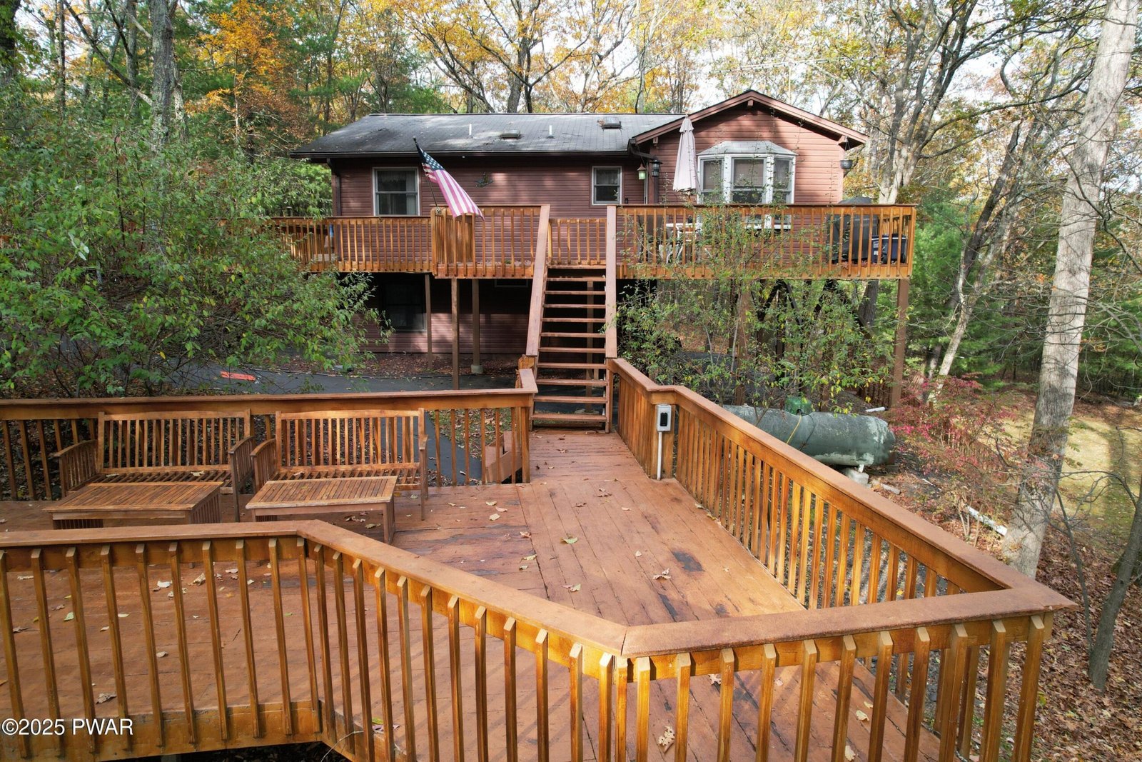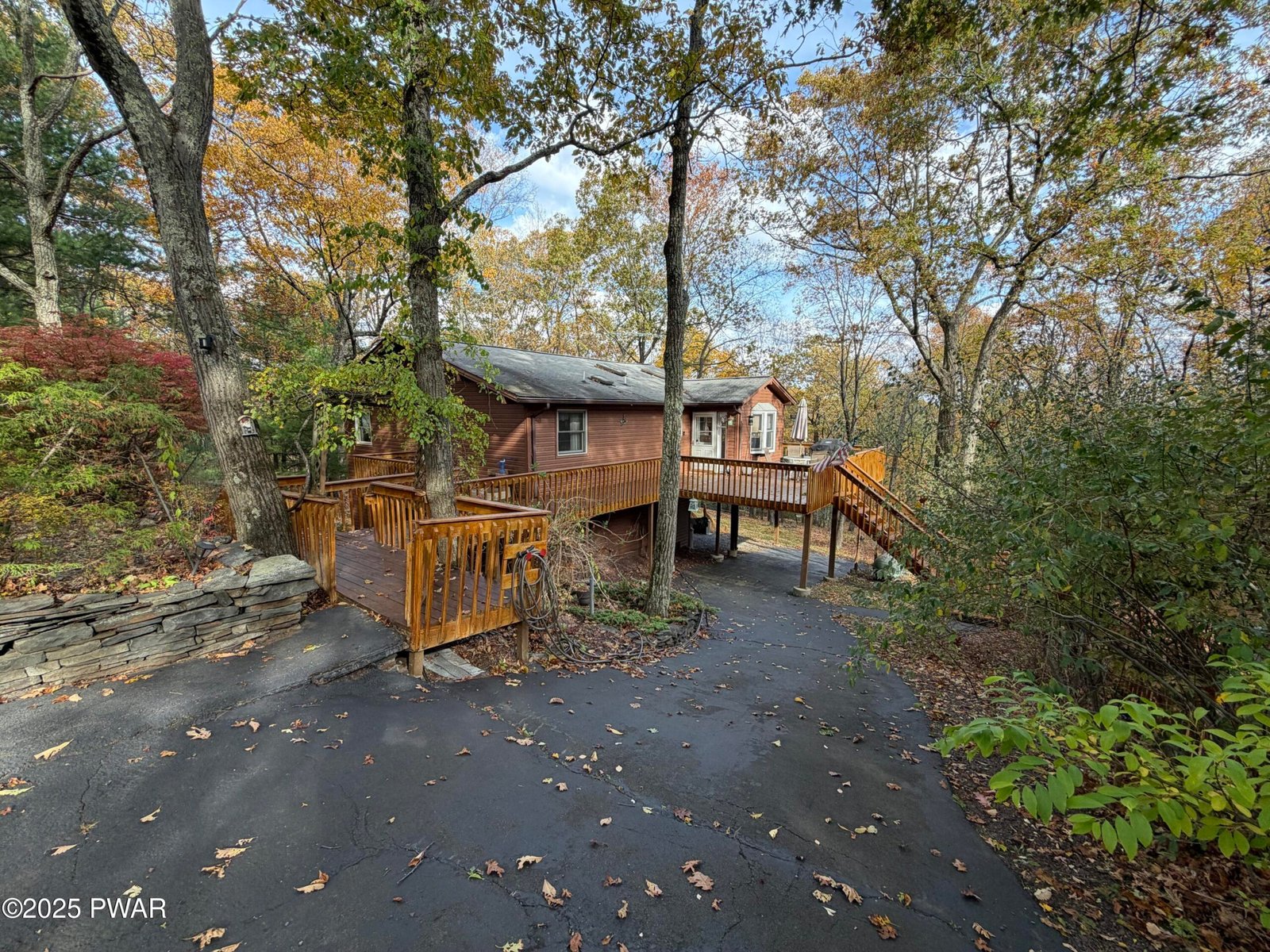Tucked into a canopy of oaks and pines, on 1.38 acres with two large lots included, this home is a private forest retreat. Inside, vaulted wood ceilings, exposed beams, and a brick fireplace create a warm, welcoming vibe in an open living space bathed in natural light. The kitchen, with its center island and ample counter space, flows seamlessly into the dining and living area, perfect for keeping everyone connected. This indoor comfort extends to a recently stained double-tier deck and the sprawling backyard with a stone fire pit for relaxation under the stars. A scenic trail from your yard leads directly to community lake access, offering a peaceful moment by the water. A paved driveway and backup generator add everyday comfort and reliability. Surrounded by seasonal color and quiet charm, this home blends adventure and ease in a setting that feels miles from everyday life--a true Pocono escape.