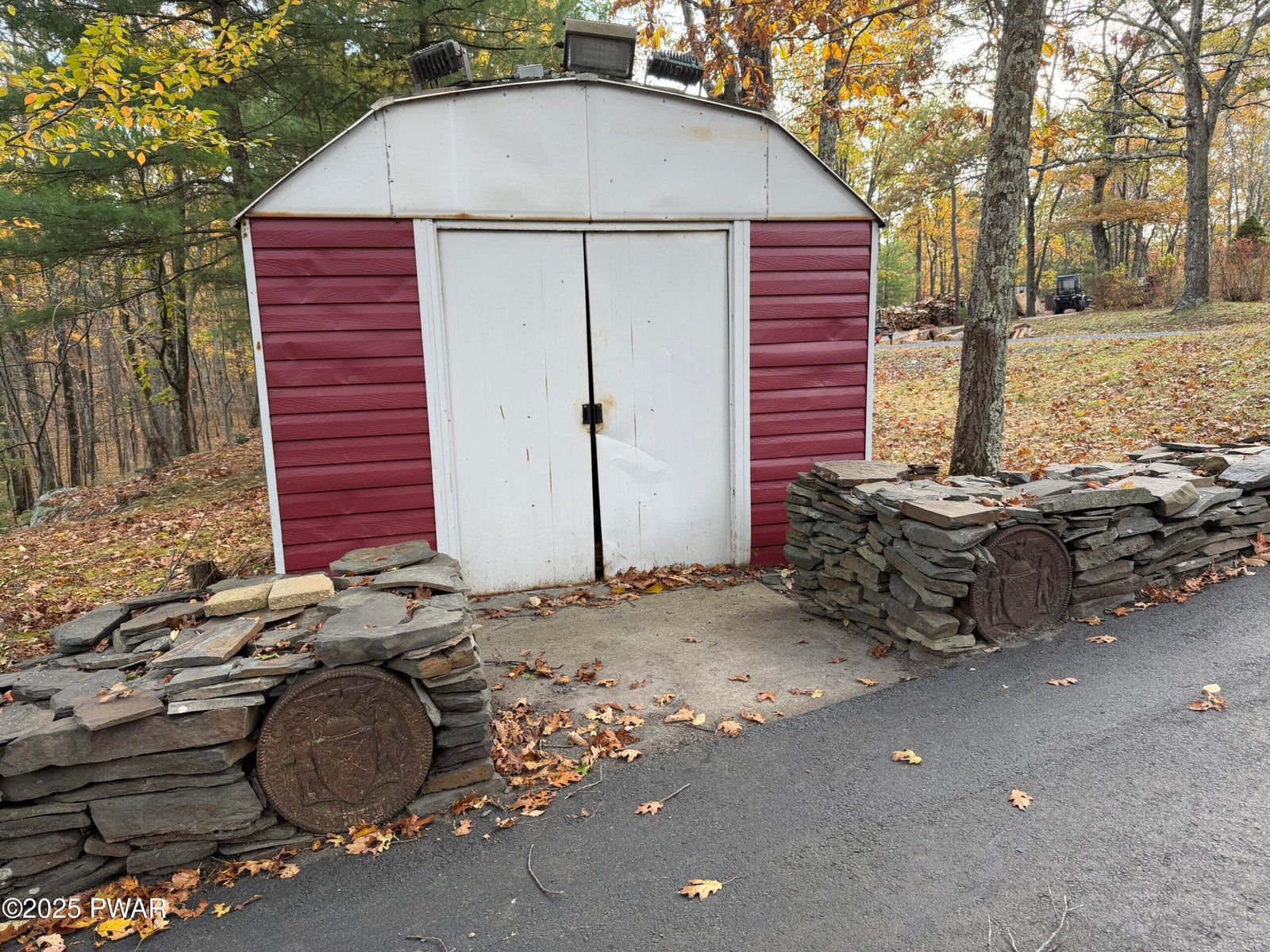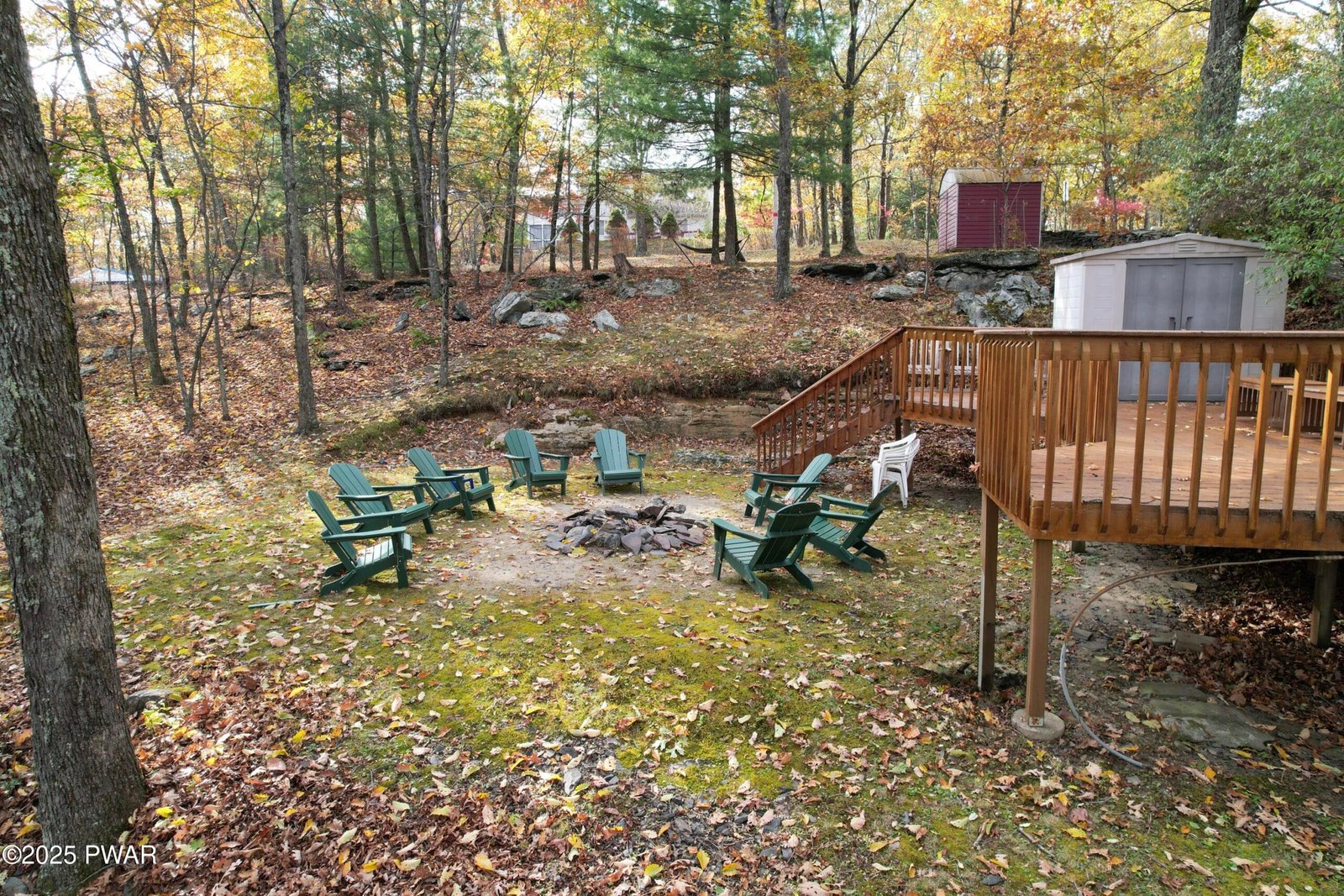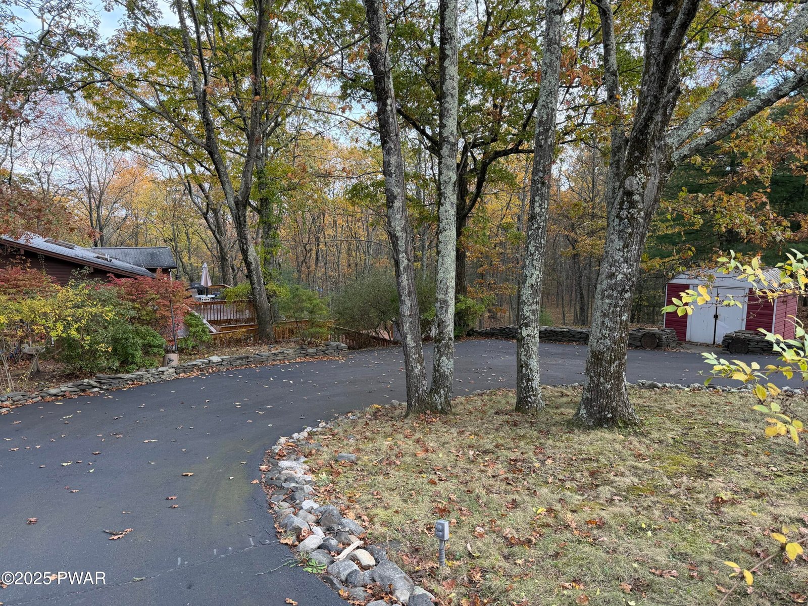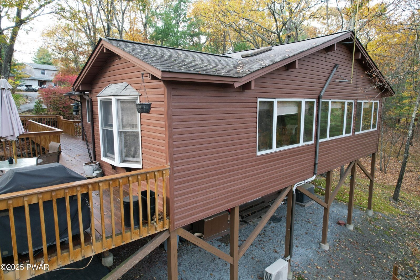 Tucked into a canopy of oaks and pines, on 1.38 acres with two large lots included, this home is a private forest retreat. Inside, vaulted wood ceilings, exposed beams, and a brick fireplace create a warm, welcoming vibe in an open living space bathed in natural light. The kitchen, with its center island and ample counter space, flows seamlessly into the dining and living area, perfect for keeping everyone connected. This indoor comfort extends to a recently stained double-tier deck and the sprawling backyard with a stone fire pit for relaxation under the stars. A scenic trail from your yard leads directly to community lake access, offering a peaceful moment by the water. A paved driveway and backup generator add everyday comfort and reliability. Surrounded by seasonal color and quiet charm, this home blends adventure and ease in a setting that feels miles from everyday life--a true Pocono escape.