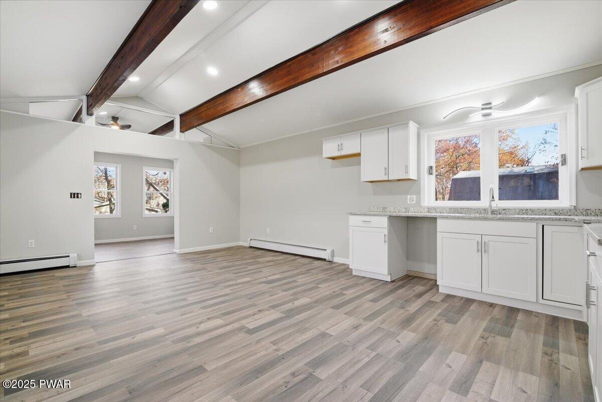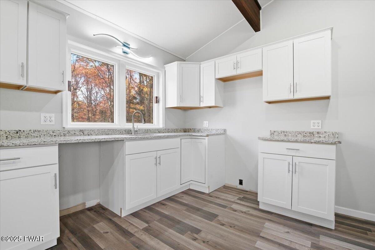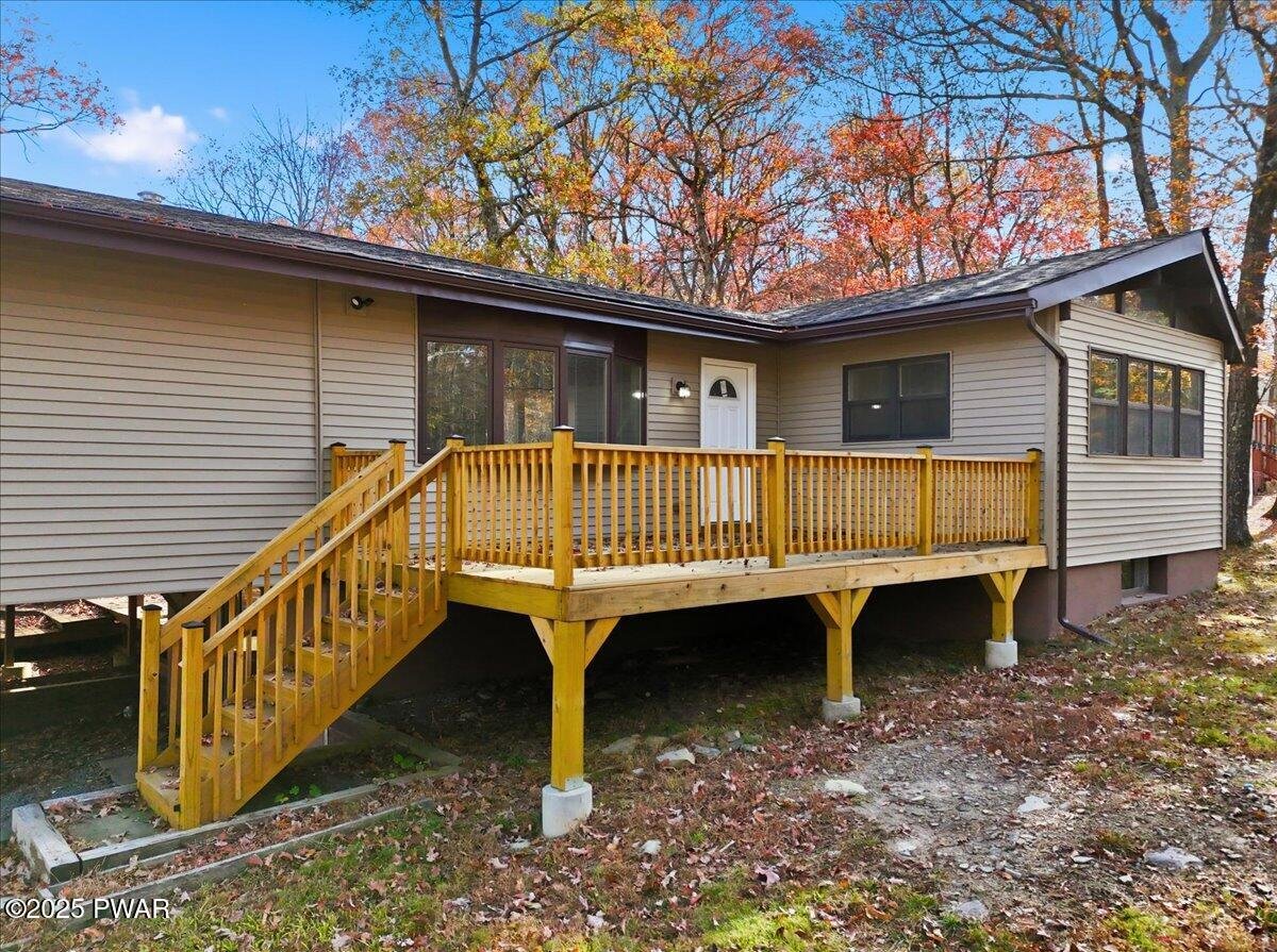 Move in ready and already updated. This 3 bedroom, 1 bath home was renovated from top to bottom with new siding, a brand new kitchen, updated bath and durable LVP flooring. The main level feels open and bright with vaulted ceilings, exposed beams and big windows that look out to the trees. The white kitchen has granite counters and plenty of cabinet space so everyday cooking is easy. There are two bedrooms on this floor and both have cedar closets.The finished walk out lower level is the extra space everyone wants. It has a cozy wood paneled family room, a wood stove for winter, a built in bar and a slider to the yard. The third bedroom is down here too, so it works well as a guest room or home office and it also has a cedar closet.Outside you get a large front deck for coffee, relaxing and enjoying the setting. The lot feels natural and low maintenance. Neutral finishes inside make it simple to furnish and enjoy right away. Some photos are virtually staged to show how the rooms can be set up. If you have been looking for an updated home with character and a finished walk out lower level, put this one on your list.