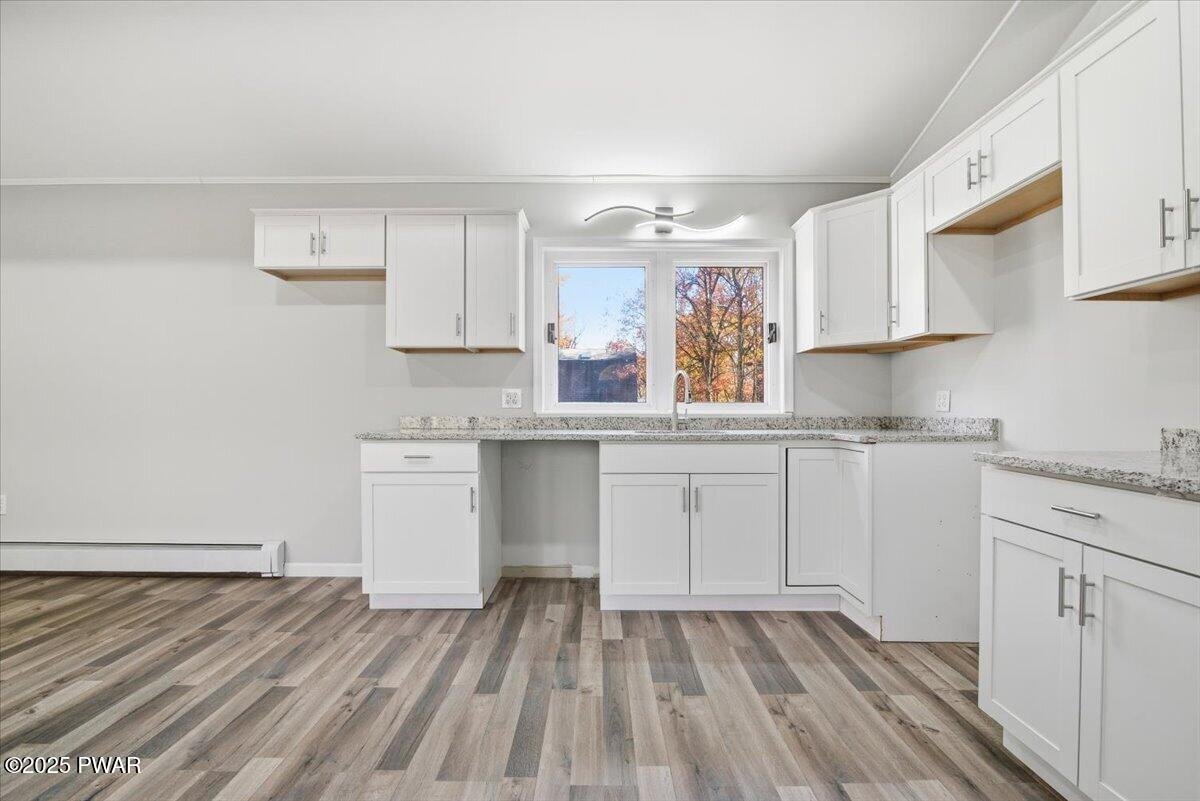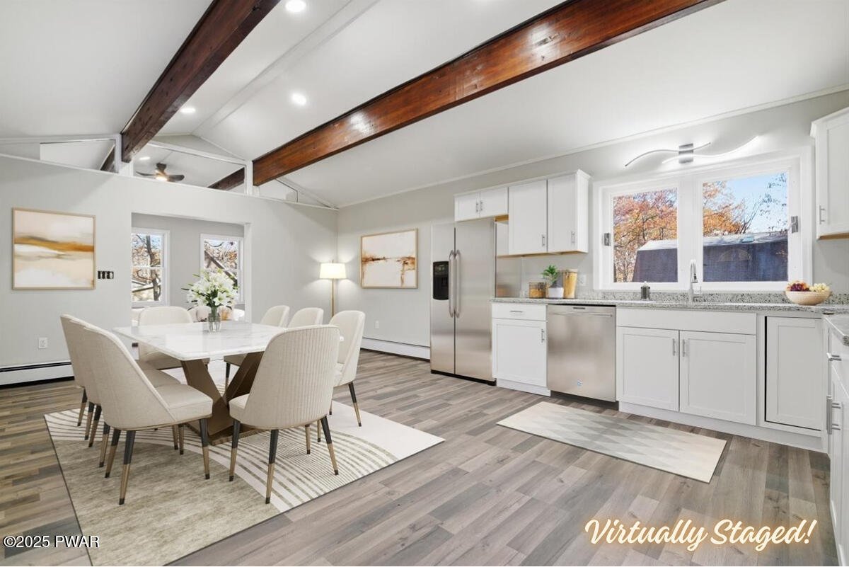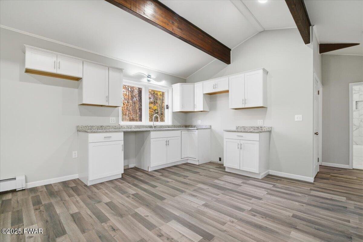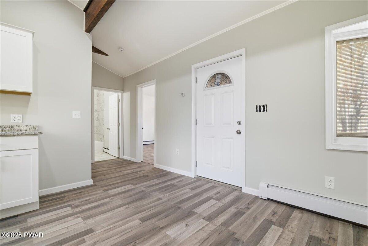Move in ready and already updated. This 3 bedroom, 1 bath home was renovated from top to bottom with new siding, a brand new kitchen, updated bath and durable LVP flooring. The main level feels open and bright with vaulted ceilings, exposed beams and big windows that look out to the trees. The white kitchen has granite counters and plenty of cabinet space so everyday cooking is easy. There are two bedrooms on this floor and both have cedar closets.The finished walk out lower level is the extra space everyone wants. It has a cozy wood paneled family room, a wood stove for winter, a built in bar and a slider to the yard. The third bedroom is down here too, so it works well as a guest room or home office and it also has a cedar closet.Outside you get a large front deck for coffee, relaxing and enjoying the setting. The lot feels natural and low maintenance. Neutral finishes inside make it simple to furnish and enjoy right away. Some photos are virtually staged to show how the rooms can be set up. If you have been looking for an updated home with character and a finished walk out lower level, put this one on your list.