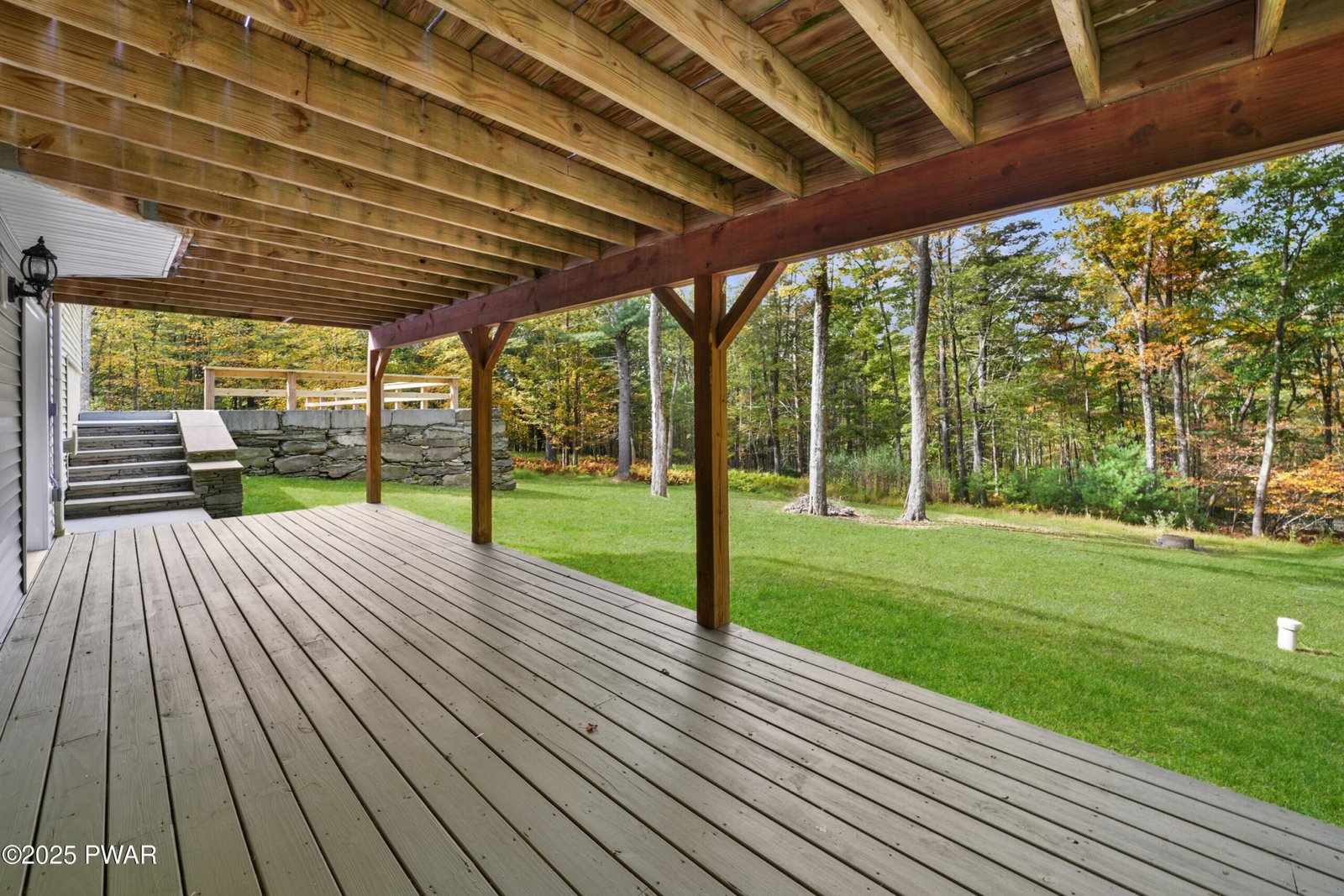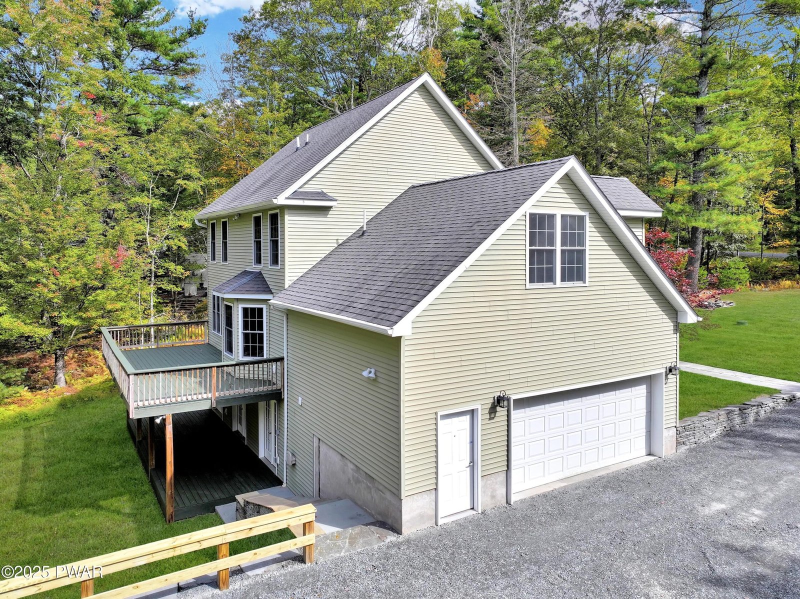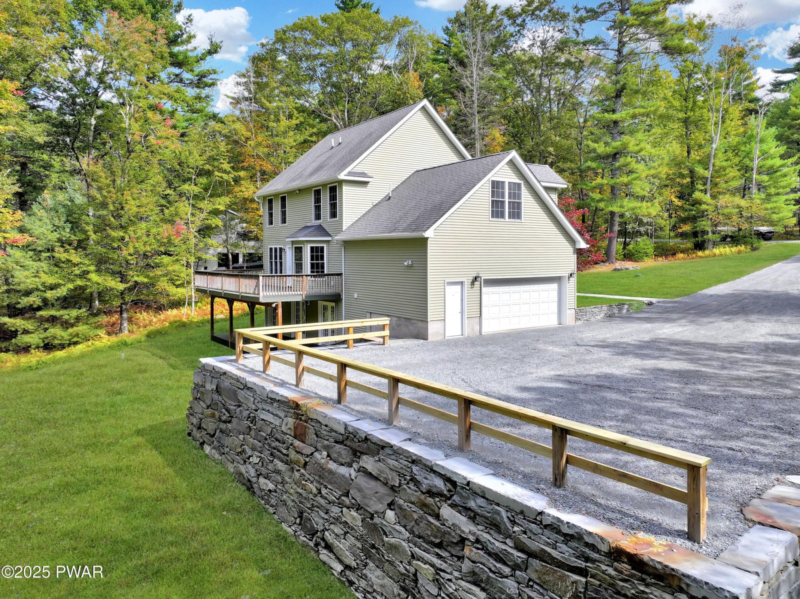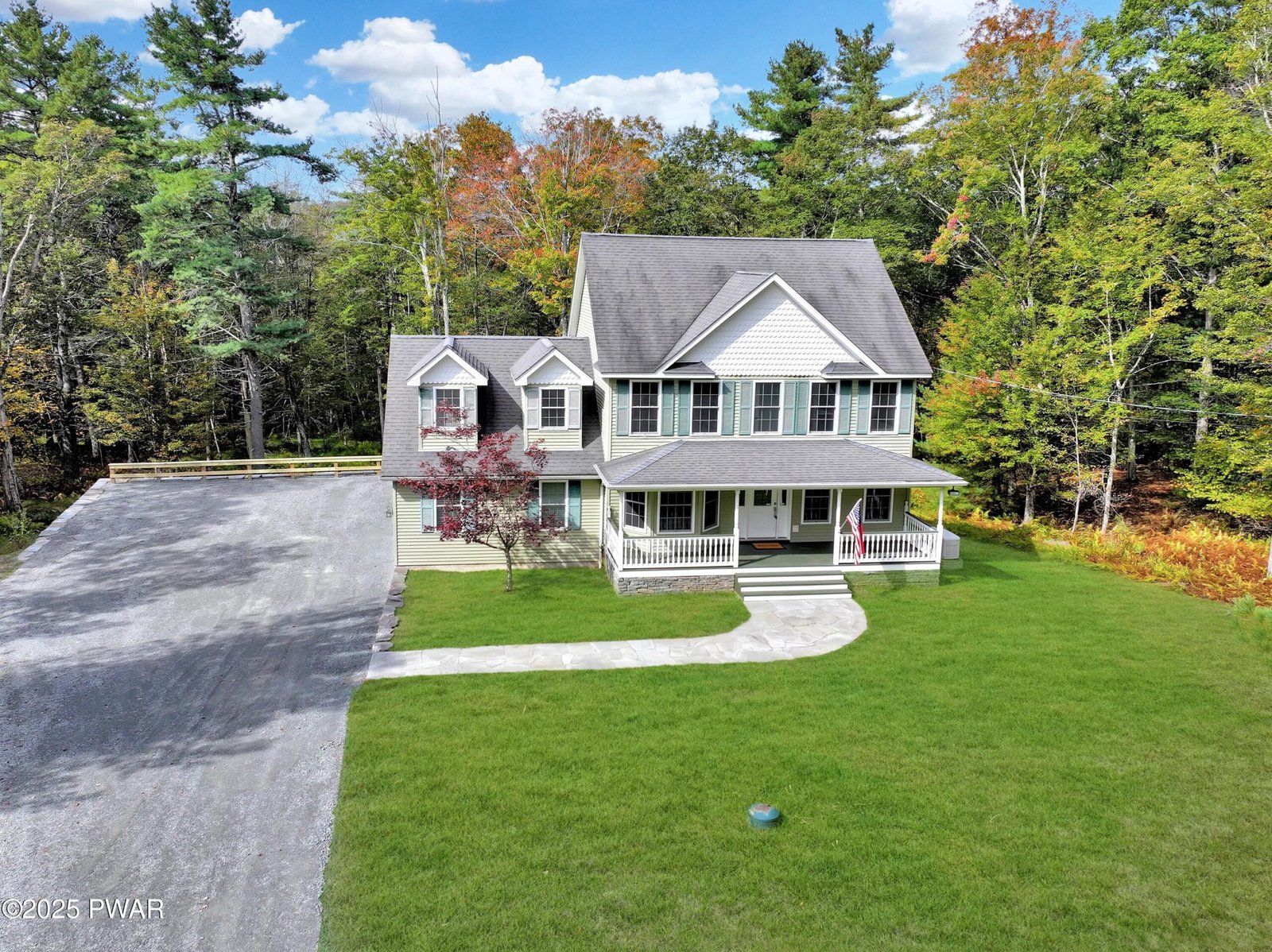 STUNNING CORNER-LOT FARMHOUSE COLONIAL SET ON 1.35 BEAUTIFULLY LANDSCAPED ACRES IN THE HIGHLY SOUGHT-AFTER POCONO MOUNTAIN WOODLAND LAKES COMMUNITY! Offering just under 3,000 sq. ft. of beautifully finished living space, this spacious home features 3 bedrooms plus a large bonus potential 4th bedroom upstairs, along with 2 additional bonus rooms and a full bathroom in the finished lower level--for a total of 31/2 bathrooms. Recently painted throughout, including the garage, the property showcases eye-catching stonework and masonry, gleaming hardwood floors, and an inviting open-concept design filled with natural light. The main level provides plenty of space for entertaining, including a formal dining room, large living room, and a stylish kitchen with granite countertops, stainless steel appliances, and a center island, all flowing seamlessly together. The primary bedroom suite offers a peaceful retreat with an attached full bathroom featuring a Jacuzzi soaking tub, double vanity, and a beautifully tiled walk-in shower. Upstairs bedrooms are generously sized, and several include walk-in closets for ample storage. A fully finished walk-out basement offers a family room, 2 bonus rooms, and a full bathroom, providing endless opportunities. Step outside to enjoy a covered front porch, an expansive back deck, and a huge yard offering endless opportunities for outdoor entertaining, play, and relaxation. Comfort continues with central air conditioning, propane hot-water baseboard heating, main-floor laundry, and a whole-house generator for peace of mind. Located in the amenity-rich Woodlands community, residents enjoy lakes for fishing and kayaking, a community pool and swim team, tennis courts, playground, clubhouse, and convenient garbage drop-off service, all within the top-rated Delaware Valley School District. This move-in-ready home combines timeless farmhouse charm, modern comfort, and exceptional indoor-outdoor living. OPEN HOUSE SATURDAY 12-4 PM!