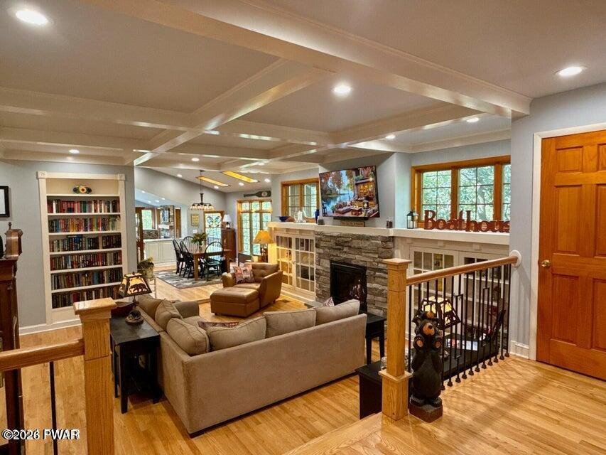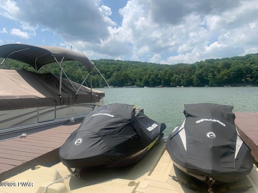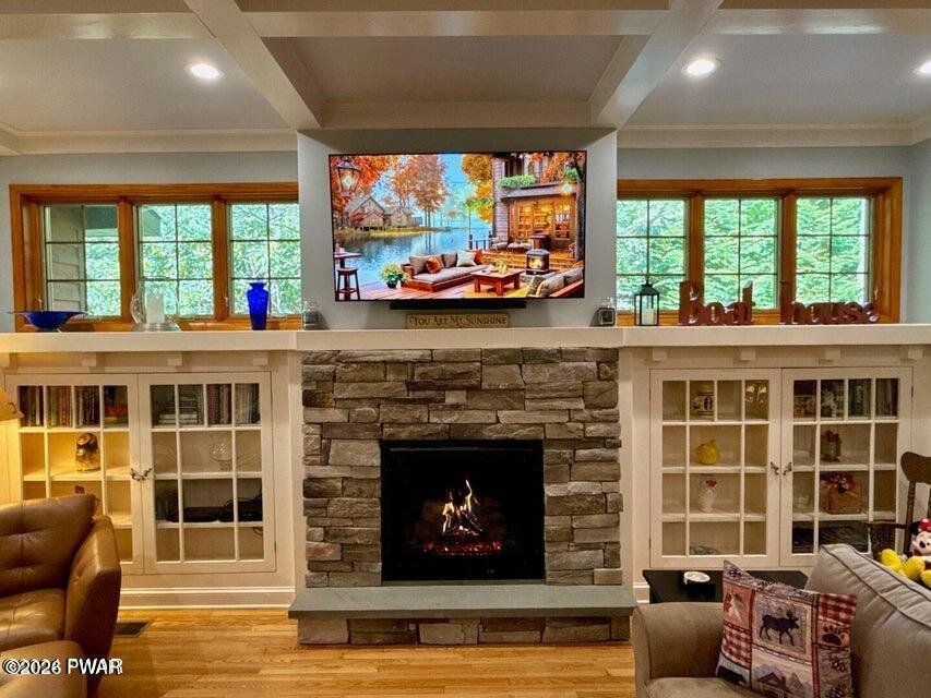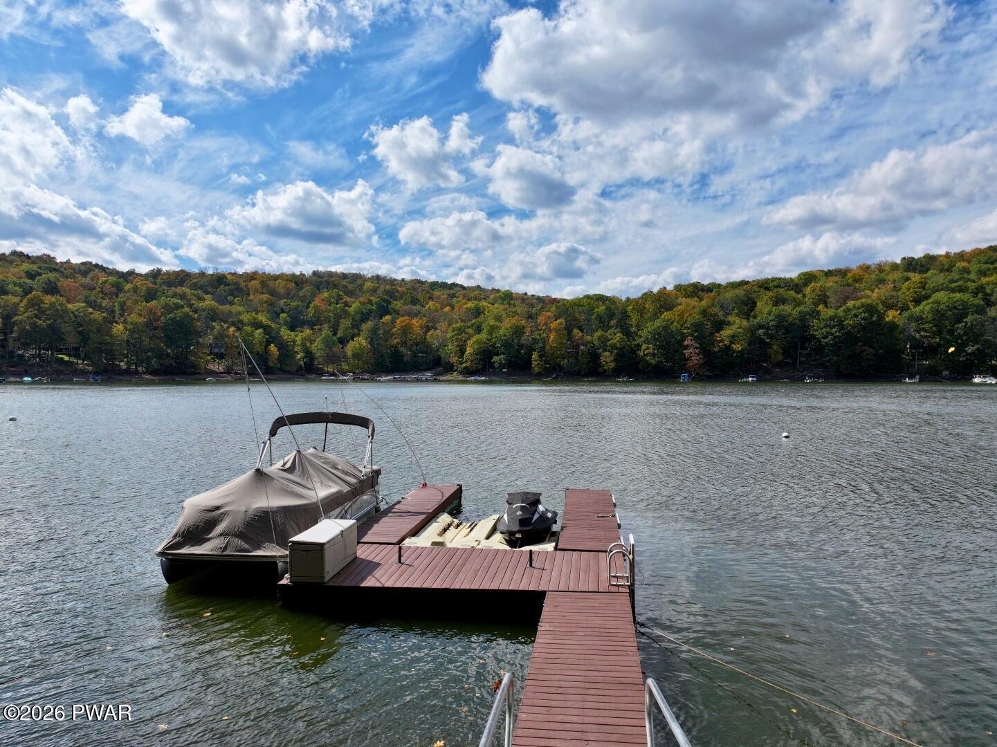 Lake Wallenpaupack Lakefront Custom Home in Hemlock Point. Designed with sophisticated architectural interior designs. Gourmet kitchen with KraftMaid Cabinets, KitchenAid stainless steel appliances and Bucks County stone gas fireplace. The massive center island sits at the heart, topped with thick, polished quartz offering seating for four. The island houses a stainless farm sink, large capacity ice maker, drawer microwave and dishwasher. A 48 inch 6 burner gas stove with griddle, double ovens and custom range hood compliment the space.. A wall of windows facing the lake complete the kitchen made for both gourmet creations and quiet moments sitting by the fireplace. A walk-in pantry with hickory cabinetry is nearby. Together, these features create a balanced blend of traditional craftsmanship and modern comfort. Imagine a warm elegant living room for both comfort and sophistication. The coffered 10 ft. ceiling immediately draws your eye upward to the ceiling framed in rich, white-painted wood that adds depth and architectural charm to the space. At the focal point of the living room stands a Bucks County stone fireplace flanked by glass door, enclosed bookcases. Above the bookcase are Pella windows set high for privacy but allowing in streams of natural light. These high quality Architect Series windows are installed throughout the home and are divided into multiple panels offering a timeless, classic look. The expansive owner suite includes 12 ft. vaulted, knotty pine ceilings, a raised hearth Bucks County stone gas fireplace, built-in bookcases and a coffee bar with microwave and mini-frig. The adjoining office suite/ bedroom includes a 1930's Vintage style bathroom with white subway tiled shower, Kohler pedestal sinks, whirlpool tub. Lakeside amenities abound! Including abundant flowering mountain laurel, rock outcroppings, three decks and a lakeside stone patio with fire pit. Private dock for two boats, two jet skis, swim platform and offshore mooring buoy.