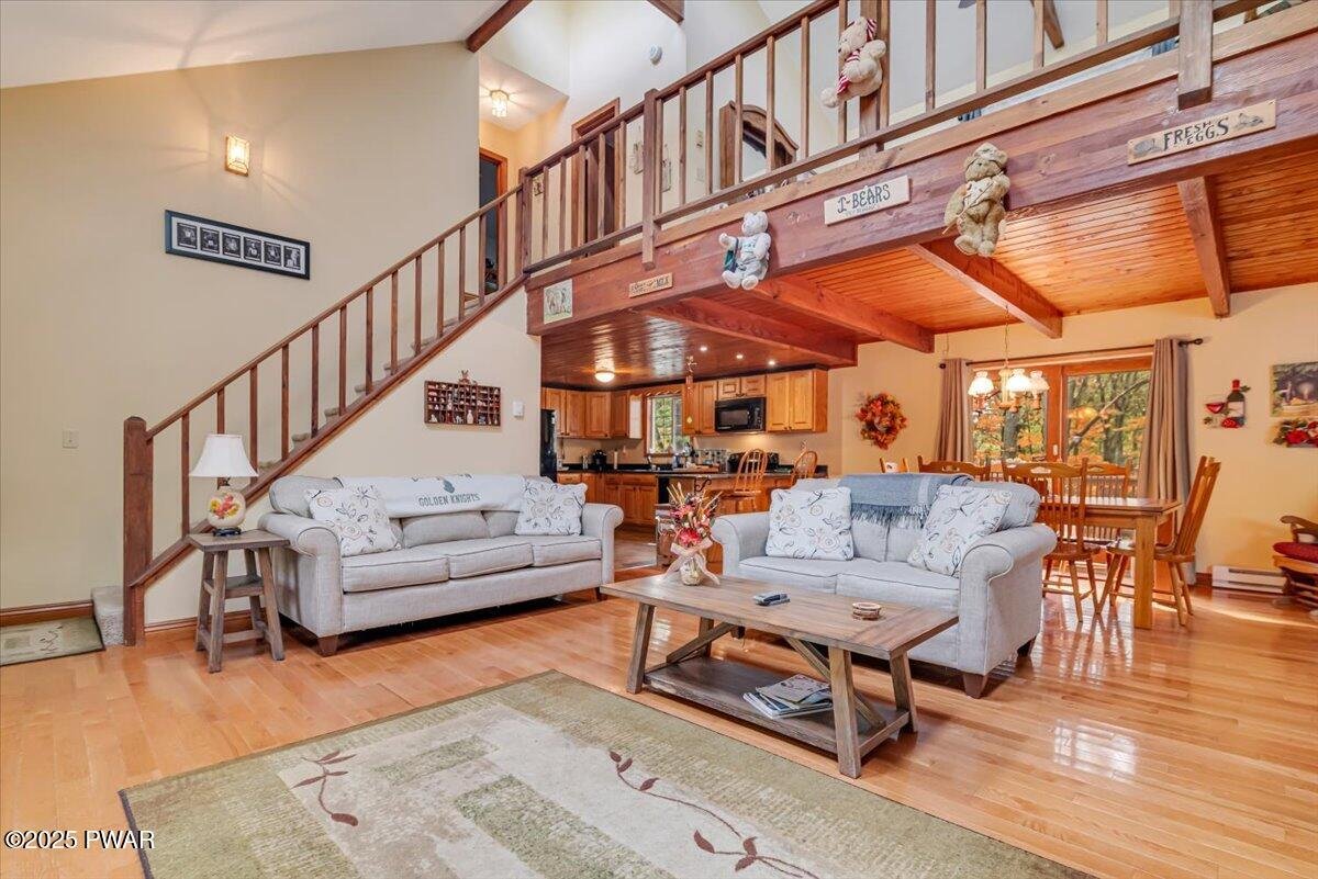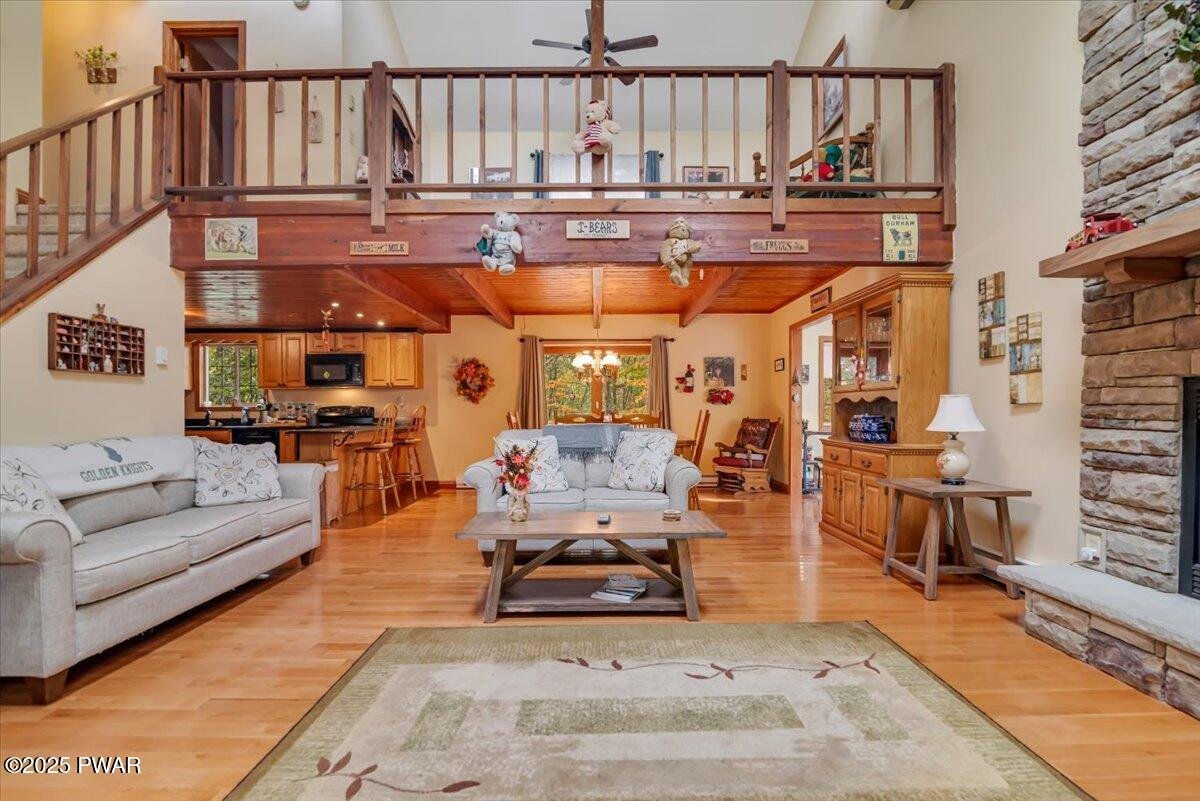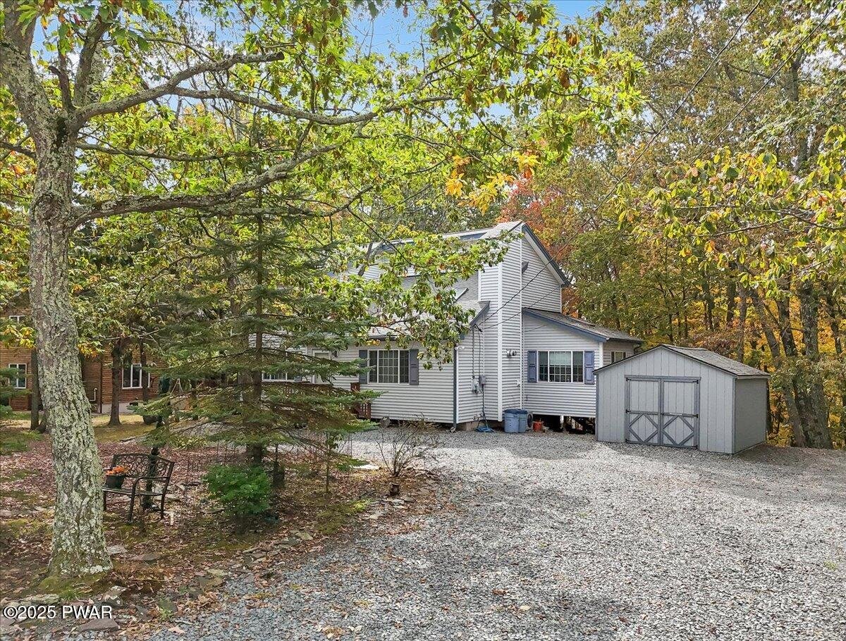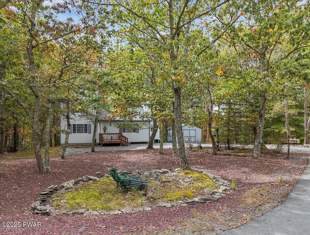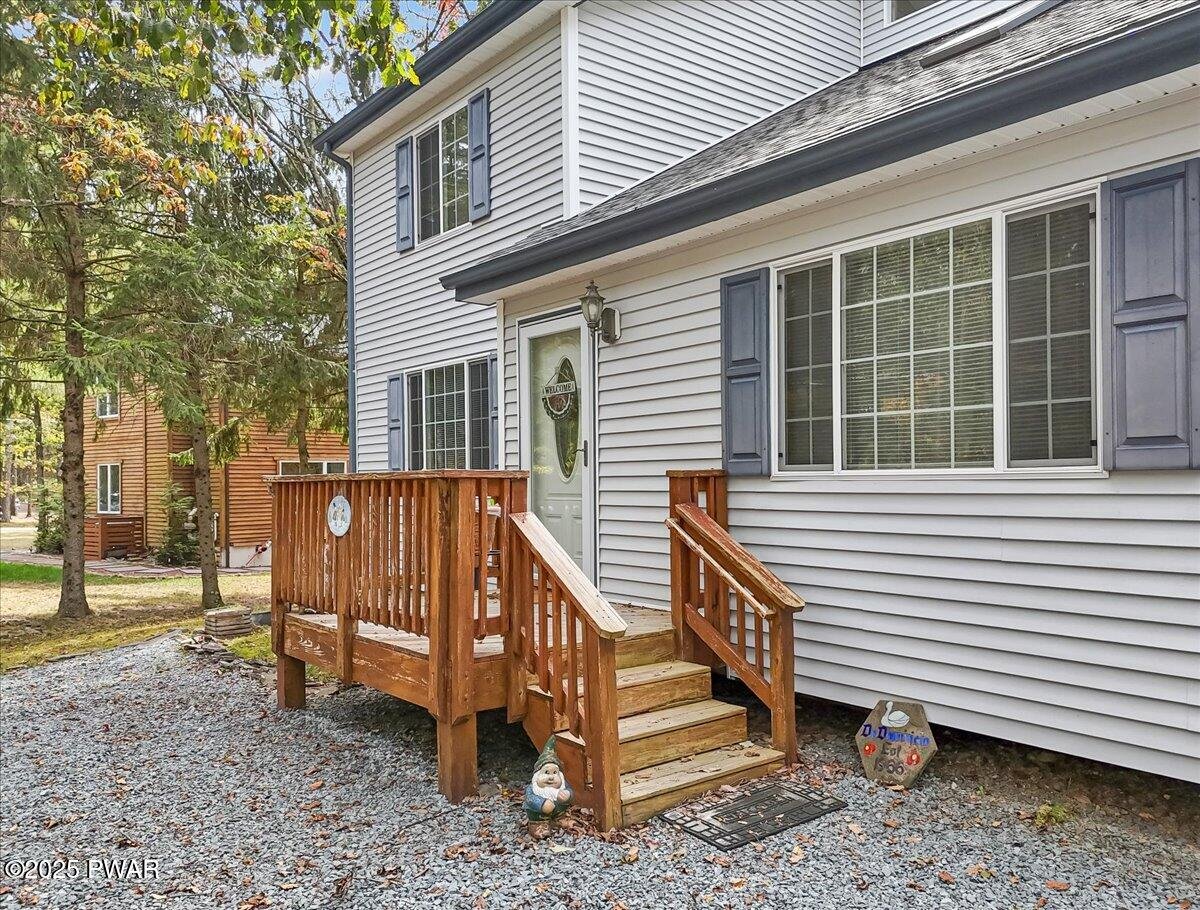 A beautifully maintained 3 bedroom, 2 bathroom home at the end of a peaceful cul-de-sac in Tanglwood Lakes! The lovely homes sits in one of the quietest locations in the whole community, has plenty of parking, and a great shed for storage! The back deck is perfect to relax and take in the view! Inside you are greeted by a nice open living space with real hardwood floors. The living room features a floor to ceiling stone faced propane fireplace to enjoy and opens right into the dining area. Off the dining room you will find a lovely sitting area with lots of light - perfect for plants, a reading nook, or an office. The large kitchen has wood cabinets and granite countertops to enjoy. Also on the main floor is the primary bedroom, full bathroom, and laundry! The second floor features a large multi-purpose loft that overlooks the large living room below. You will find an additional two bedrooms and full bathroom on this floor. This is a great home in a sought after lake community. Enjoy Tanglwood Lake, which is a peaceful non-powerboating lake where you can enjoy kayaking or fishing. In addition, there is a beautiful sandy beach on Lake Wallenpaupack with a picnic area and pavilion. You will also find a playground, walking trails, and a fitness center within the community along with many miles of well maintained, paved roads. This is a property you are not going to want to miss!