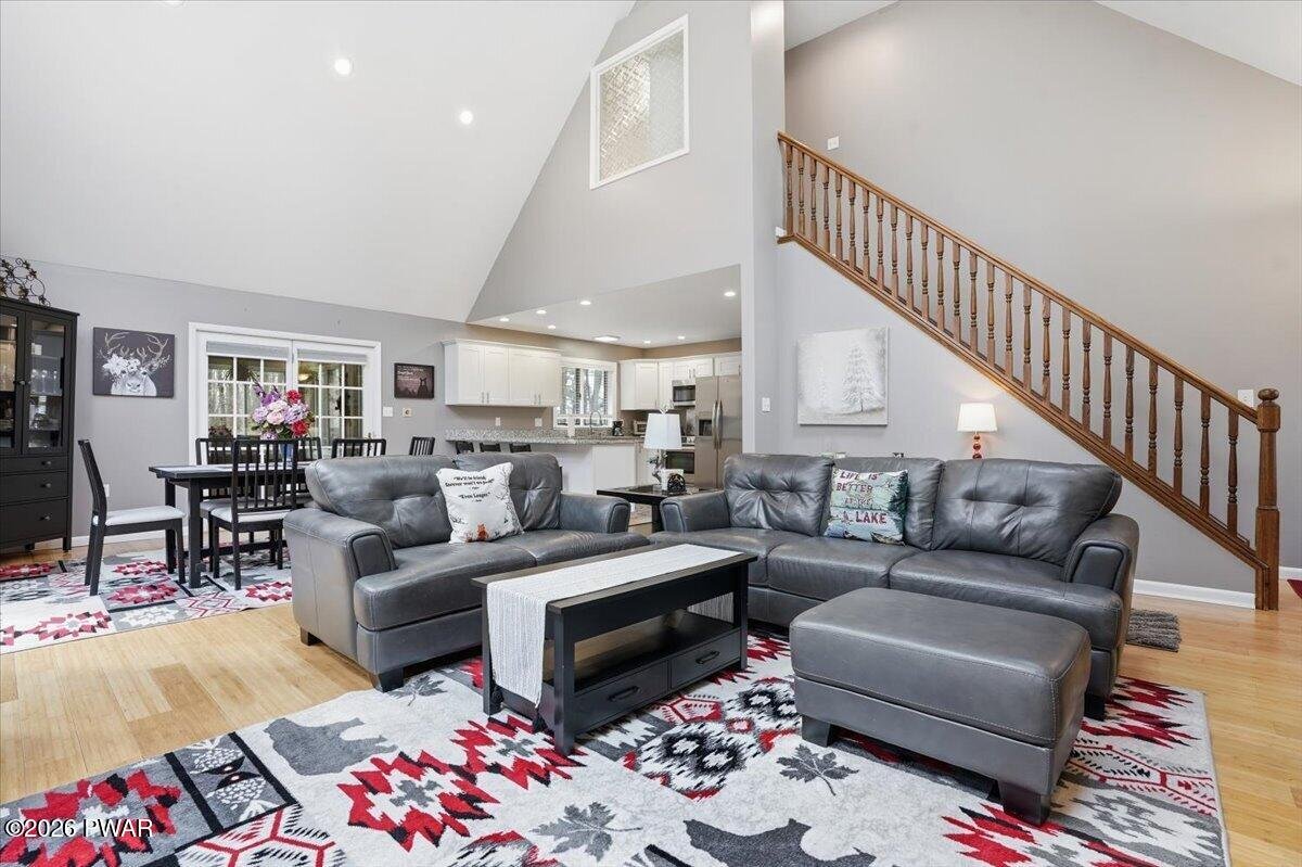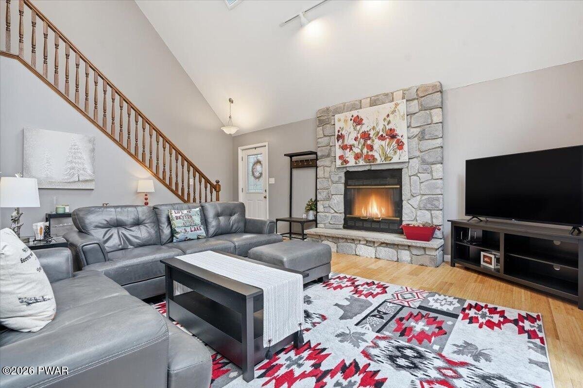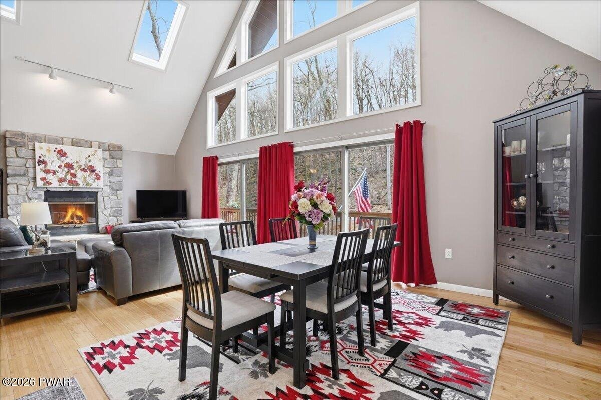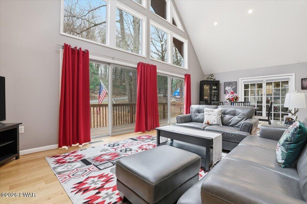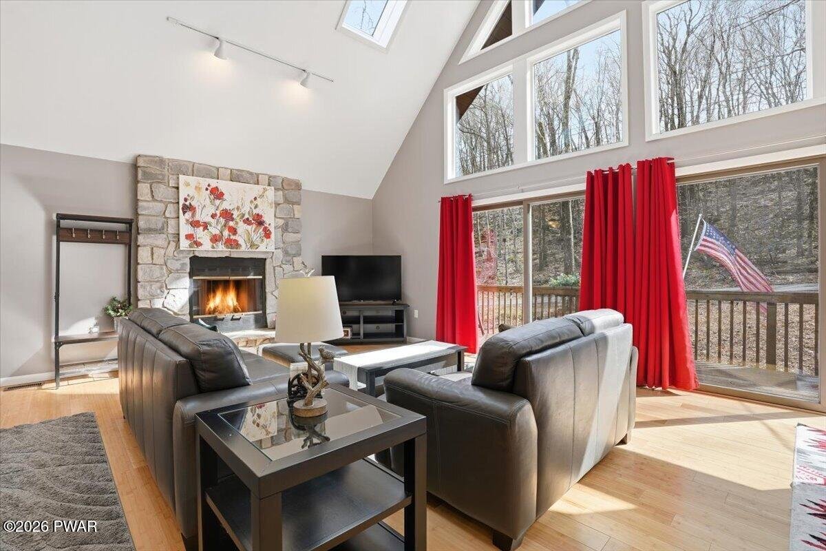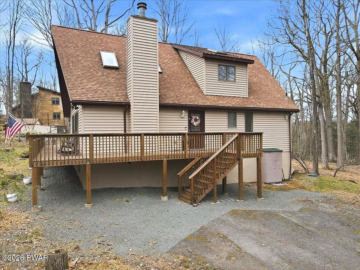 FUNtastic PAMPERED Technical Tanglwood Lakes waterfront CHALET - includes Furniture TURN-KEY & STUNNING! Welcome to this beautifully maintained, contemporary chalet offering technical lakefront access with a 25' frontage on Tanglwood Lake - perfect for your row boat, paddle boat or canoe thru your adjacent Mohawk park access from your home. Step inside this recently remodeled, eye-catching chalet featuring a dramatic wall of cathedral glass that fills the open main floor plan with natural light. The spacious living area has a striking native blue stone propane fireplace--ideal for cozy evenings or stylish entertaining and the cathedral ceiling with dual ceiling fans, skylight, and central air enhance the comfort and architectural flair throughout. This home offers 3 bedrooms, including a private owner's suite and 2 beautifully updated granite tile baths. The kitchen shines with an oversized granite countertop, quality light-toned cabinetry, stainless steel appliances and flexible dining space - perfect for gatherings. Enjoy indoor-outdoor living with a large wraparound deck and a relaxing three-season Florida sun room, ideal for soaking in the peaceful surroundings. The lower level offers a full basement ready to be finished into additional living space family room. Radon mitigation system is already installed. Take advantage of this prime location--golf cart to private community access on Lake Wallenpaupack for power boating and water recreation, or head to nearby fairways at the PGA Fazio-designed Paupack Hills Golf Course.Being offered fully furnished and turn-key, this property is ready for immediate enjoyment!Whether you're seeking a full-time residence, weekend escape, or investment opportunity, this chalet delivers charm, comfort, and an unbeatable lifestyle.Don't miss your chance to own this exceptional lake retreat!