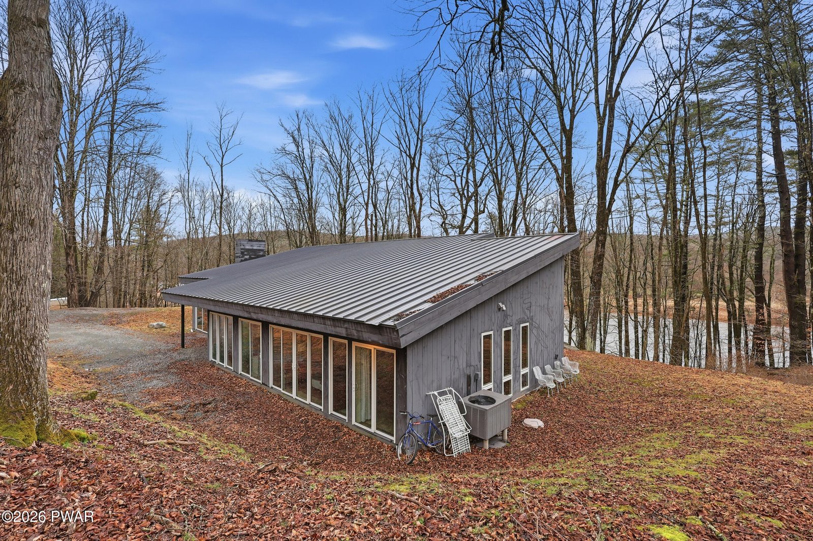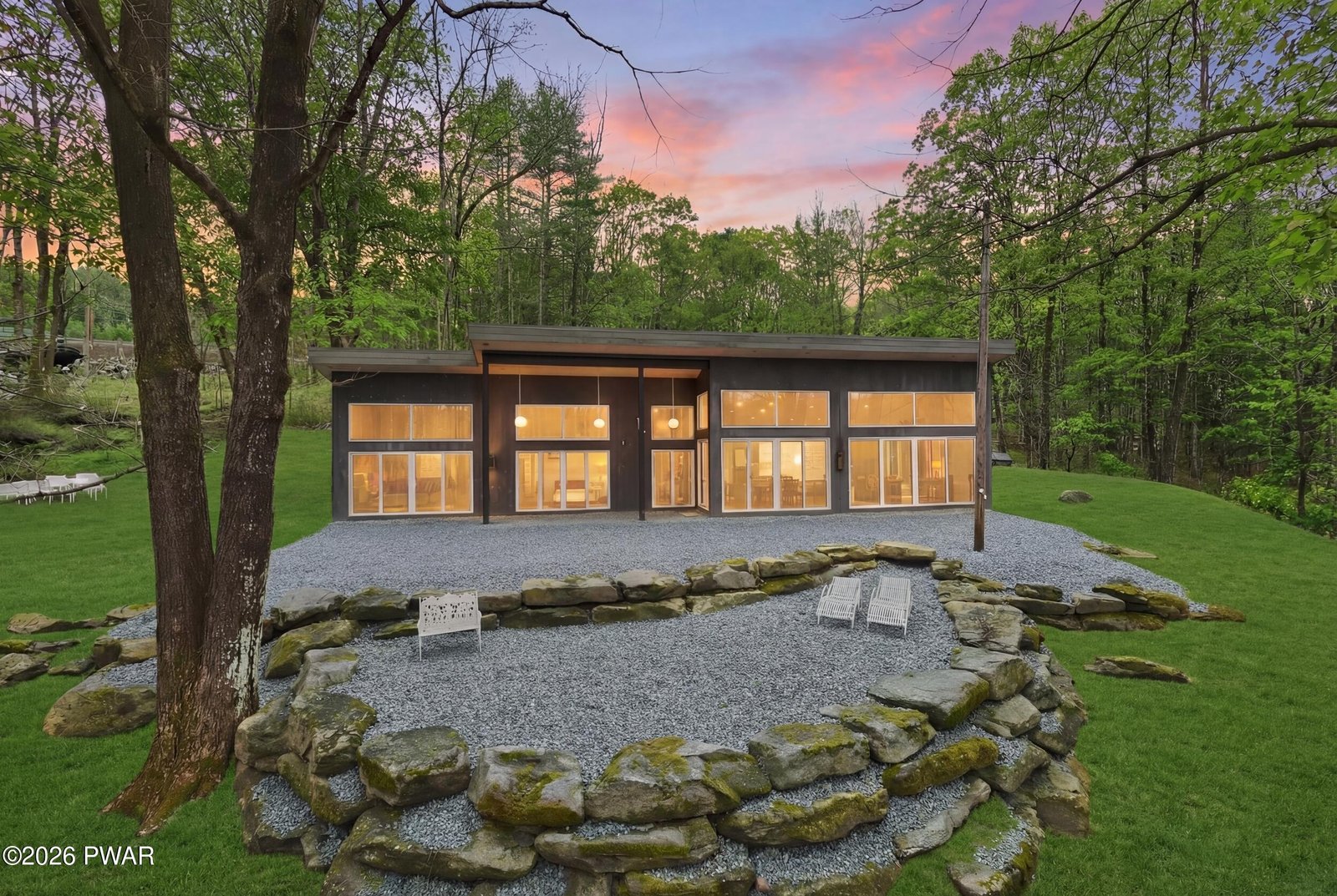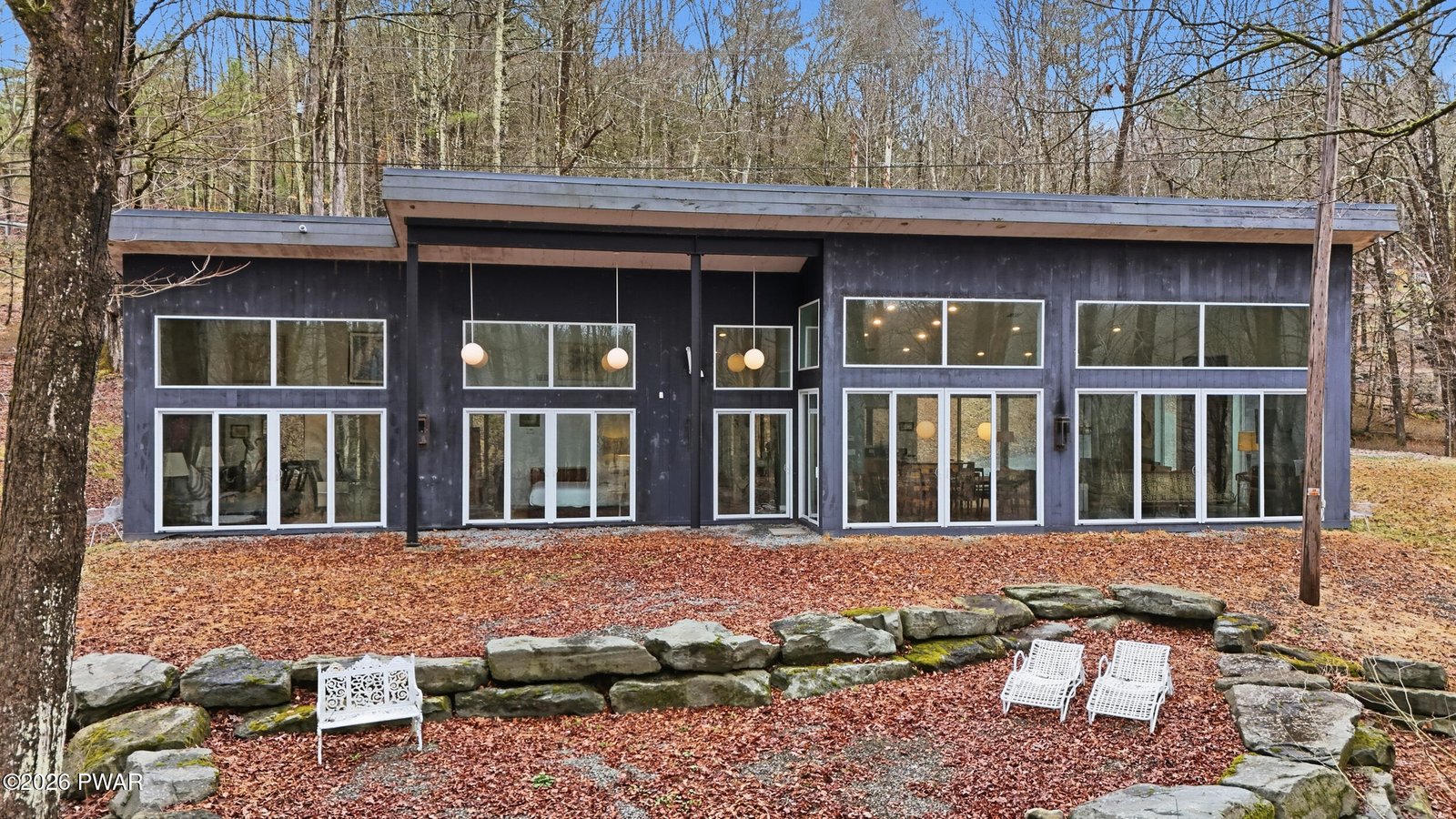 Stunning Upper Delaware Riverfront masterpiece set on 2.4 private acres just minutes from the vibrant village of Calicoon, NY, offering a rare blend of modern architecture, natural beauty, and refined single-level living. This exceptional 3-bedroom 2 full bath residence is designed to impress, with soaring ceilings, dramatic lines, and expansive glass that flood the home with natural light and frame breathtaking views of the Award Winning Delaware River--Pennsylvania's 2025 River of the Year. The open-concept living, dining, and kitchen space is both grand and inviting, featuring radiant heated floors throughout the entire home and a seamless layout that creates incredible scale while maintaining a warm, comfortable feel. The chef's kitchen is equally striking, appointed with high-end Thermador appliances, soapstone countertops, sleek modern cabinetry, and a large island with seating and a built-in butcher block for added function and style. Enjoy 3 spacious bedrooms with 2 large modern bathrooms, including the primary suite with luxury features throughout. The Walls of sliding glass doors connect the interior to the outdoors, extending the living space into a truly serene setting. Enjoy a streamside firepit and a gentle walk to approximately 200 feet of private Delaware River frontage, surrounded by peaceful, wooded landscape. Constructed in 2014 and thoughtfully positioned high above the flood zone, this home offers both lasting quality and peace of mind. Natural stone landscaping enhances the setting, providing usable outdoor space while preserving privacy and tranquility. A rare and remarkable riverfront offering where modern design, light, space, and setting come together in a truly unforgettable way.