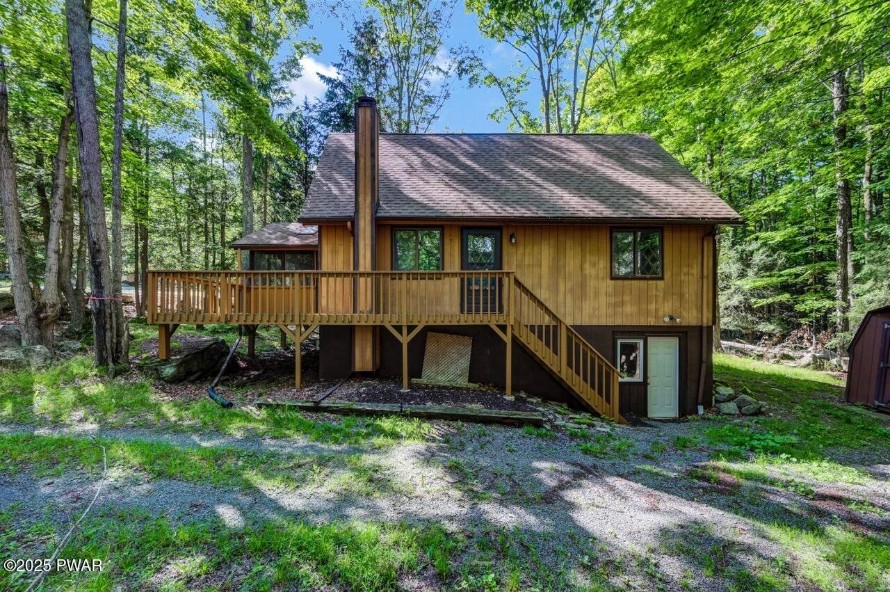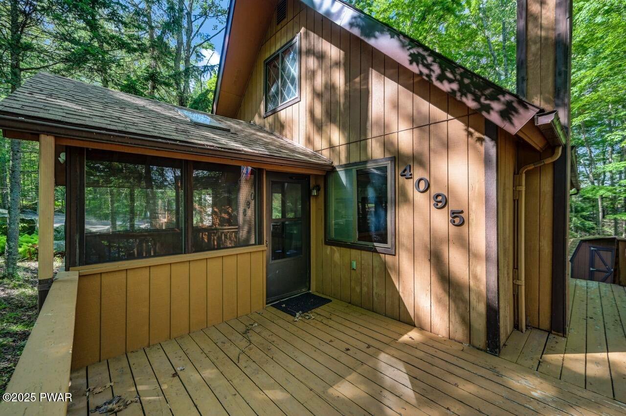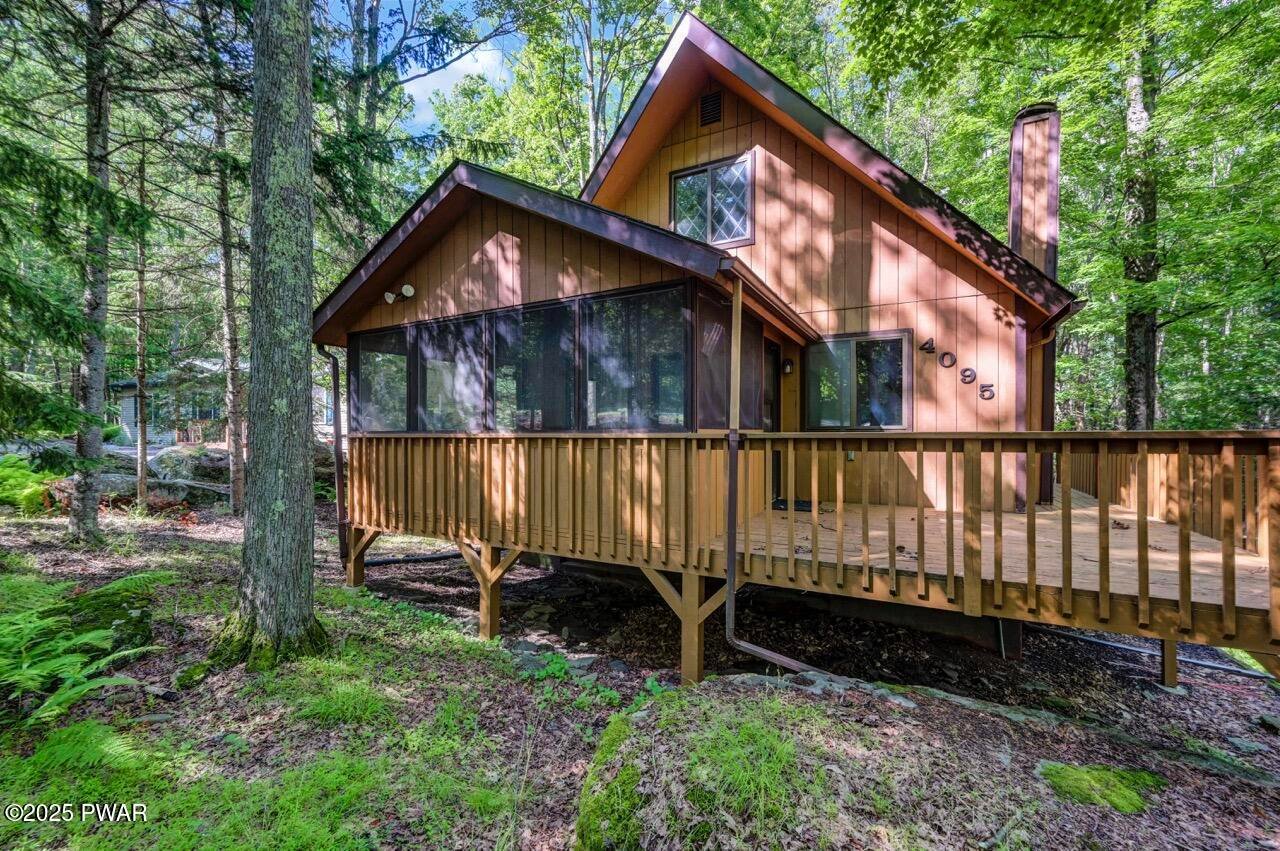 Chalet in the woods in the Northern Poconos, just over two hours from the NYC and Philadelphia areas. Located in an amenity-filled community called The Hideout, this beautiful home adjoins a 28-acre greenbelt for added privacy and a peaceful wooded backdrop. Enjoy the outdoors from the screened-in porch or the open deck overlooking the trees. Inside, the main living area features high ceilings, laminate flooring, and an updated kitchen with plenty of cabinet space. Two bedrooms and a full bath are conveniently located on the main level. Head upstairs to discover a private bedroom area. The beautifully finished lower level offers a spacious family room, an additional bedroom, another full bathroom, and more space to relax or entertain. All this in a premier four-season community with lakes, pools, beaches, golf, skiing, and more!