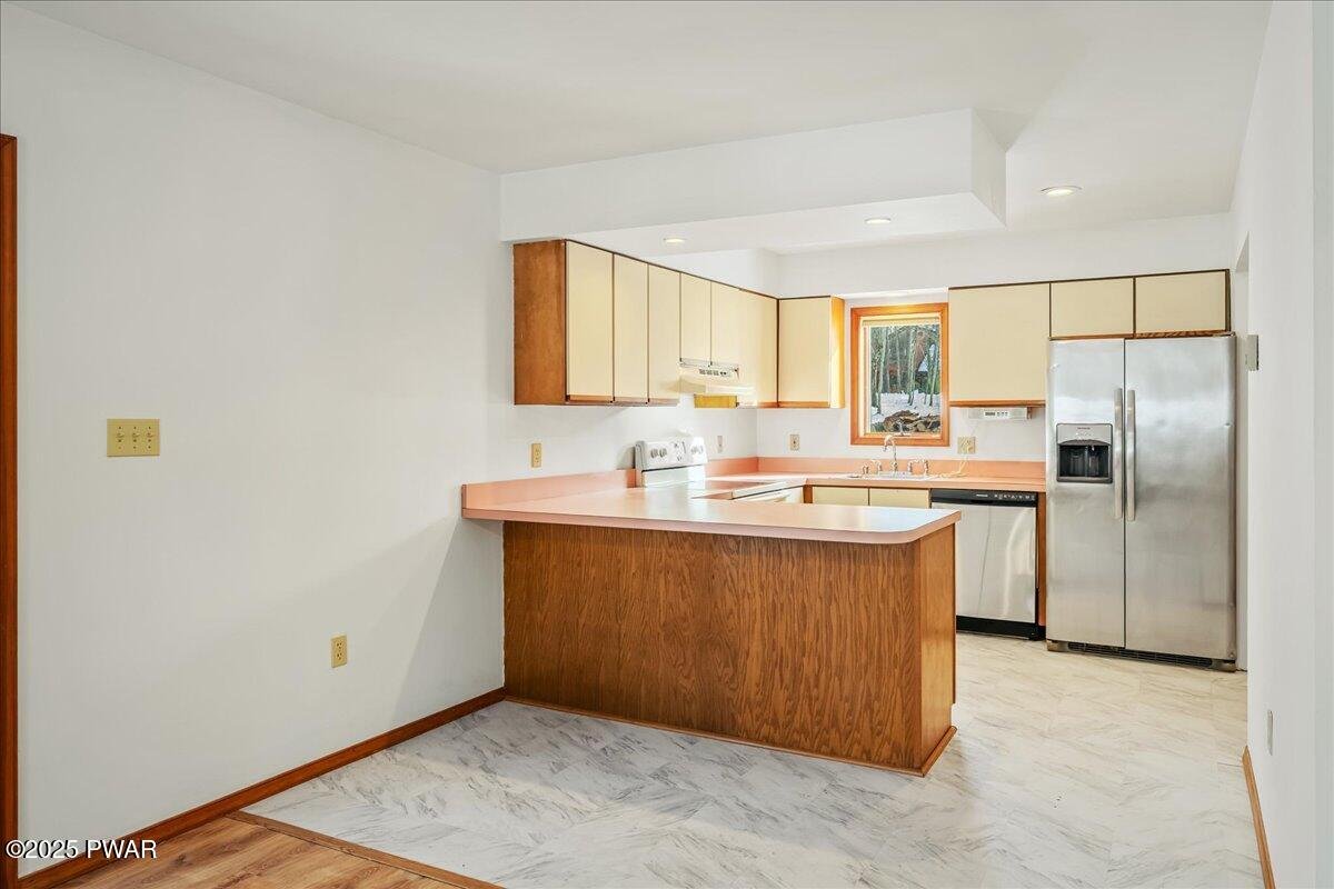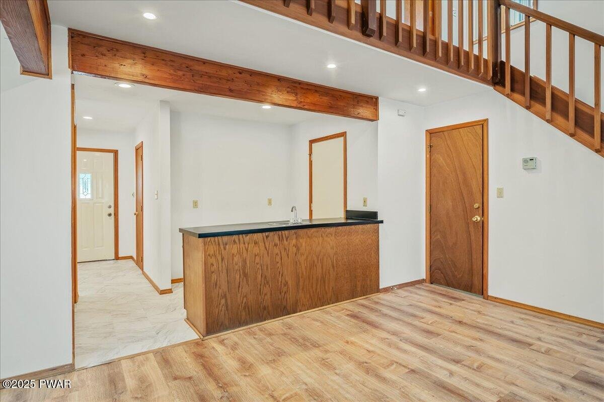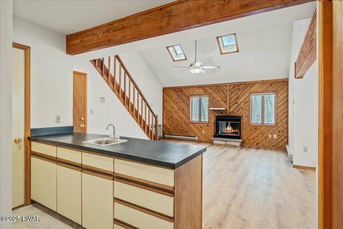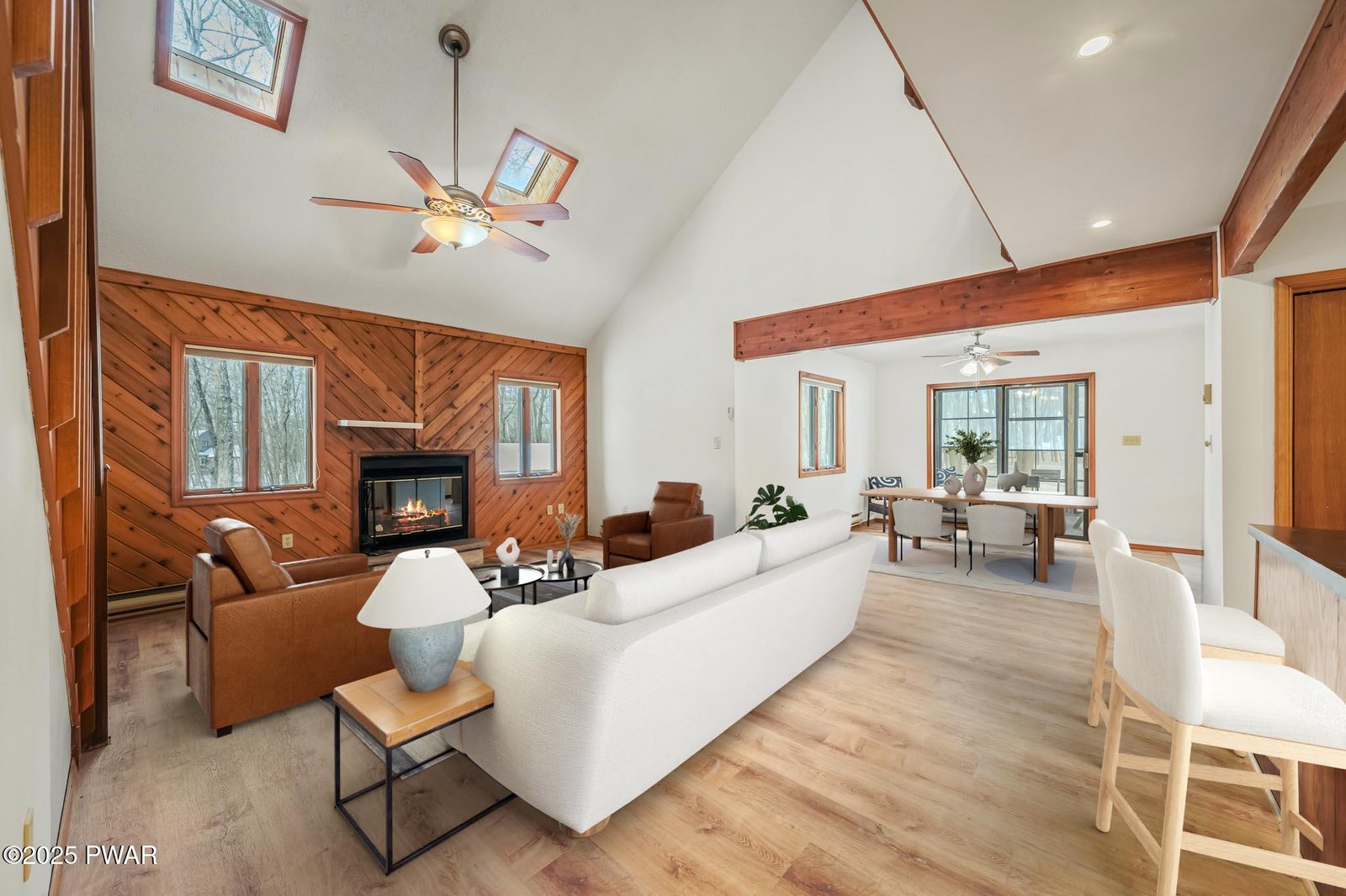 Do not miss this warm and inviting contemporary home, perfectly set on a wooded lot for privacy and year-round natural beauty. Enjoy a peaceful setting while staying close to some of the area's most popular attractions, including Bushkill Falls, Shawnee Mountain Ski Area, the Delaware Water Gap National Recreation Area, and miles of scenic hiking, rafting, and outdoor adventure. Inside, you're greeted by soaring cathedral ceilings, dramatic skylights, and an airy open layout that brings in abundant natural light. The living room blends warmth and character with its wood accent wall, wood-burning fireplace, and built-in wet bar. Just off the dining area, the three-season room provides a bright, versatile space overlooking the tranquil backyard. Step outside to the deck and flat yard, offering additional room for outdoor living and recreation. The first-floor bathroom features a double-sized whirlpool tub, charming wood detailing, and a separate shower. Upstairs you'll find three bedrooms with vaulted ceilings and great natural light, plus another full bath. Additional highlights include a dedicated laundry area, ample storage, and an attached garage for year-round convenience. Located in a gated, amenity-rich gated community w community water/sewer system and offering a clubhouse, outdoor pool, tennis/basketball courts, and playgrounds. Priced at under $230k this home won't last long - schedule your private tour today!