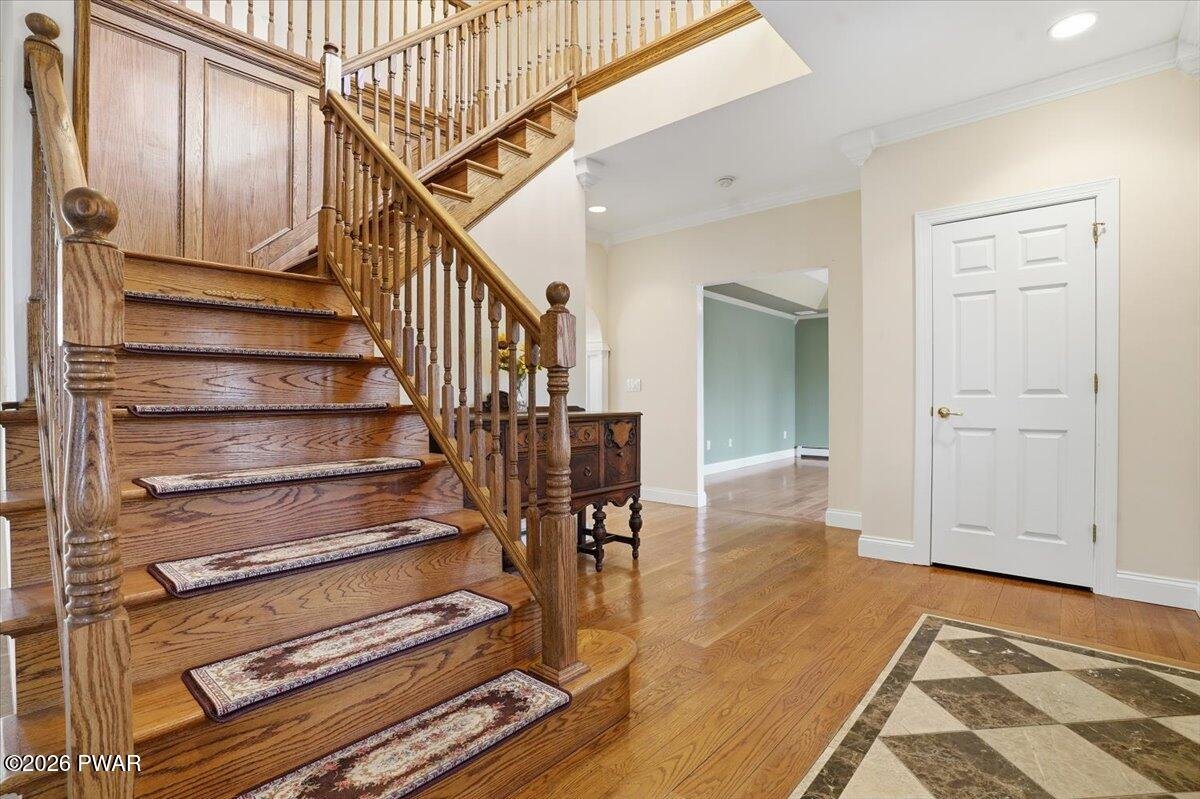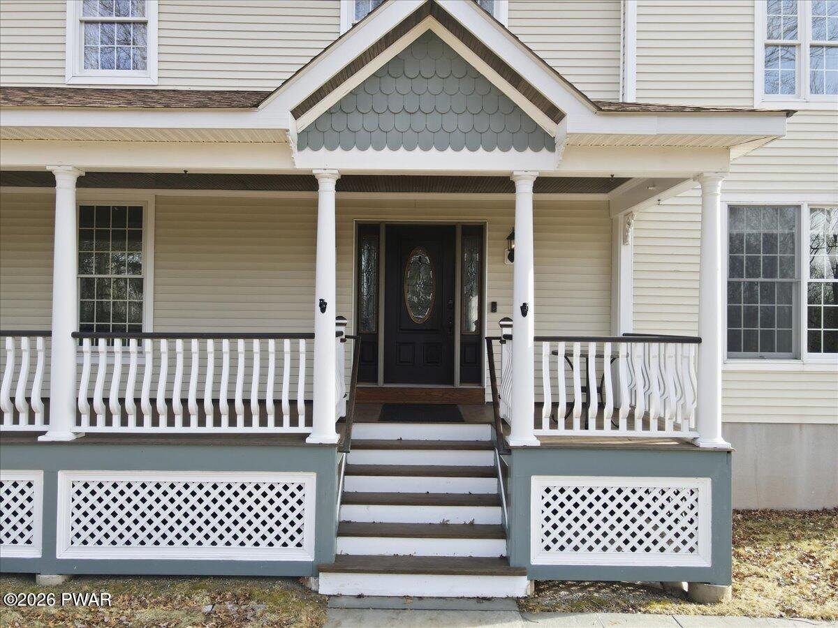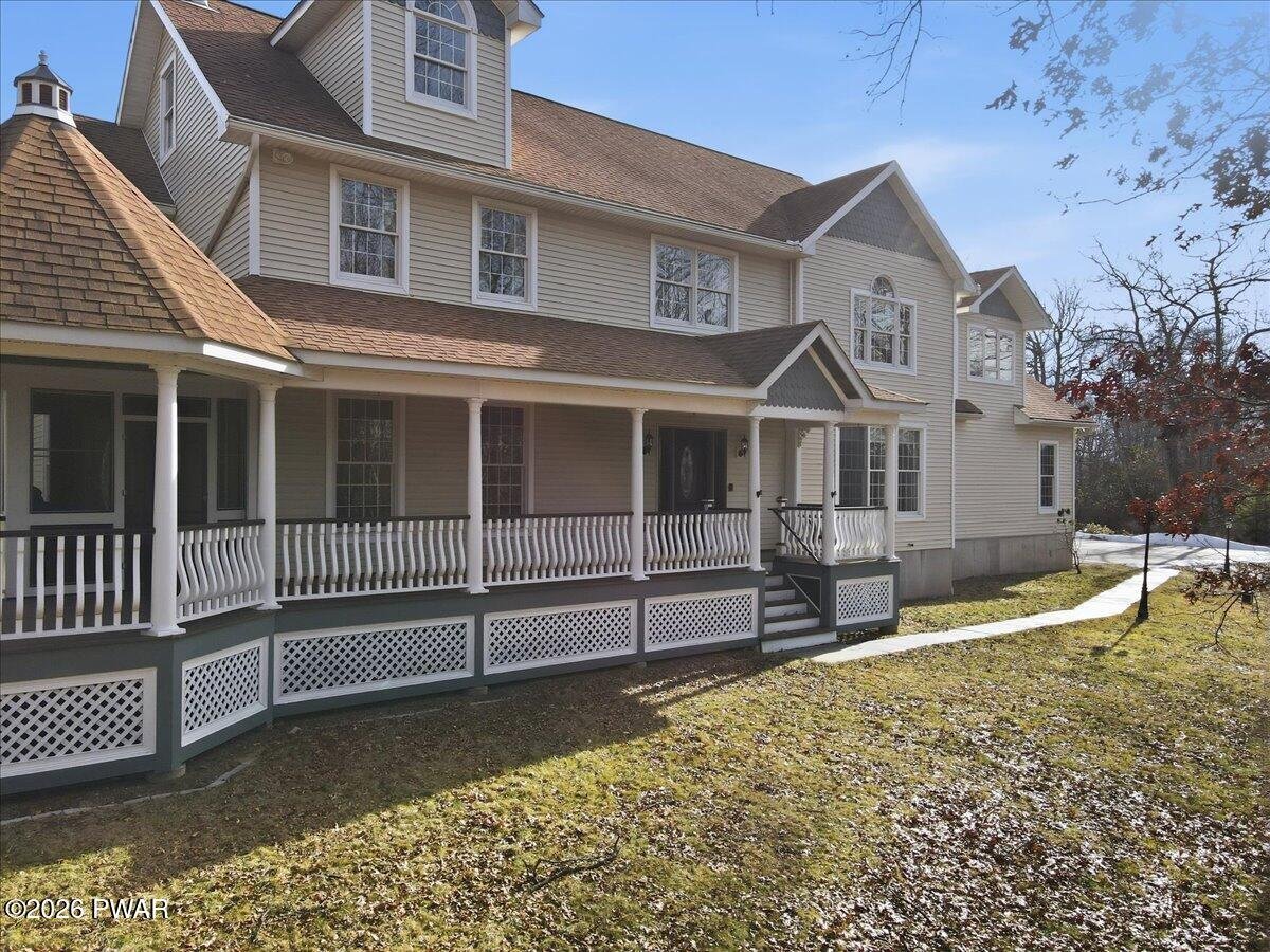 Privately set on 2.23 wooded acres, this custom-built home offers 4 bedrooms and 3 bathrooms, along with exceptional garage space including a three-car attached garage and an additional oversized RV bay. Built by a master builder, the home blends classic architectural character with well-planned systems, generous living space, and a setting that offers both privacy and flexibility.The home includes a finished basement with a stage and recording area, as well as a finished third-floor bonus room ideal for a home office, den, studio, or additional living space. The primary suite also features adjacent unfinished space, offering the opportunity to expand the suite or add a sitting area or storage. Wide-plank red oak hardwood floors, hand-stained on both sides, run through much of the home and are complemented by Andersen windows with peaceful wooded views.The main living area is centered around a Hearthstone Manchester wood stove capable of efficiently heating the home. Heating options include both a coal boiler and a propane boiler, providing flexibility and efficiency. Radiant heated floors enhance comfort in the kitchen and primary bath. Additional highlights include a whole-house generator and a newer central air conditioning system.Garage features include custom 12' x 12' swing doors on the RV bay designed to accommodate a 28-foot Class C RV, ceiling height suitable for a lift, and a paved driveway with ample parking.Outdoor living includes a screened side porch surrounded by mature hardwoods and seasonal wildlife. Despite the private setting, the home offers high-speed internet and reliable delivery service. The property is located within a private lake community offering a variety of amenities, providing the option to enjoy both peaceful seclusion and community recreation.(Some photos are virtually staged for illustrative purposes.)