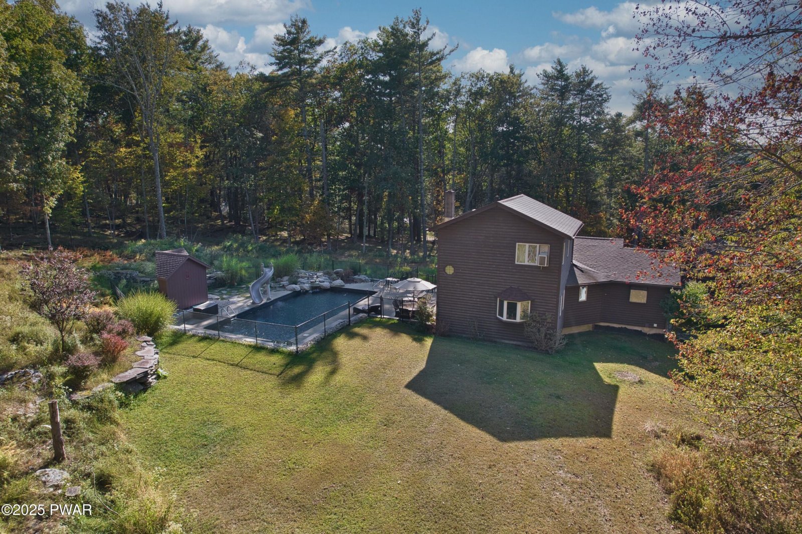 Welcome to a luxurious rustic retreat, where comfort and tranquility await at this vacation-inspired 1-acre country estate in desirable Shohola, PA. From the moment you arrive, the lush landscaping and meticulous care of this property will impress. Step outside to your own private resort, featuring a grand saltwater pool with stone waterfall, swimming slide, pool house shed, multi-tiered gardens, and a fully fenced-in design for privacy. An oversized two-story Gambrel-style garage offers ample space to showcase every toy or project, complemented by a large carport and custom chicken house with coop. Inside, the open floor plan shines with gleaming hardwood floors, a spacious living room with a gas fireplace, and a chef's kitchen with stainless steel smart appliances, granite countertops, gas stove, and tile flooring. The full dining room sets the stage for gatherings, while the private primary suite occupies its own floor for added seclusion. The fully finished lower level provides endless options, including a family or entertainment space, weight room, or home office. Perfectly situated just minutes from Historic Milford, Ski Big Bear, Lake Wallenpaupack, Route 6, and I-84, this home offers the best of Pocono living with no HOA and no dues. A rare opportunity to own a private, resort-style property in a prime location--this is one you won't want to miss!