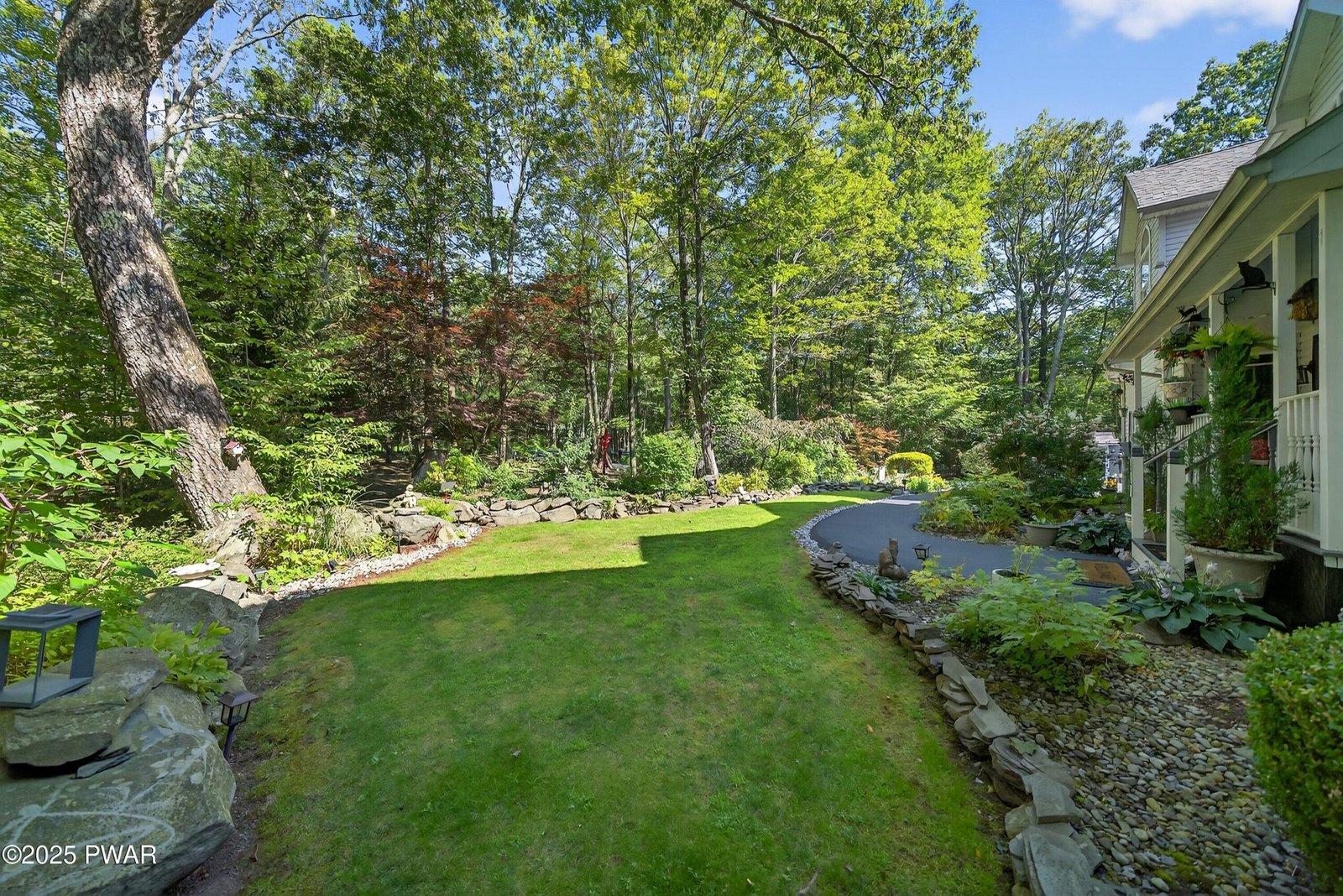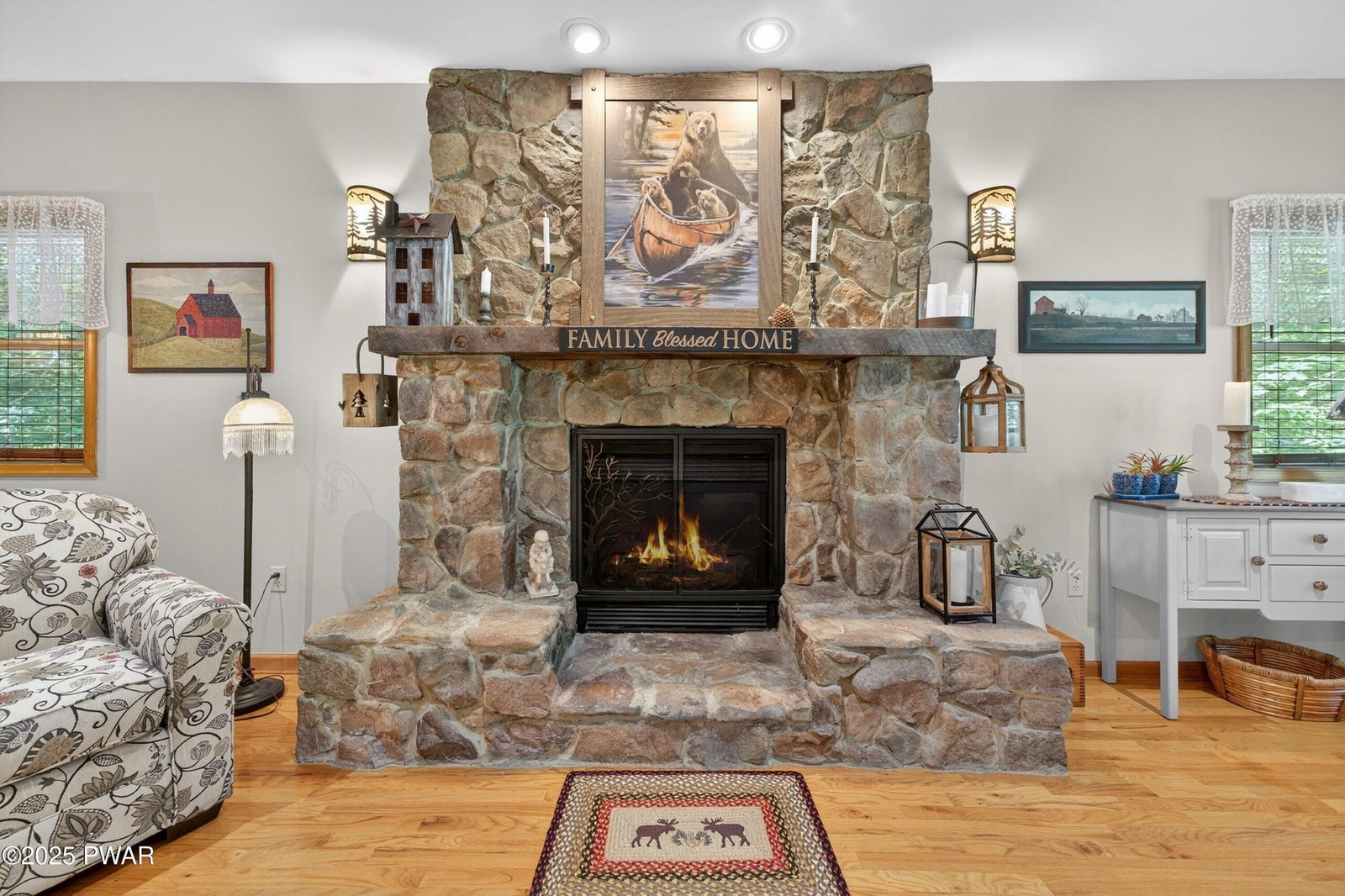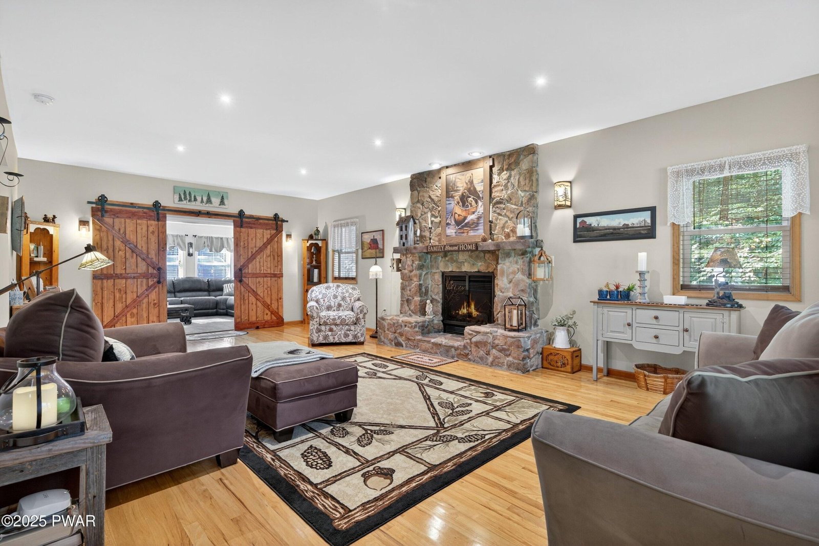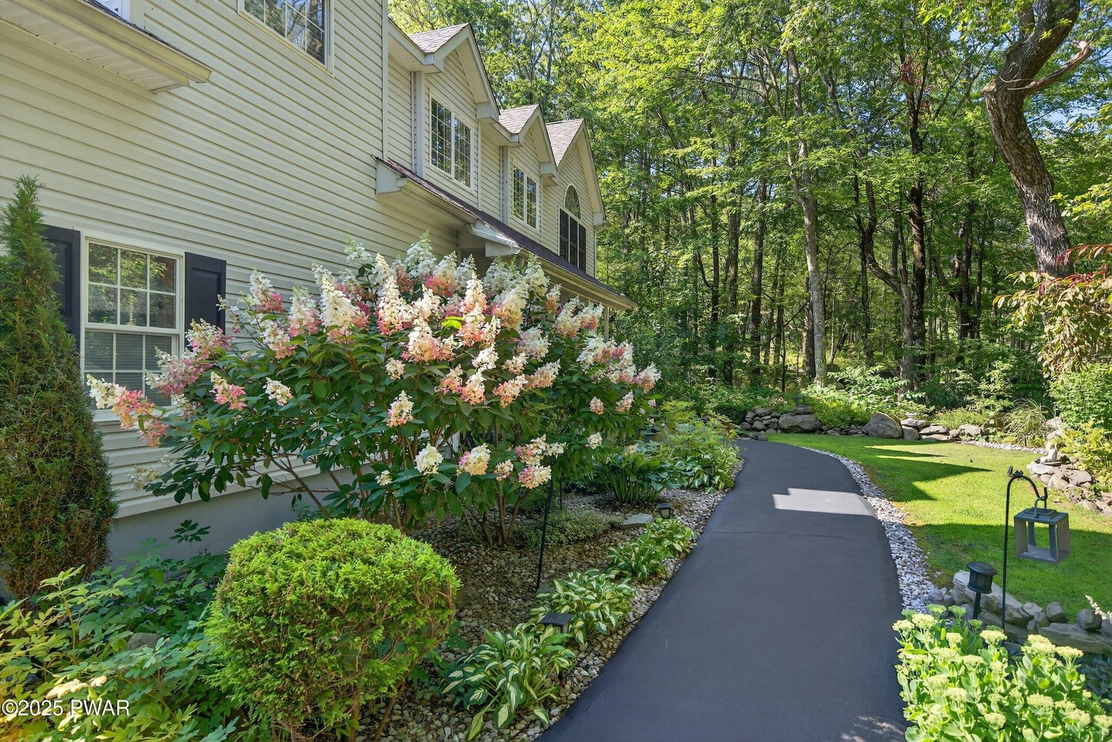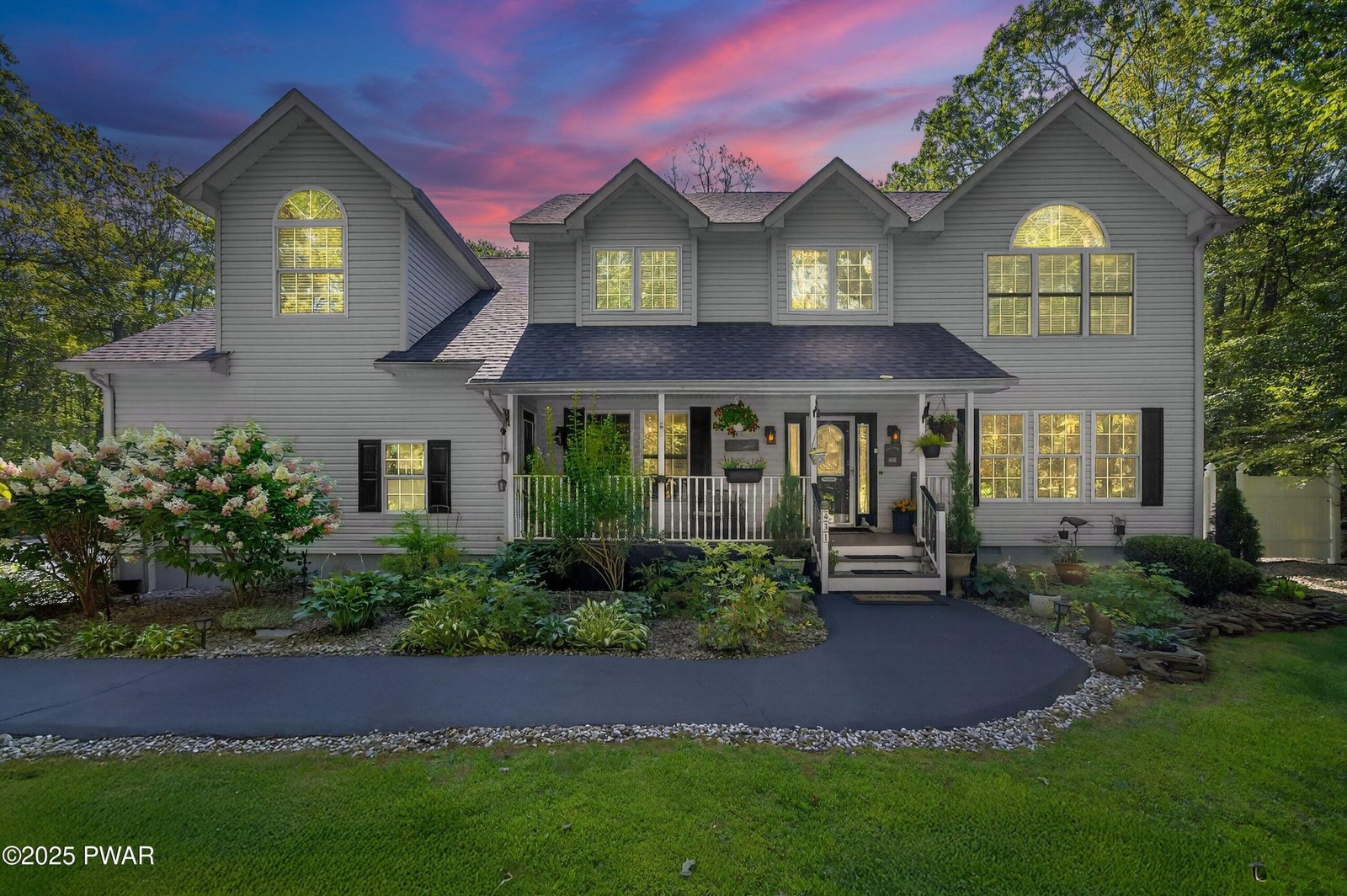 Elegant Hemlock Farms Retreat on a Double Lot Backing State Land. Beautifully maintained and updated 3 bd, 2.5 ba home in a gated community. New kitchen appliances, granite counters. Hardwood floors, high ceiling w/recessed lighting. Floor to ceiling stone fireplace in living room. Primary suite w/fireplace. Primary bath completely redone 2021. Over the two car garage bonus room w/pellet stove. Recent updates include a new roof, 2 zone HVAC and driveway sealing. Outdoors features include a private hot tub, paver patio with landscape lighting, landscaped double lot. Beautifully manicured summer gardens.