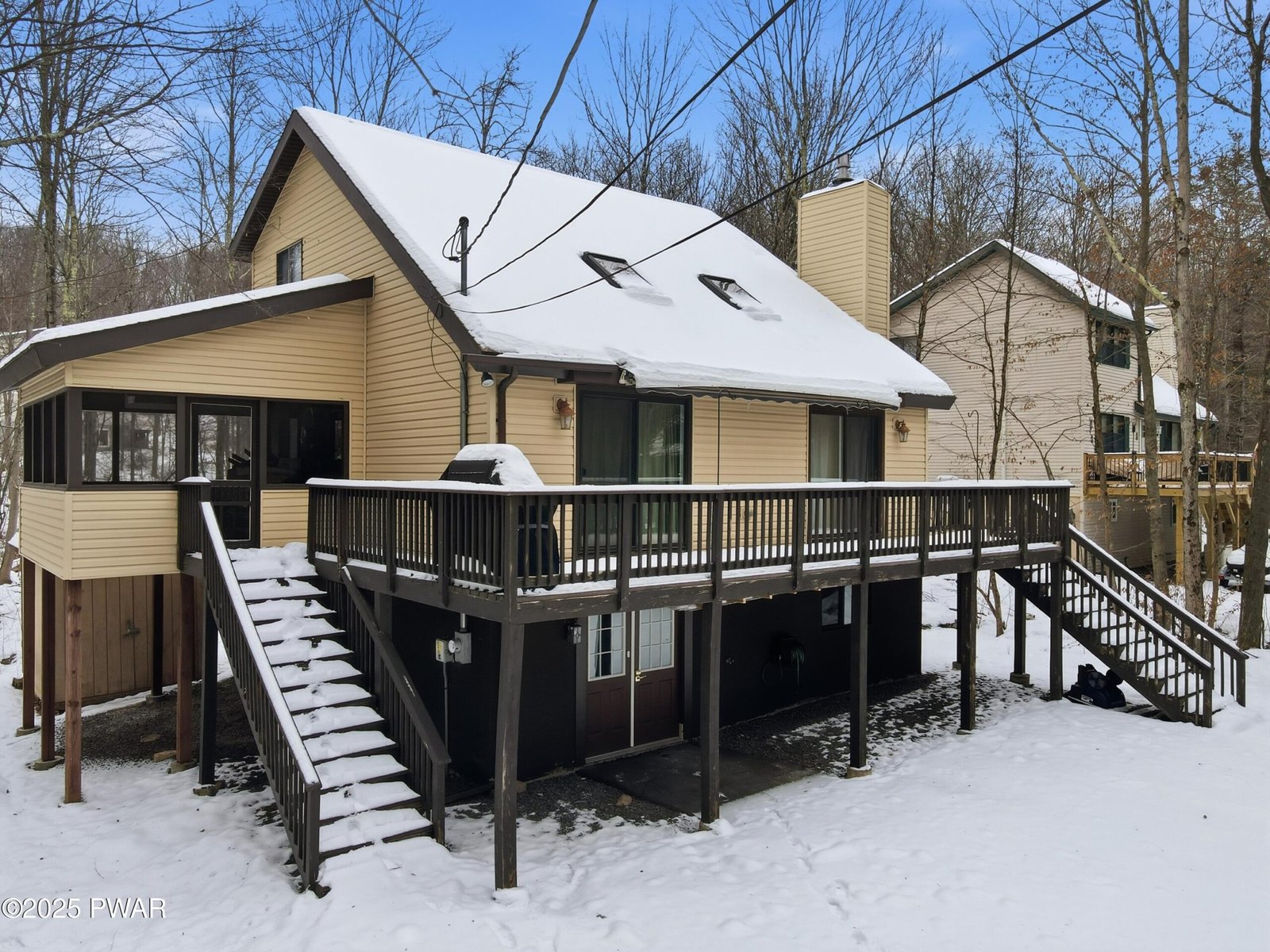 Welcome to an exceptional Pocono escape. This spacious five-bedroom, two-bath contemporary is tucked inside the sought-after, 24-hour gated community of The Hideout. Bright and welcoming throughout, the home strikes a perfect balance between comfort and style, making it ideal for everyday living, weekend retreats, or entertaining guests.The living room is the heart of the home, featuring soaring cathedral ceilings and a cozy fireplace that creates an inviting space to relax and gather. The upper level offers a private primary bedroom, an additional bedroom, and a full bath, providing a comfortable and convenient layout for owners and guests alike.On the main level, flexible living space allows for a home office, reading nook, or casual lounge area, while an additional bedroom and full bath offer easy accommodations for family and visitors.Outdoor living truly shines here. Enjoy time on the generous front deck or unwind in the screened patio, perfect for dining outdoors, hosting friends, or taking in peaceful evenings beneath the stars. The fully finished walk-out lower level expands the living space even further, featuring two additional bedrooms along with room for recreation, media, or storage.As part of The Hideout, residents enjoy an impressive lineup of resort-style amenities including a powerboat lake, beaches, heated outdoor pool, golf course, ski hill, fitness center, tennis and pickleball courts, mini golf, clubhouse, and year-round activities, all within a vibrant, amenity-rich community.This inviting woodland retreat offers space, flexibility, and lifestyle appeal, an excellent opportunity as a full-time residence, vacation getaway, or income-producing investment.All furnishings included !