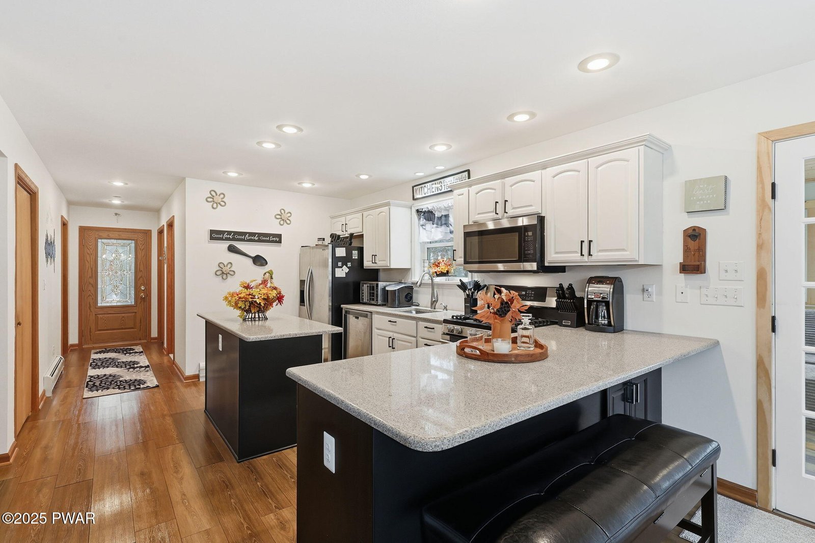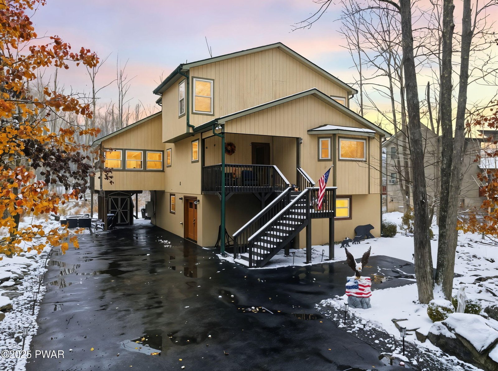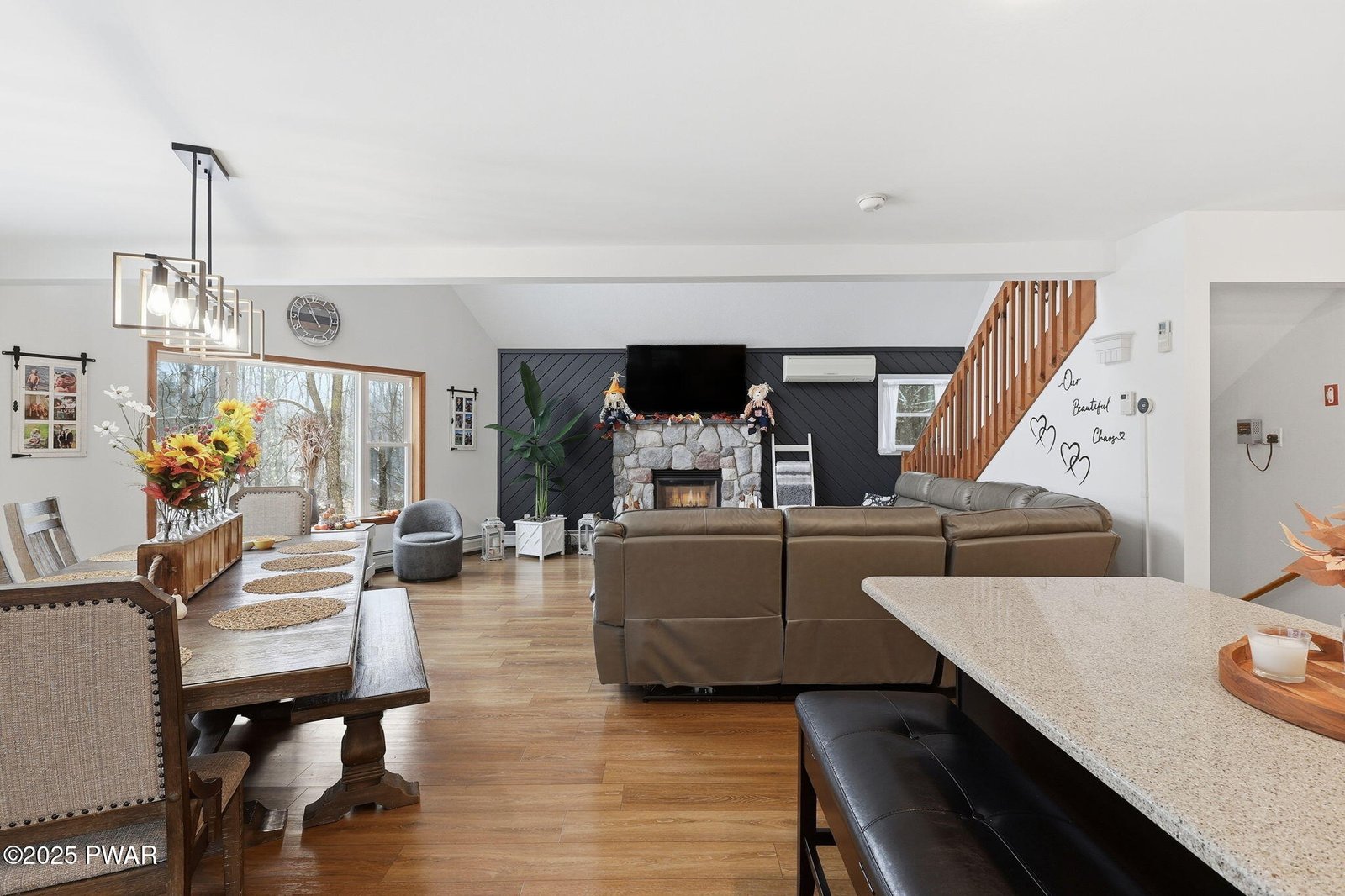 Welcome to this beautifully updated 4-bedroom, 3.5-bath home in the desirable Hideout community! The main level features a bright, open living area with vaulted ceilings and a stunning stone propane fireplace that creates the perfect cozy retreat. Large windows fill the space with natural light and offer peaceful wooded views. Enjoy the updated and heated sunroom for year-round relaxation or entertaining. The recently finished basement adds even more living space, featuring a spacious family room, an additional bedroom, and a full bathroom. Updates throughout the home make it the perfect place to unwind and enjoy the best of Poconos living. Located in a gated community offering lakes, beaches, pools, golf, and more!
