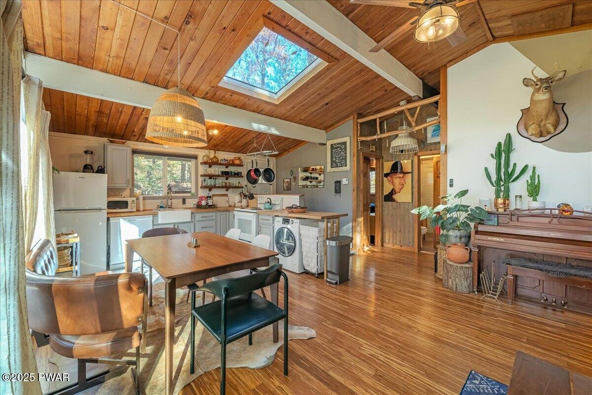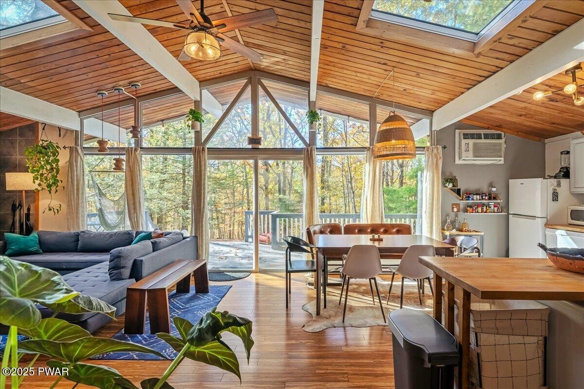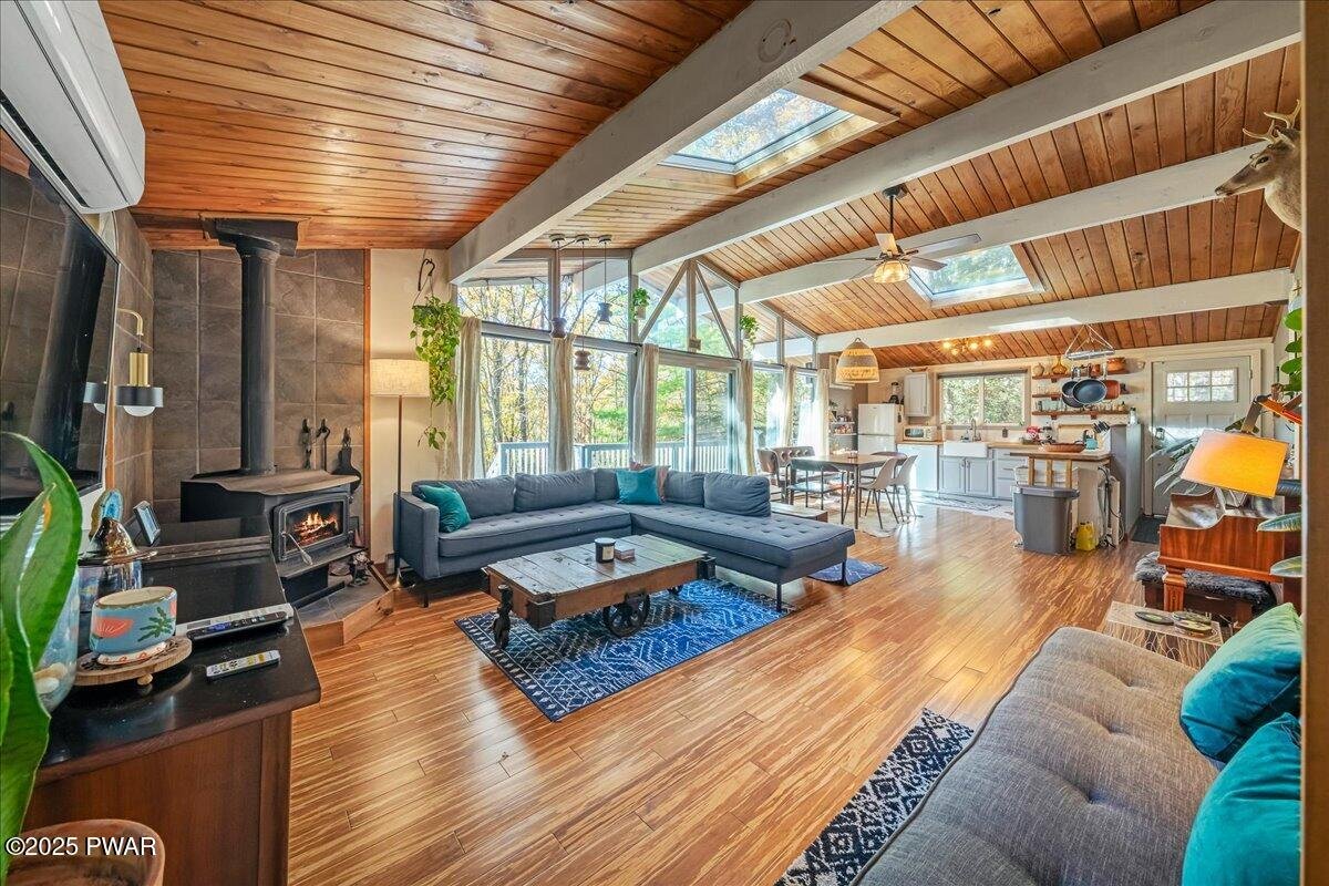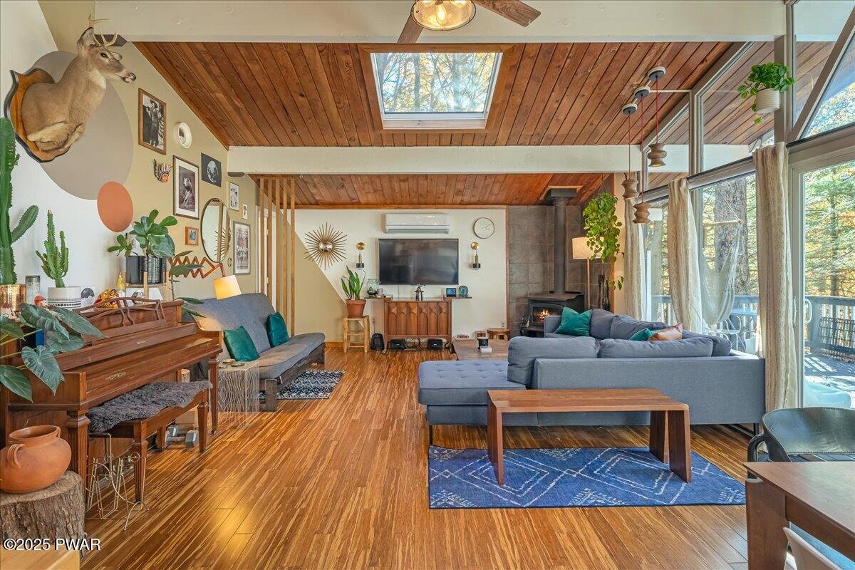 Welcome to Your Turn-Key STR-Friendly Modern Mountain Escape! Tucked among the trees, this beautifully designed, 3-bedroom ranch home perfectly blends mid-century warmth with contemporary comfort, creating a space that feels both inspiring and deeply relaxing. Inside, soaring wood-paneled ceilings, expansive windows, and skylights fill the open living area with natural light, while the wood-burning stove and warm finishes make every evening feel cozy and intimate. The stylish kitchen and dining area flow seamlessly to a spacious wraparound deck overlooking the forest, ideal for morning coffee, outdoor dining, or simply breathing in the fresh mountain air. Life in Winona Lakes offers the best of both worlds - peaceful seclusion and rich community amenities. Enjoy access to the stunning Bushkill Creek & multiple lakes for kayaking, fishing, and swimming, indoor and outdoor pools, tennis and basketball courts, and a clubhouse that hosts year-round activities. Whether you're seeking a full-time home, a weekend getaway, or a high-performing short-term rental, this property offers the flexibility and charm that make the Poconos lifestyle so special. Spend your days exploring nearby trails and attractions, then unwind by the firepit under a canopy of stars. In this home, every detail has been designed to elevate everyday living into a true mountain retreat experience. Don't wait - this is your chance to own a turnkey retreat where every day feels like a getaway!