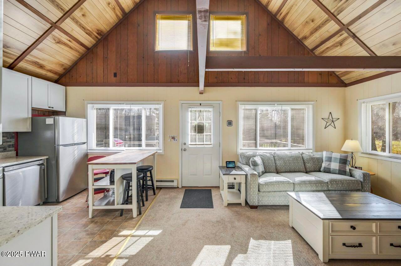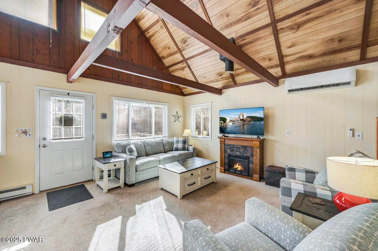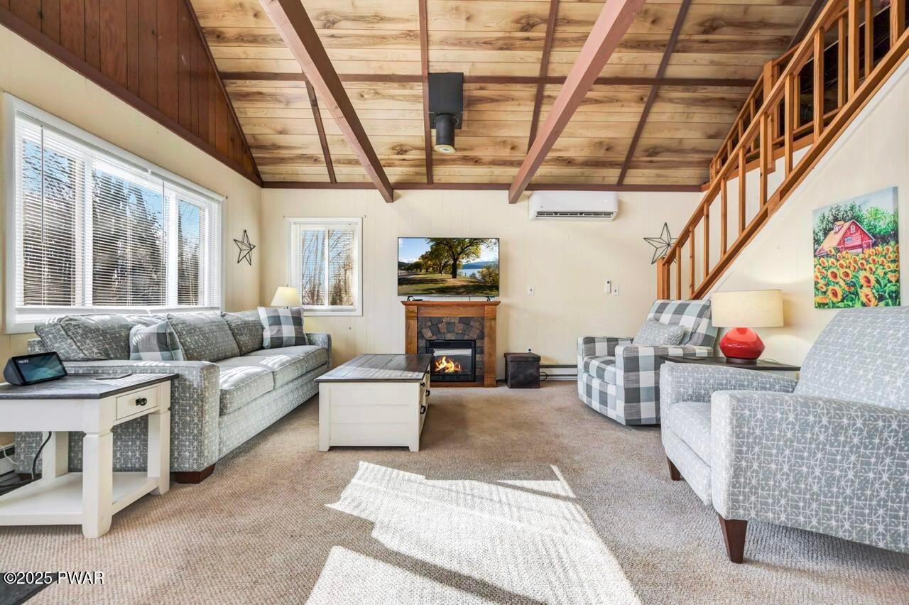 Escape to this charming chalet located in the Hideout a desirable gated four-seasons, amenity-rich community in the Northen Poconos-Just a few hours from NYC and Philly. This cozy retreat features vaulted ceilings and an open concept layout with a loft currently used as a third bedroom. The beautifully updated kitchen showcases granite countertops and stainless-steel appliances, while the refreshed bathroom adds a modern touch. A brand-new washer and dryer are also included for your convenience. Furnishings come with the home, making this property truly move in ready! Enjoy the outdoors on the deck or take advantage of the oversized flat lot with plenty of space for outdoor activities. A handy shed provides storage for all your gardening needs. The newer paved driveway and stone walkway add both curb appeal and functionality. Stay comfortable year-round with efficient mini-split heating and cooling. Whether you're looking for a low maintenance full time residence or relaxing weekend getaway, this scenic hideaway has everything for you to start enjoying Pocono living right away. The Hideout offers year-round fun and convenience with access to lakes and beaches, a golf course, fitness center, clubhouse with restaurant and bar, ski hill, pools, and 24-hour gated security.