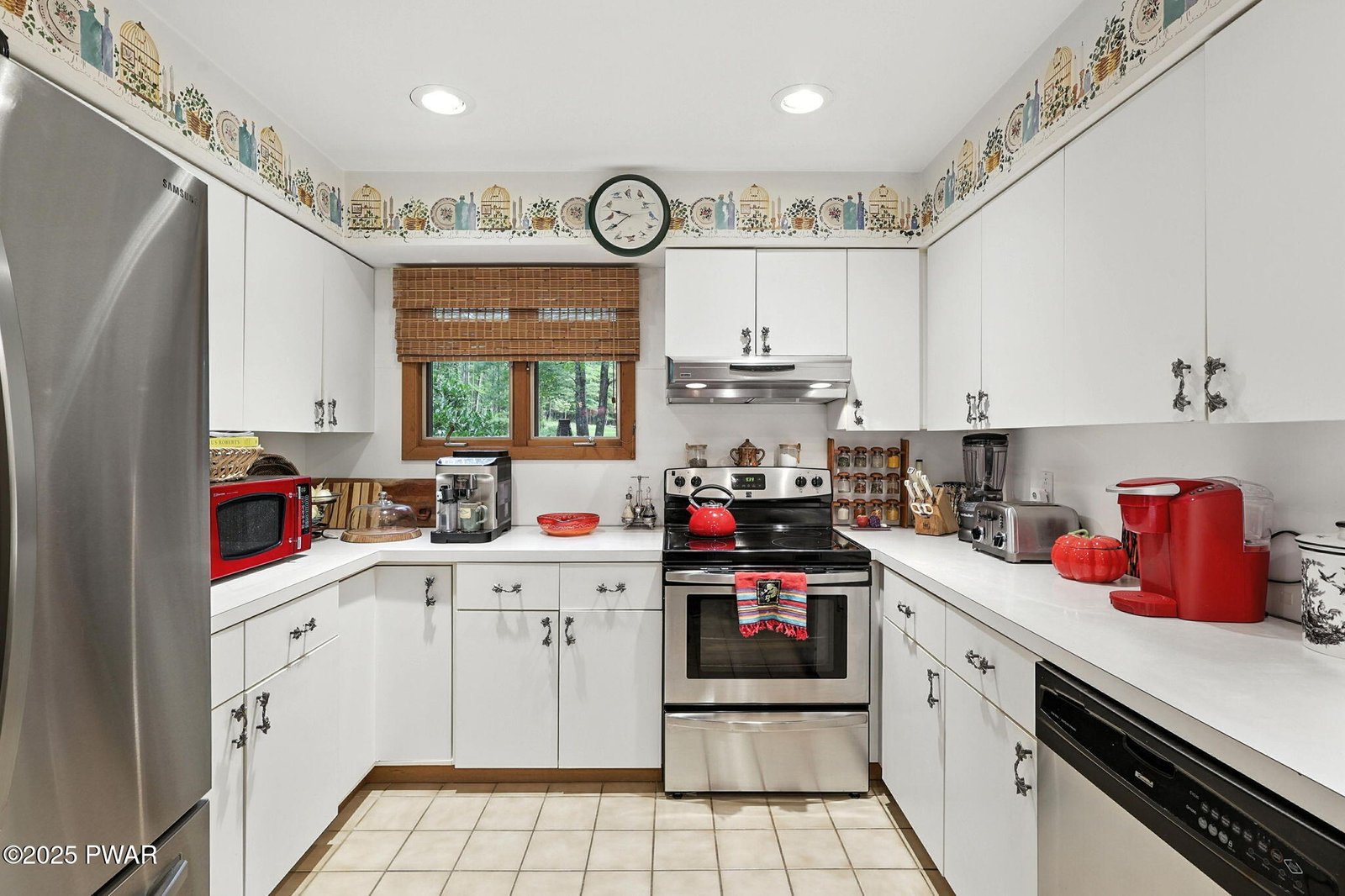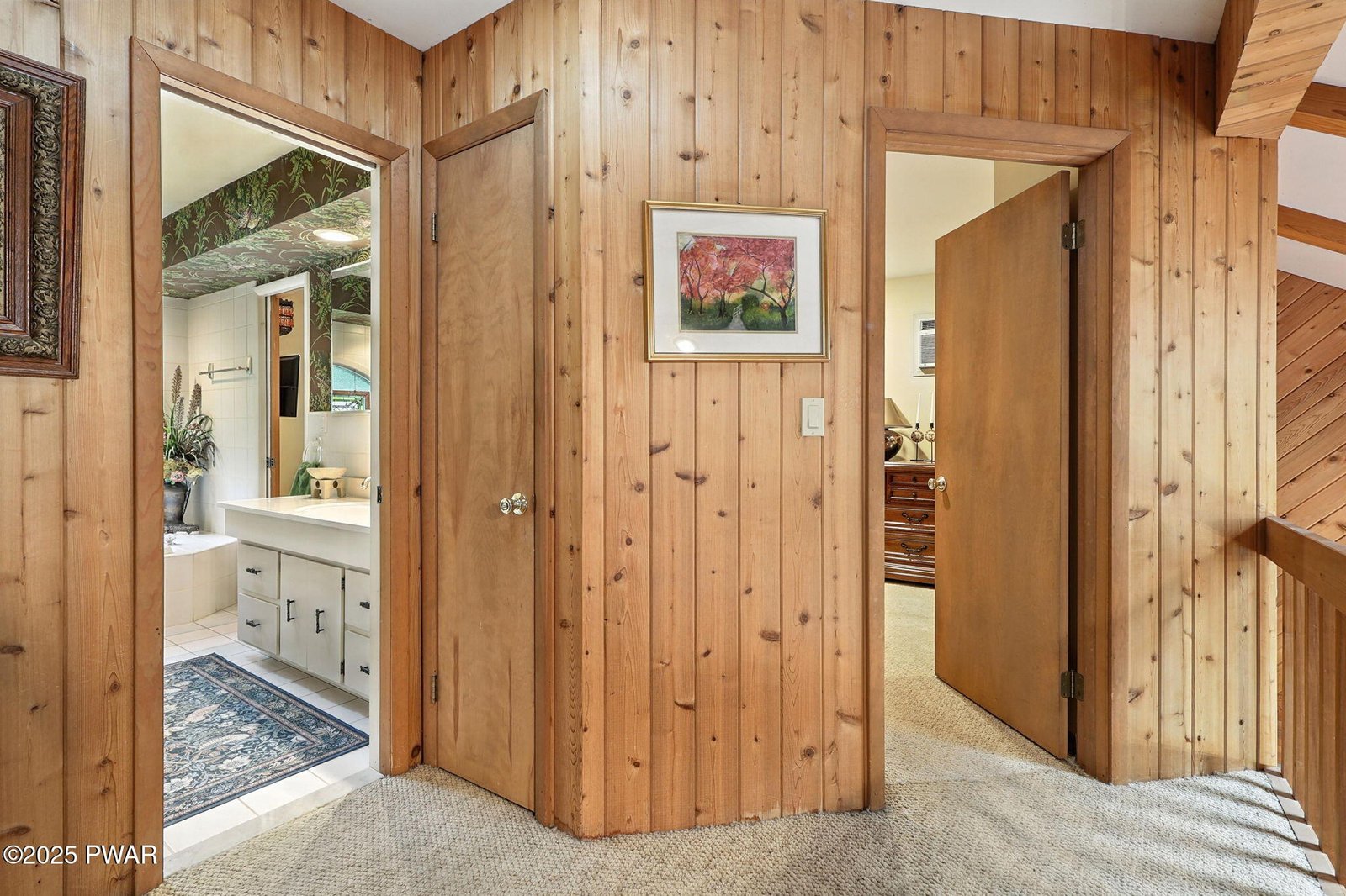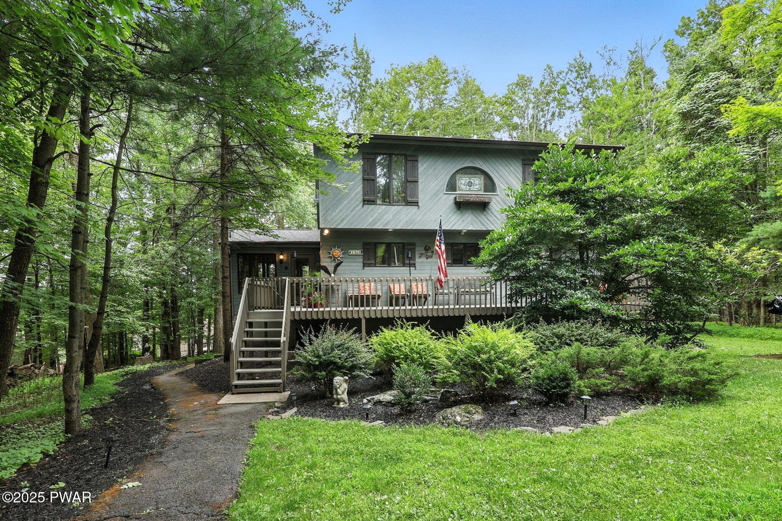 Welcome to this stunning Saltbox-style home nestled in the desirable community of The Hideout, offering a perfect blend of charm, functionality, and scenic beauty. This beautifully maintained residence features four spacious bedrooms and three bathrooms, providing ample space for family and guests. The versatile layout includes two flexible rooms that can easily be transformed into additional bedrooms, a home office, or guest accommodations, catering to your unique lifestyle needs. The finished basement boasts a panel-finished recreation room with a full bath, and it features a convenient walk-out, providing easy access to the backyard and enhancing the home's outdoor living potential. The main living areas showcase impressive beam and vaulted ceilings, adding architectural interest and a sense of spaciousness. Most rooms feature tongue-and-groove paneling, adding warmth and character, while all rooms are equipped with oversized windows that flood the space with natural light. Many rooms also have hardwood floors, enhancing the home's timeless appeal. The residence features two inviting fireplaces--one in the living room and another in the family room--serving as cozy focal points. Two bathrooms are fully tiled on the walls, offering durability and a sleek aesthetic. The primary bedroom features oversized mirrors on the closet doors, adding a touch of elegance and enhancing the sense of space. Enjoy the breathtaking Northeast Pennsylvania scenery from the expansive front and back decks, perfect for entertaining, outdoor dining, or relaxing while taking in the natural surroundings. The four-season room is adorned with exquisite cedar tongue-and-groove paneling, providing a charming space to enjoy the outdoors throughout the year. The beautifully landscaped yard further enhances the home's curb appeal, creating a peaceful retreat just moments from community amenities. This exceptional property combines timeless architecture with modern comforts and picturesque scenery.