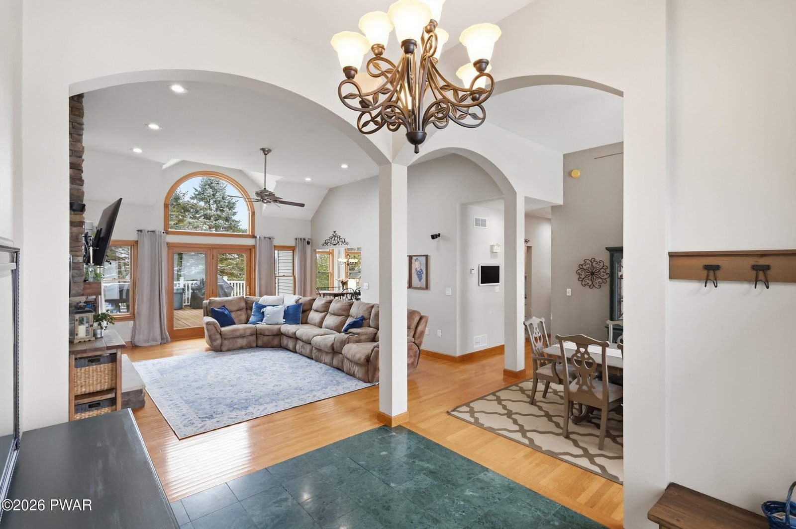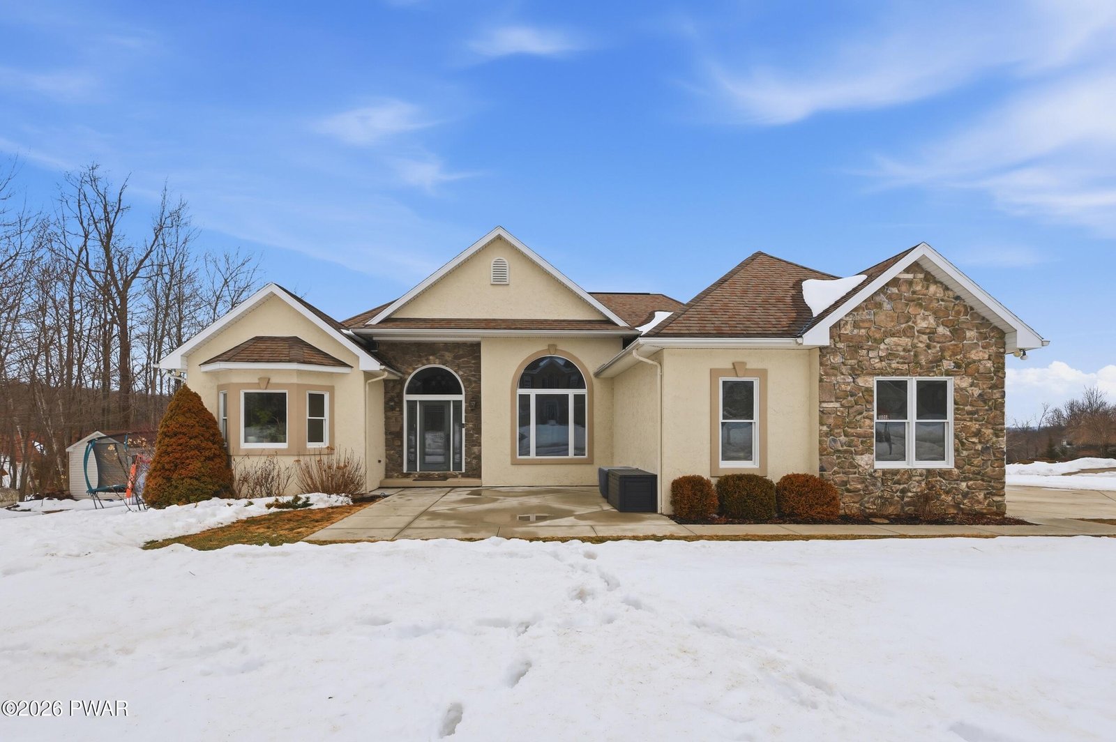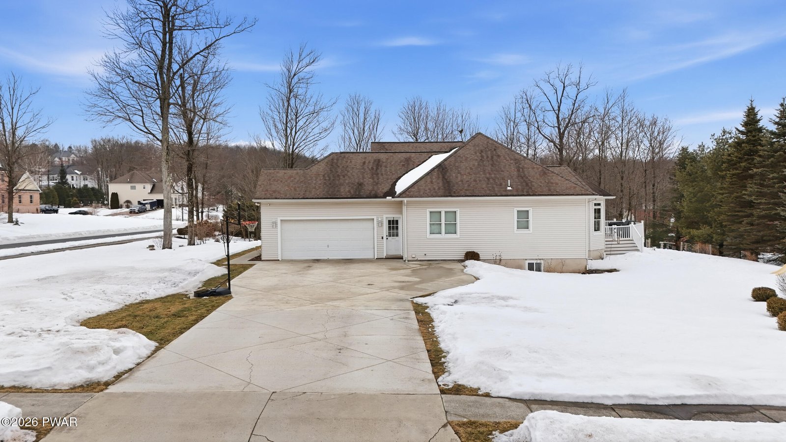 Rarely available ranch in Harmony Hills offering true one level living with a finished lower level and an exceptional layout. Vaulted ceilings and a remarkable amount of natural light define the main living areas. This well maintained and updated home features three bedrooms on the main level and three and a half bathrooms total.The open living and dining areas showcase hardwood floors and a pellet stove for added warmth and efficiency. The kitchen is designed for both everyday use and entertaining, featuring beautiful granite countertops, a large center island, a gas stove, and ample cabinet space. A bright kitchen nook provides additional dining space and is filled with natural light.A second pellet stove in the finished basement allows the lower level to function as comfortable additional living space year round.The primary bedroom includes a private en suite bathroom with a tub and updated walk in shower, along with a spacious walk in closet located in the bedroom. Two additional main level bedrooms share a Jack and Jill bathroom. Main level laundry adds everyday convenience.A newly renovated office with built in his and her desks provides a dedicated work from home or flex space.The finished basement significantly expands the home's living space and includes two additional sleeping areas, a full bathroom, and a wet bar with granite countertops, ideal for entertaining or guest use.Situated on a flat corner lot with usable yard space on all sides. The concrete driveway was redone within the last two years. Outdoor features include a front patio and a large Trex deck off the living room overlooking the backyard and garden area.Conveniently located with easy access to major highways, shopping, dining, and nearby Scranton and Dickson City.