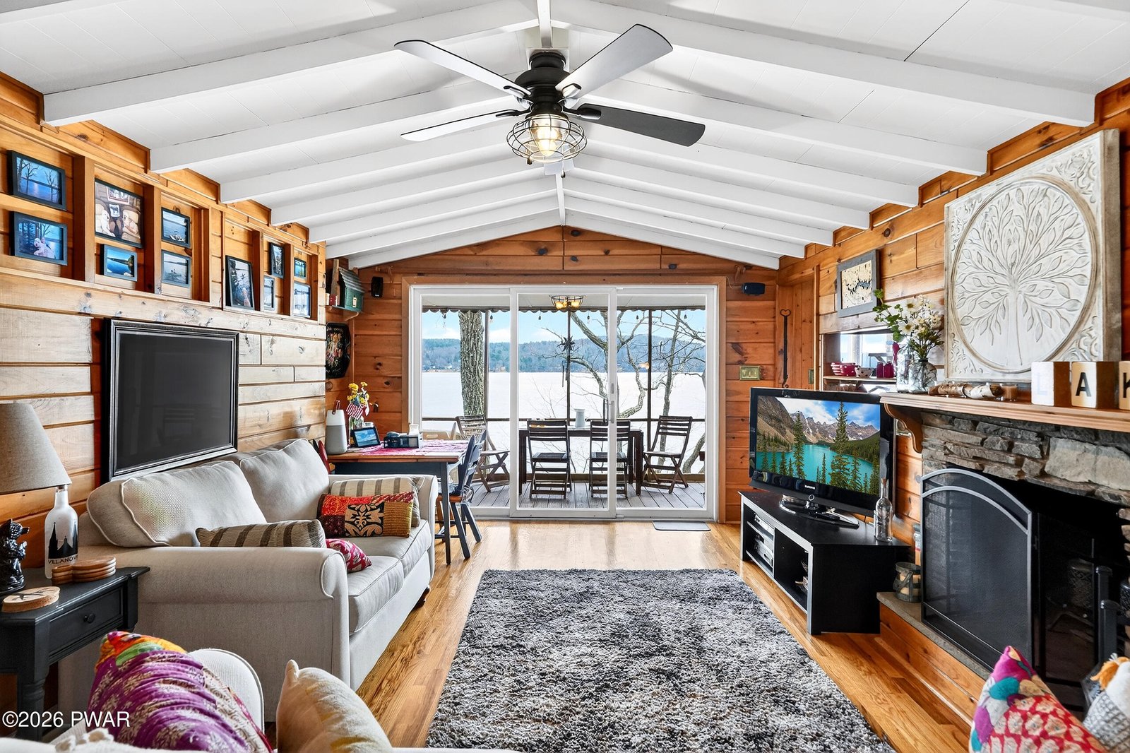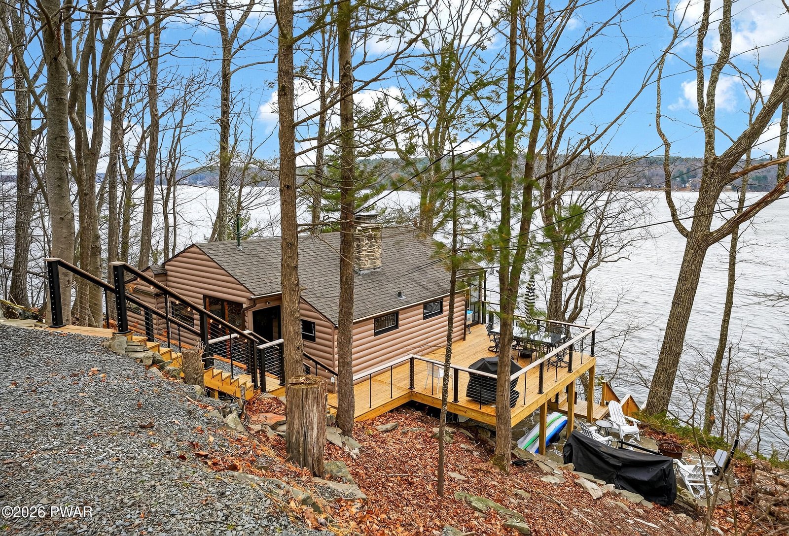 Tucked away at the very end of a quiet cul-de-sac in upscale Briar Hill South community, this quintessential Gumble-style WALLENPAUPACK LAKEFRONT home offers the privacy, scenery, and lake-charm with modern updates. 62 E Lakeside Drive is truly what Pocono lake living is all about! With breathtaking year-round lake views from nearly every angle, this is the retreat you've been waiting for.The main level is warm and inviting, featuring two bedrooms, a full bathroom, a rustic living room with stone faced fireplace, and a modern kitchen. The highlights include the screened porch, and brand new deck. Whether you're sipping your morning coffee or watching the sun dip below the lake at dusk, this porch will quickly become your favorite room in the house.Head downstairs to discover a surprisingly spacious lower level complete with a generous primary bedroom suite, a beautifully updated bathroom, a dedicated laundry area, and ample storage. A private walkout opens directly to a covered patio beneath the screened porch -- the perfect spot to relax in the shade or fire up the grill after a day on the water.Outside, everything has been done for you. A brand-new deck and brand-new retaining wall anchor a freshly landscaped yard that leads down to your very own private boat dock for deal for motorboats, pontoons, fishing, or swimming right from your own backyard. The cul-de-sac location ensures minimal traffic and maximum tranquility; you'll feel miles away from the world even though you're not.Offered mostly furnished (negotiable), this turnkey cottage is ready to enjoy from day one, whether as a full-time residence, weekend vacation getaway, or investment property. Properties with this combination of privacy, direct lake access, and move-in condition are rare. Don't let this one get away!