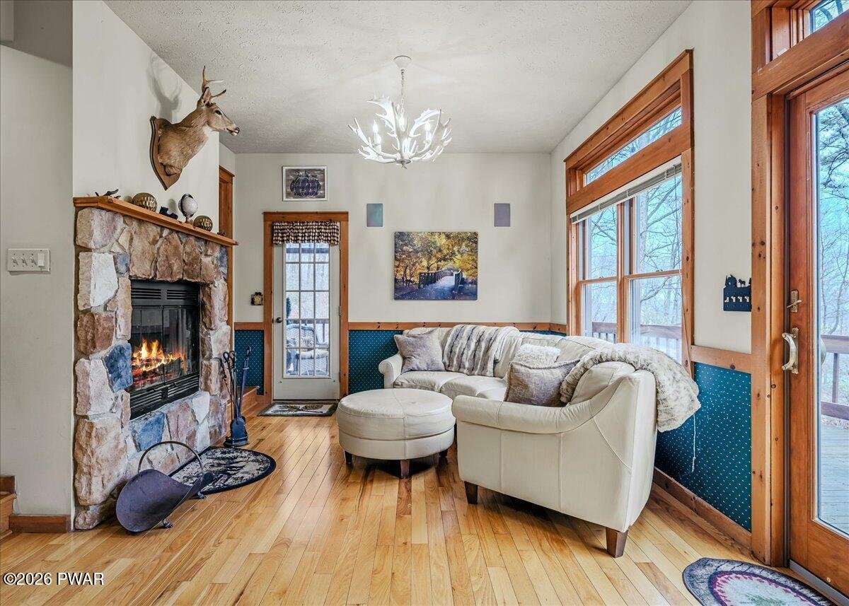 Welcome to your Pocono Mountain dream escape on Camelback Mountain, where adventure, relaxation, and unforgettable memories come together for year-round fun. Set on a private, wooded lot, this classic mountain home with distinctive country charm instantly delivers that ''you're on vacation'' feeling the moment you arrive. An inviting front porch brings you inside to a bright, open main level filled with natural light, hardwood floors, and a stunning stone fireplace that anchors the living space and creates the perfect apres-ski gathering spot. The open living and dining areas flow effortlessly to a sprawling deck overlooking ski slopes in winter. The kitchen offers generous cabinet and granite counter space and connects seamlessly to the heart of the home, making entertaining easy. Multiple bedrooms provide flexibility for guests, or work-from-home needs, including a spacious Primary Suite with a cozy fireplace and a Second Suite with its own full bath. The fun continues downstairs with a large recreation room designed for game nights, movies, and entertaining, plus walk-out access to the covered Hot Tub, patio and flat yard. The landscaping includes PA bluestone slab staircases and natural and native foliage creating a private mountain retreat you'll love in every season. Camelback Mountain is a proven vacation destination and enjoys close proximity to Mount Airy Casino, Crossings Outlets and all the go-to restaurants making this property an exceptional opportunity. The home does have Short Term Rental history and best of all, comes completely Turn Key! Just bring your suitcase and groceries and you're all set! This is Pocono living at its absolute best - don't miss it.